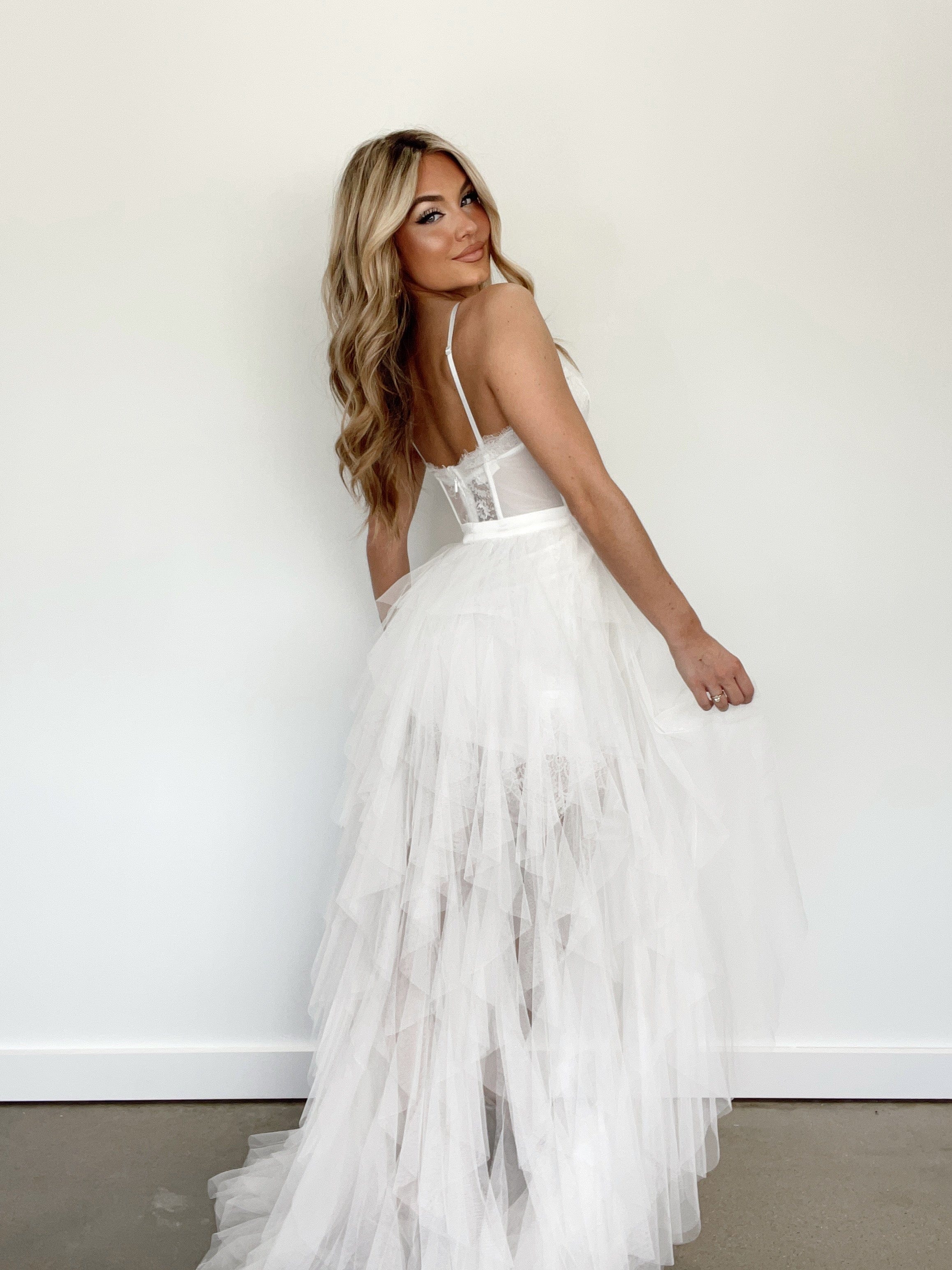 Capture all the attention in this romantic maxi dress. The Eternal Love dress exudes elegance and grace with a unique layered look that includes a soft inner layer, delicate lace under layer, bodycon style, and a cascading tulle overlay. Features include corset top detail, adjustable straps, a dramatic front slit, and a sweetheart neckline. Perfect for all of your special occasions, this statement dress will have you feeling beautiful all wedding season.