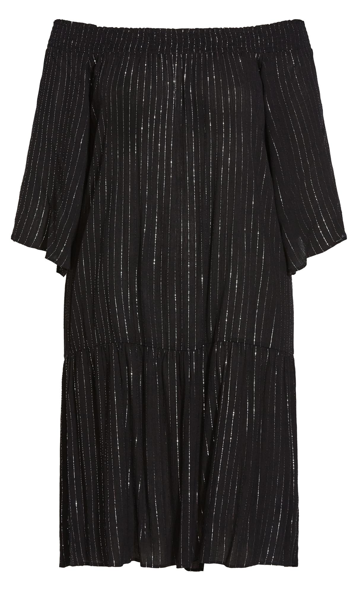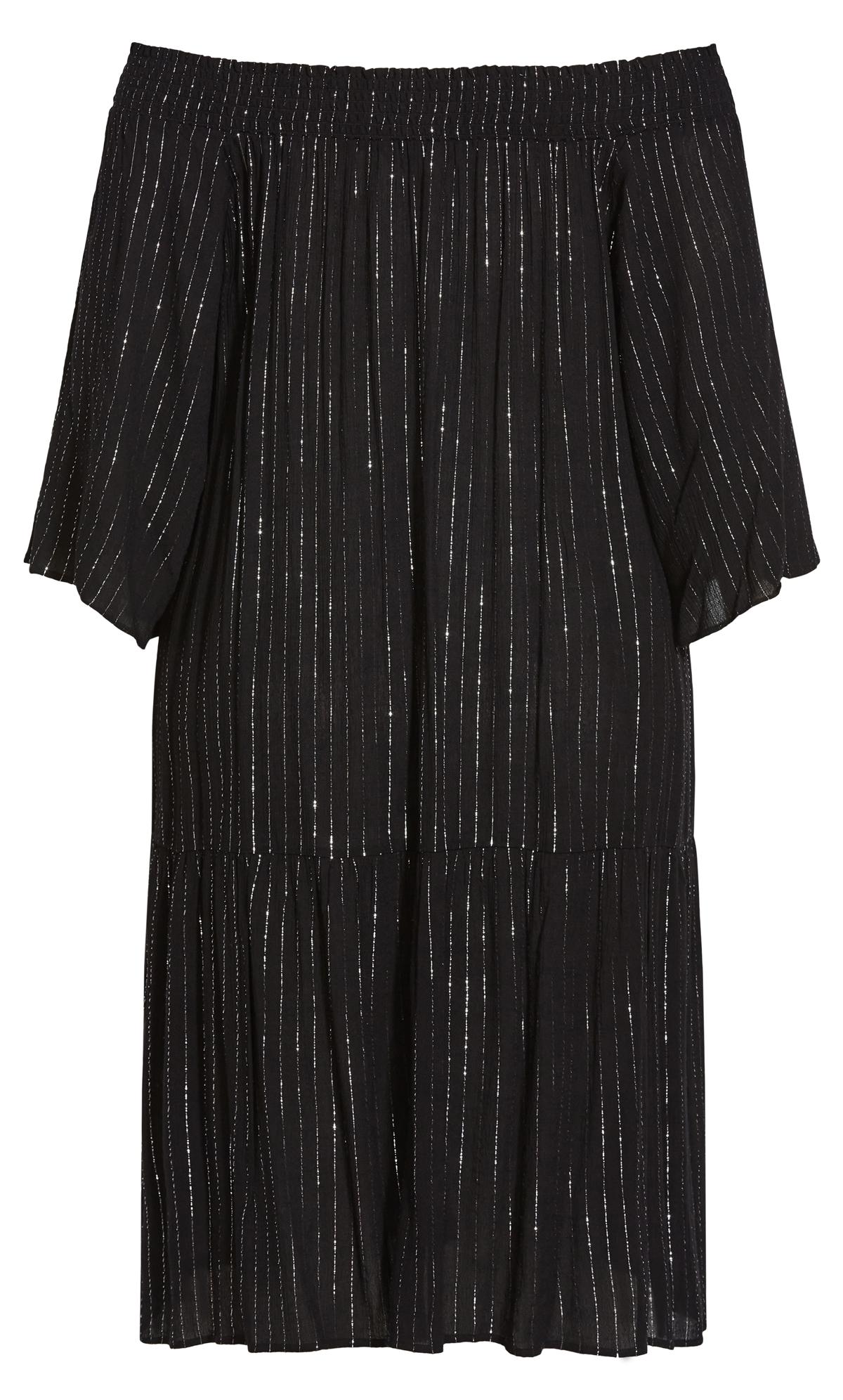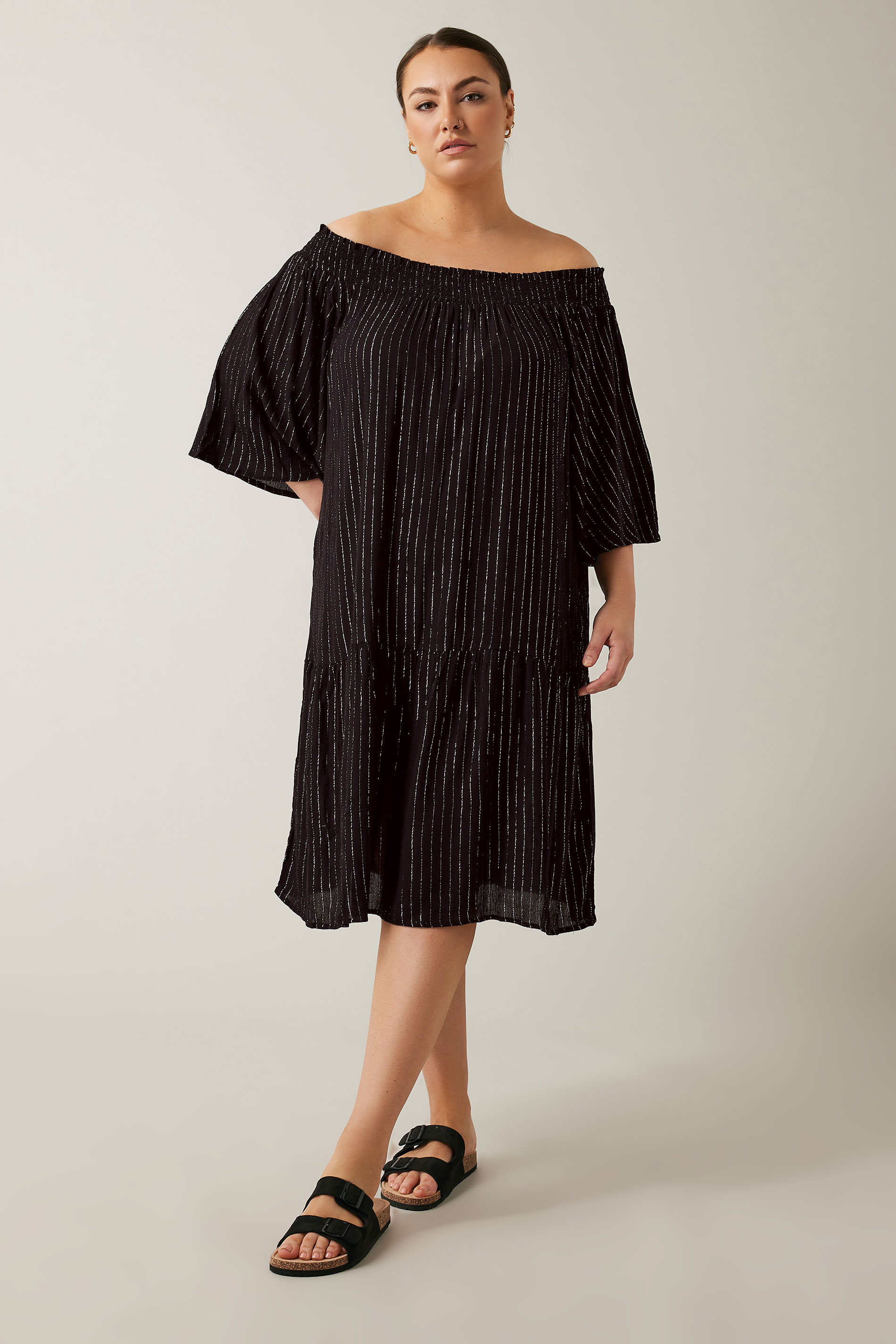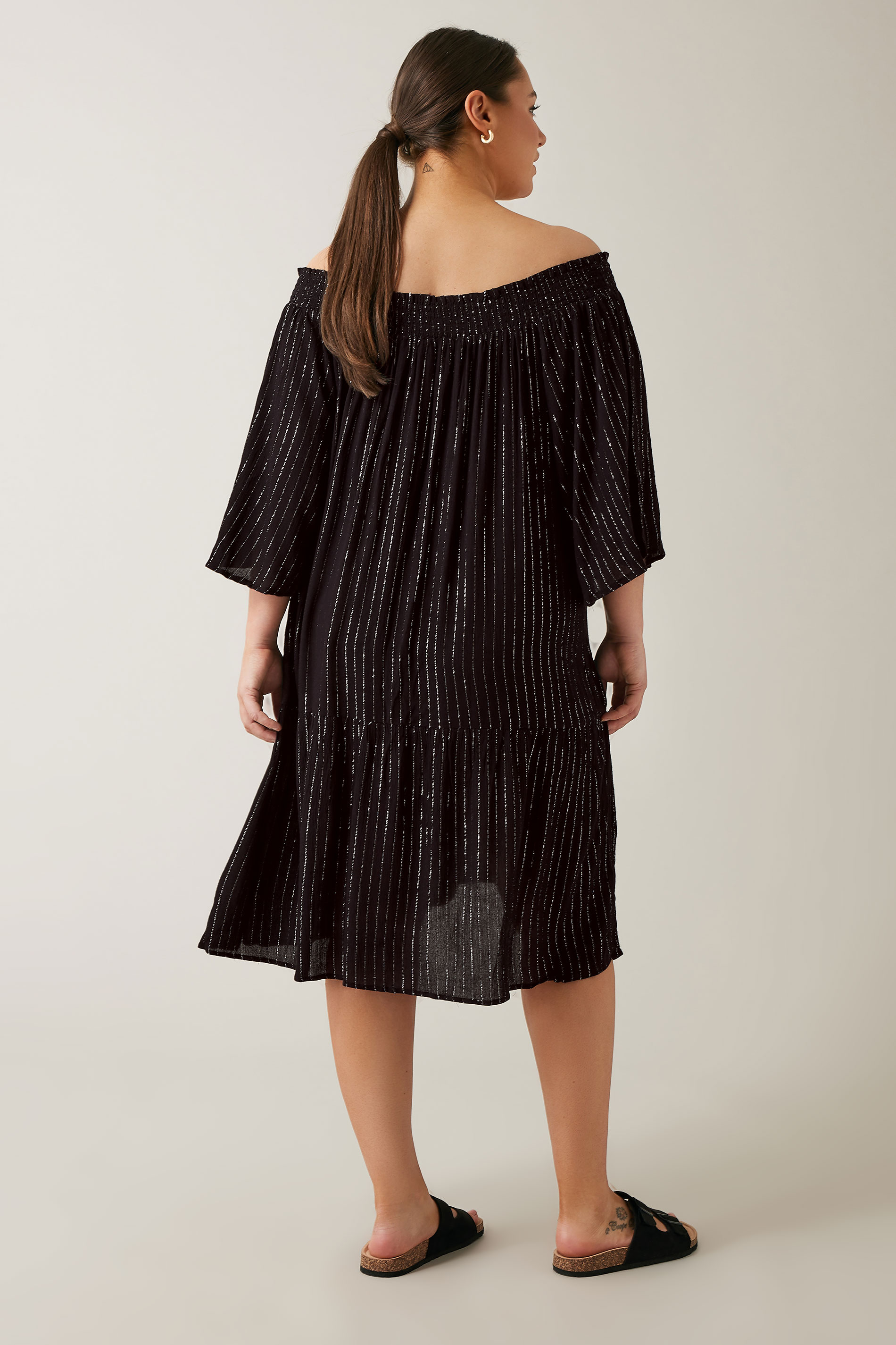 Elevate your beach style with our stunning Evans Black Metallic Stripe Tiered Midi Beach Dress. Crafted with the finest materials and designed for both comfort and elegance, this dress effortlessly combines sophistication with a touch of shimmer. Embrace the allure of the seaside while making a statement in this must-have addition to your summer wardrobe.