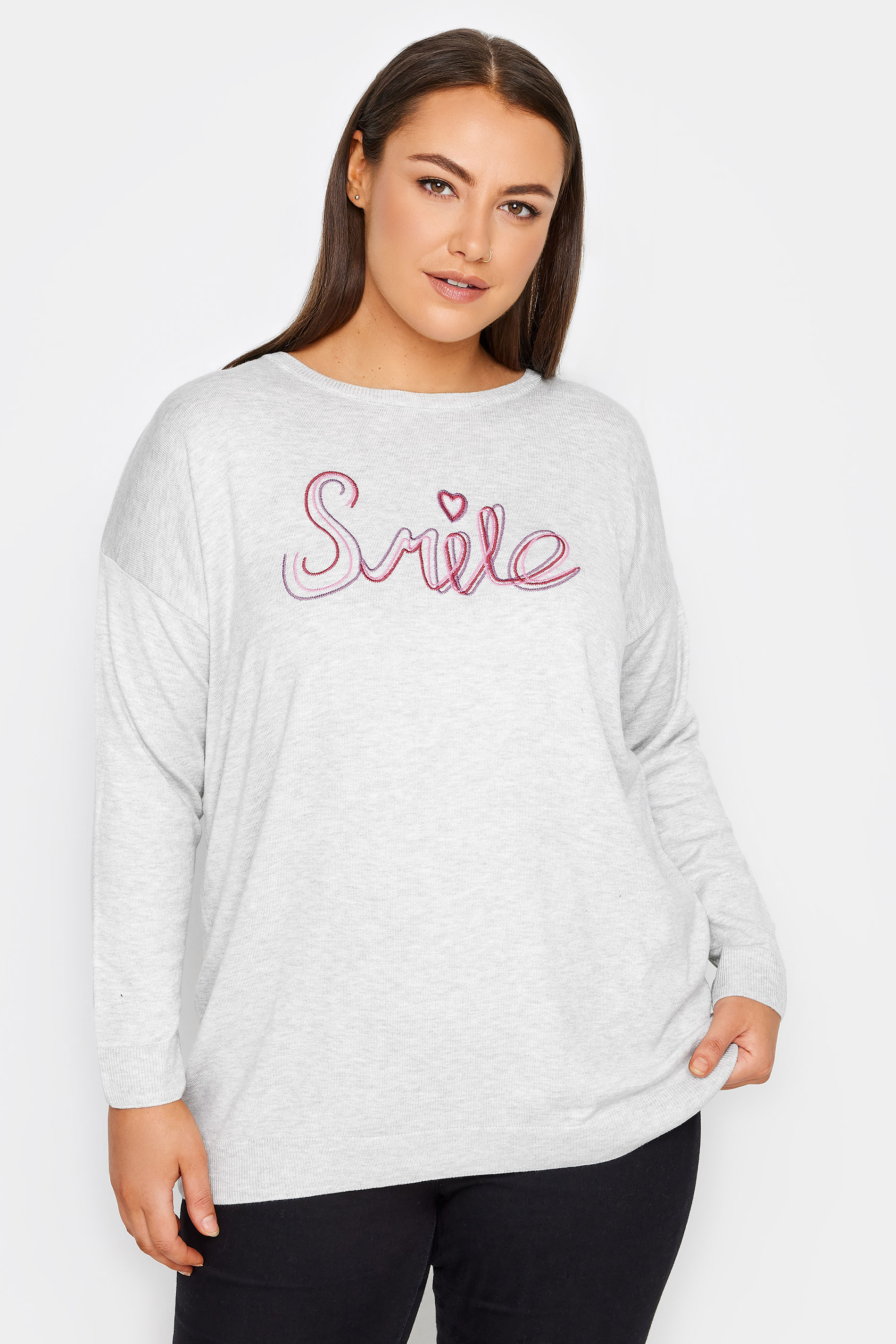 Introducing the Evans Grey 'Smile' Slogan Jumper – a laid-back and cosy essential for your wardrobe. This stylish grey jumper effortlessly adds a touch of positivity without compromising comfort. Ideal for casual occasions, it's the perfect blend of comfort and subtle expression for your everyday style.