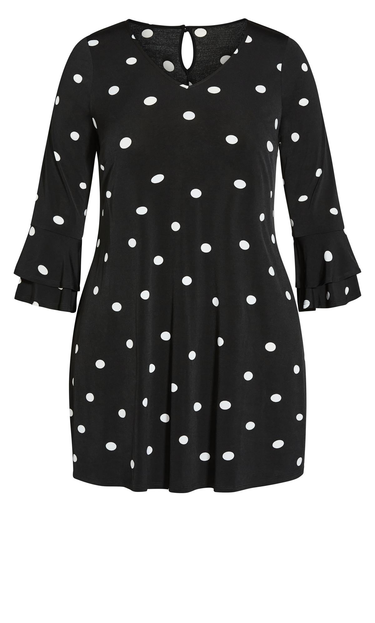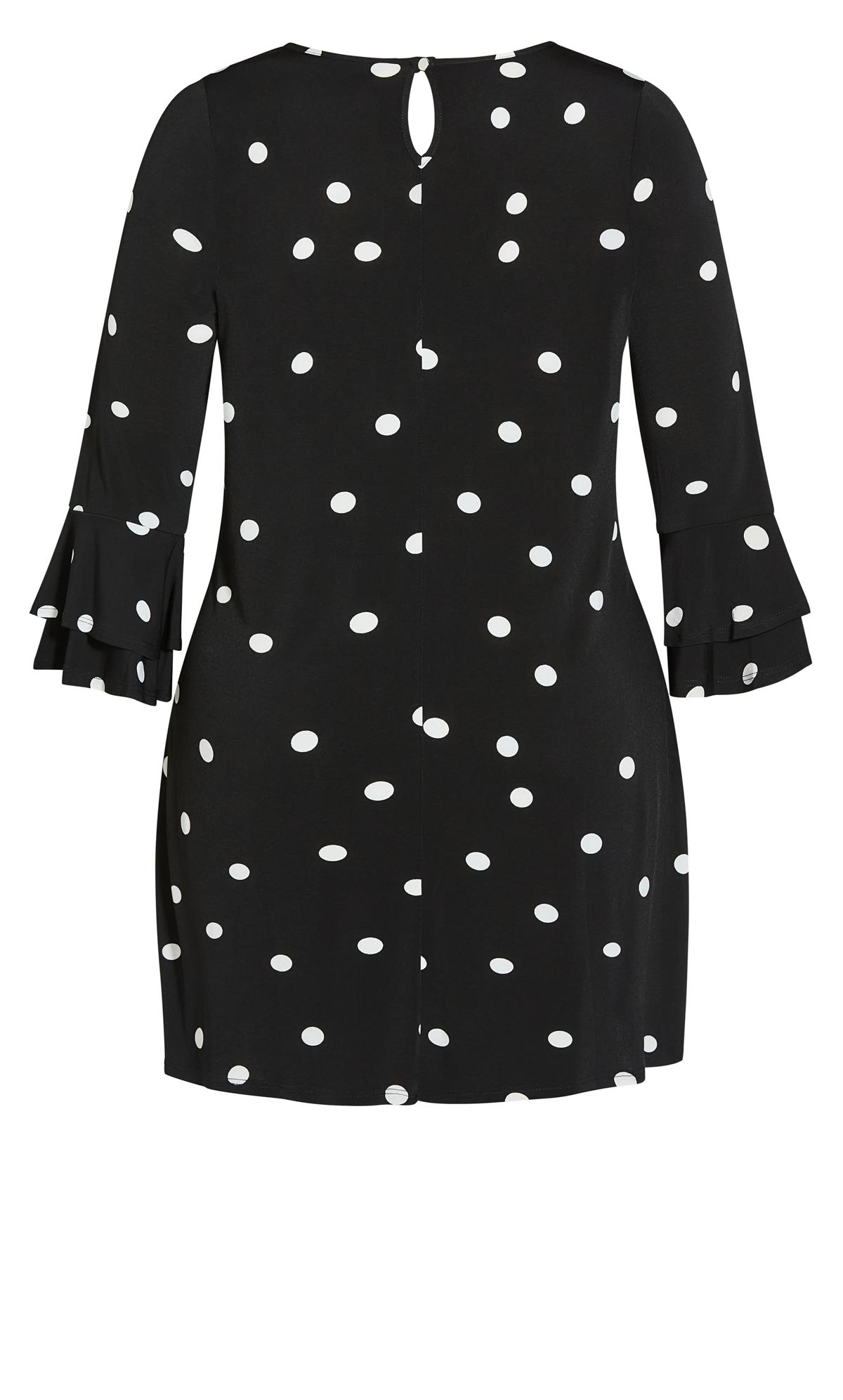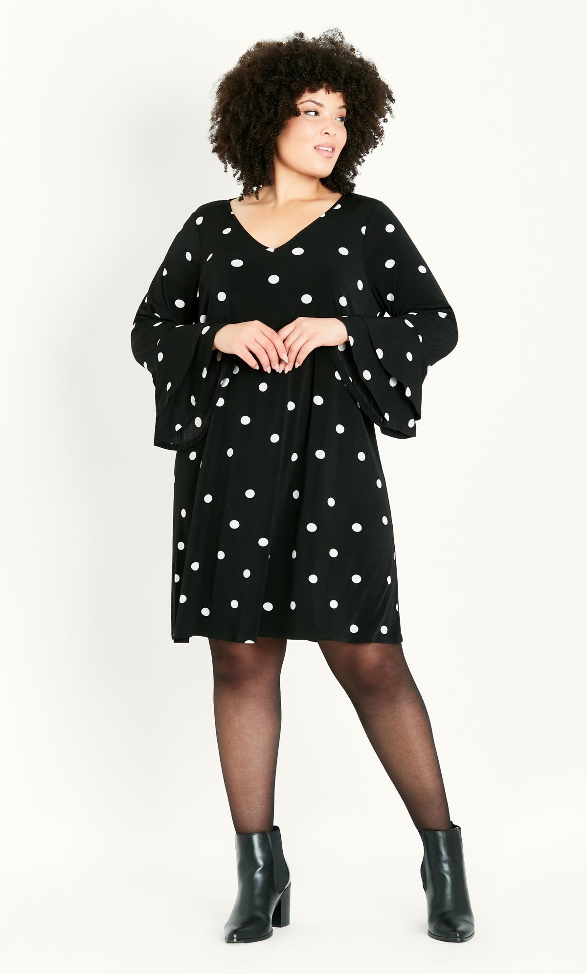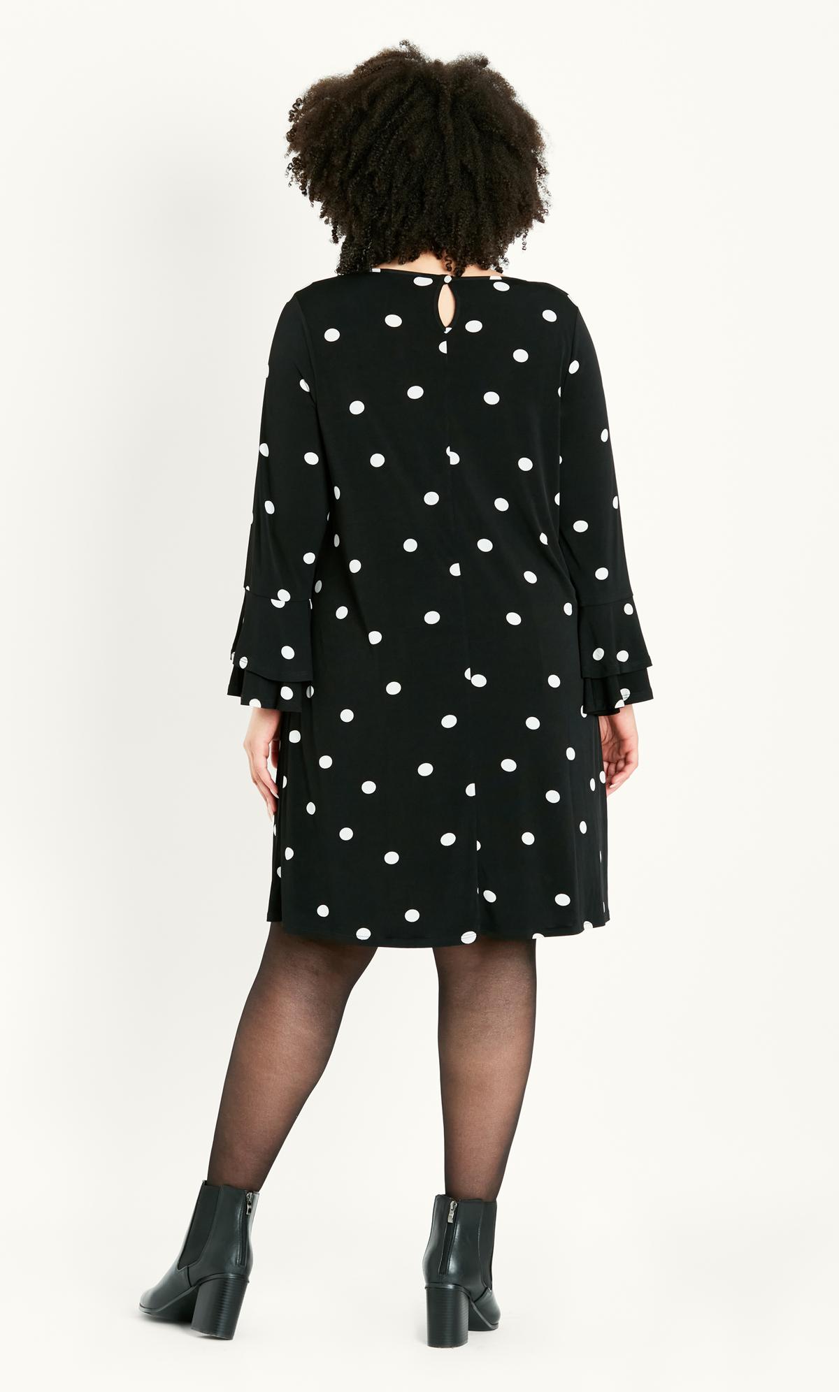 Step out in style with our Frill Sleeve Print Dress! Get heads turning with the chic bell sleeves with ruffle detailing and eye-catching spot print. The relaxed fit complements your curves effortlessly.