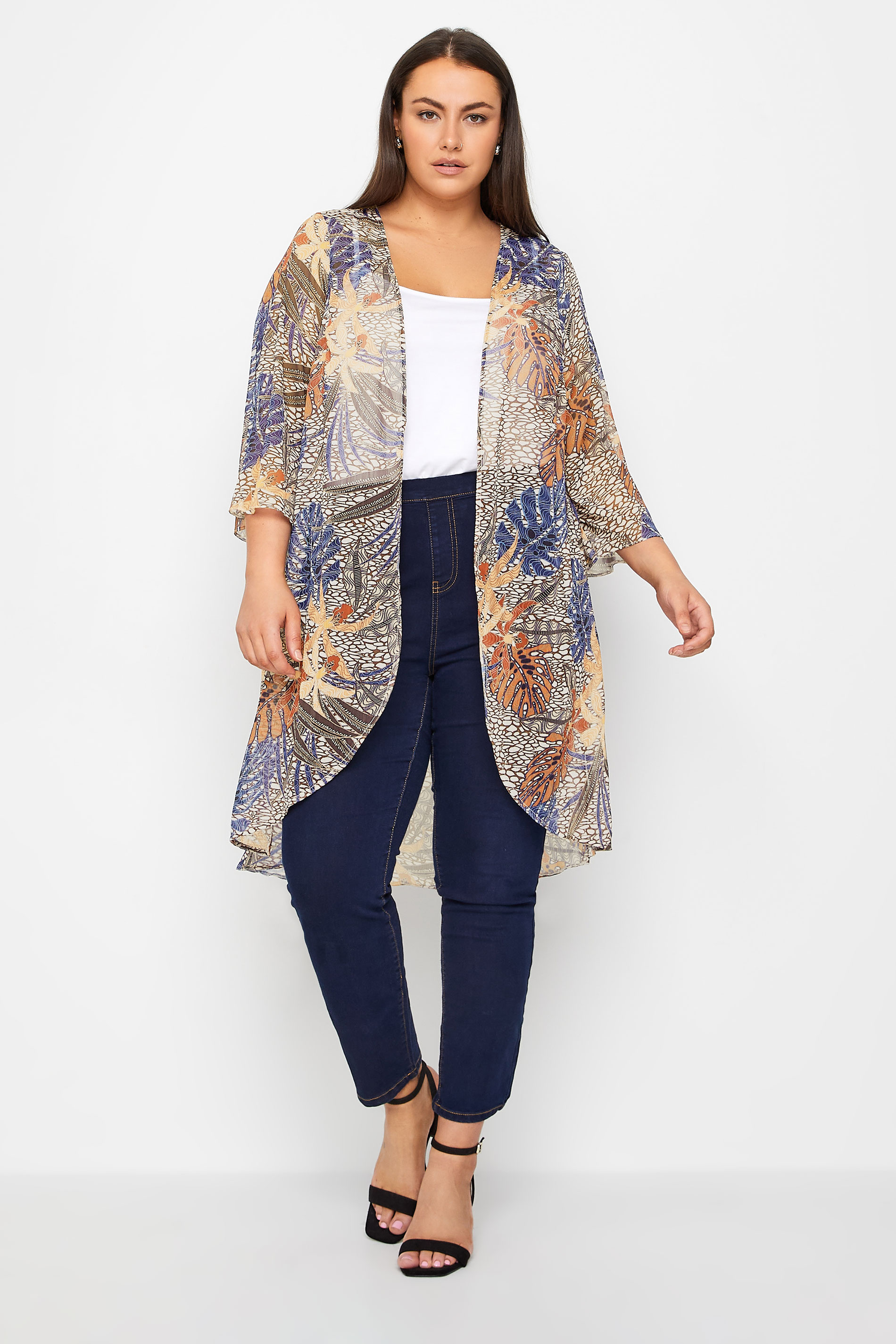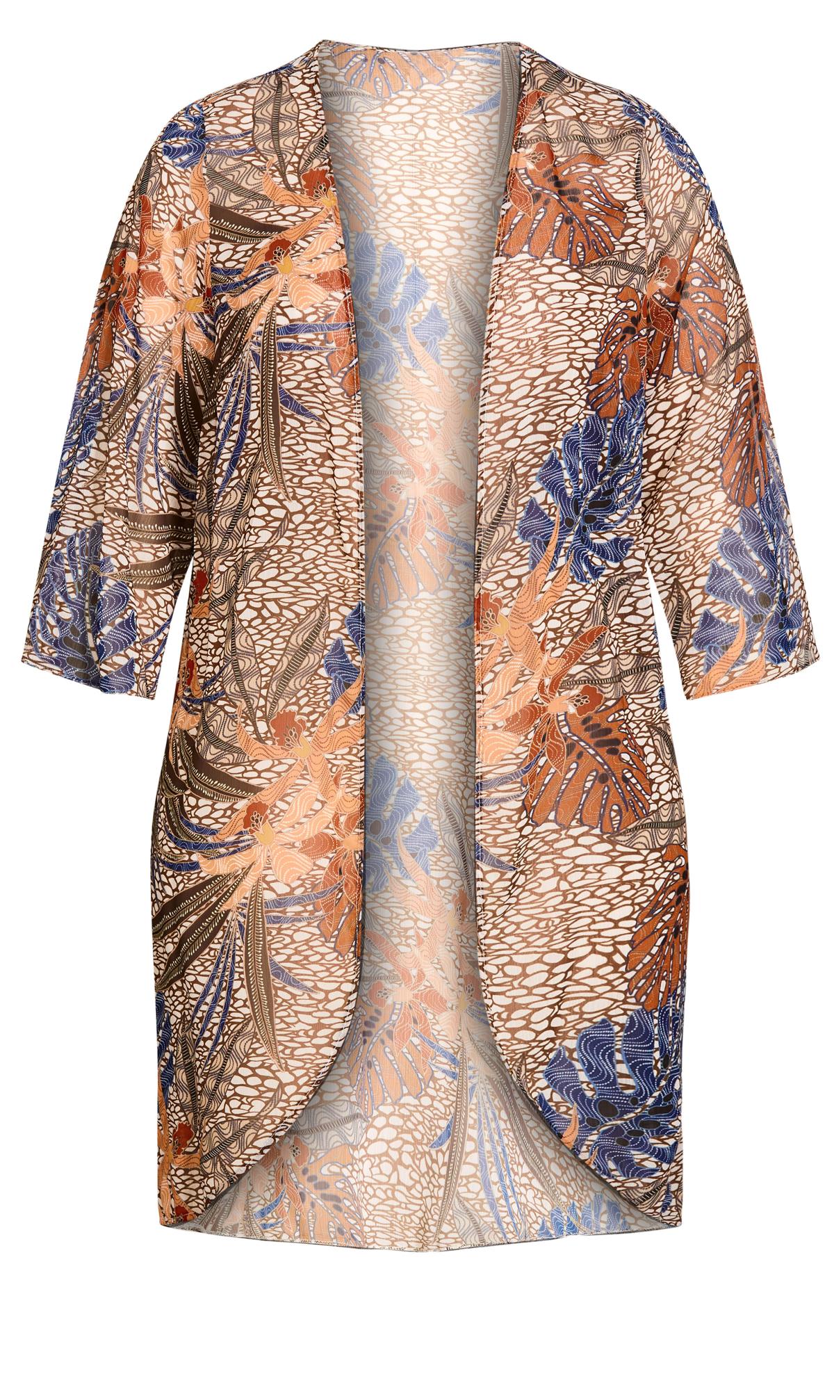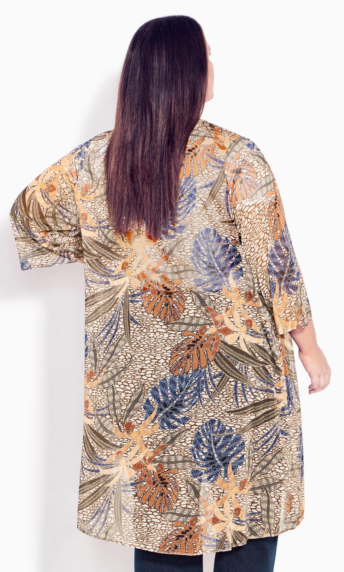 Renew your wardrobe with these palm printed kimono. Combining a semi-sheer fabrication with an open front and curved hemline, this cardigan is sure to elevate your style. Layer over a vest top and jeans for a look you can rely on.
