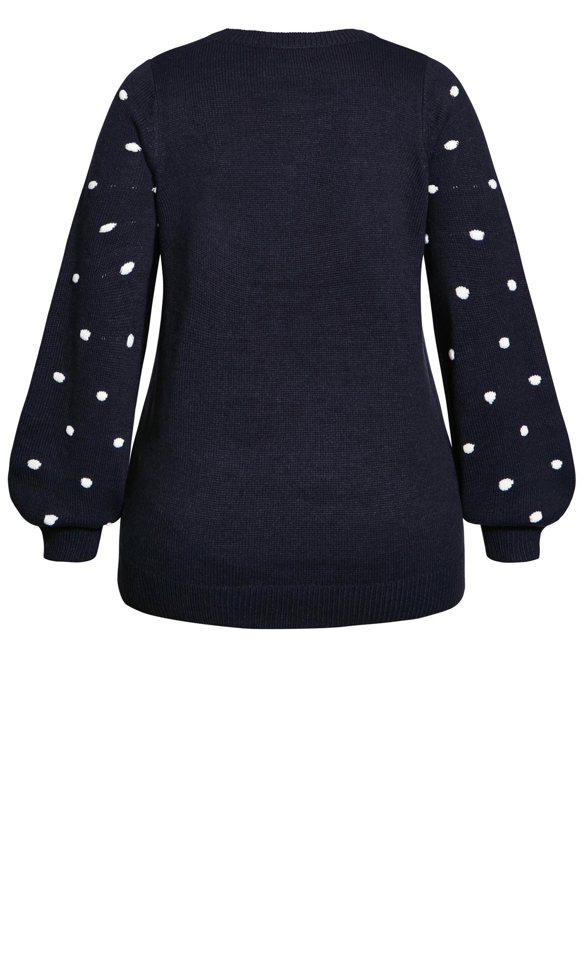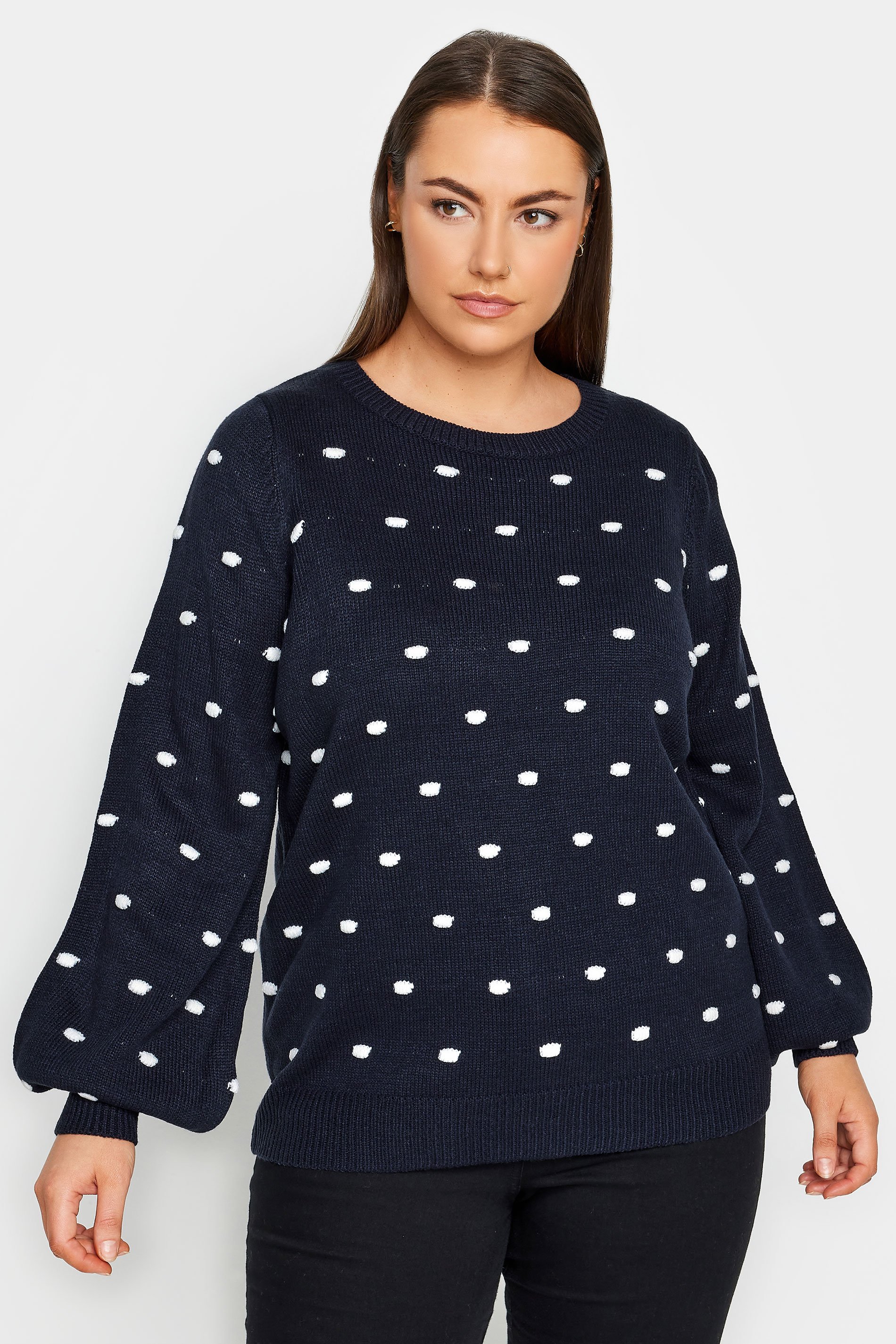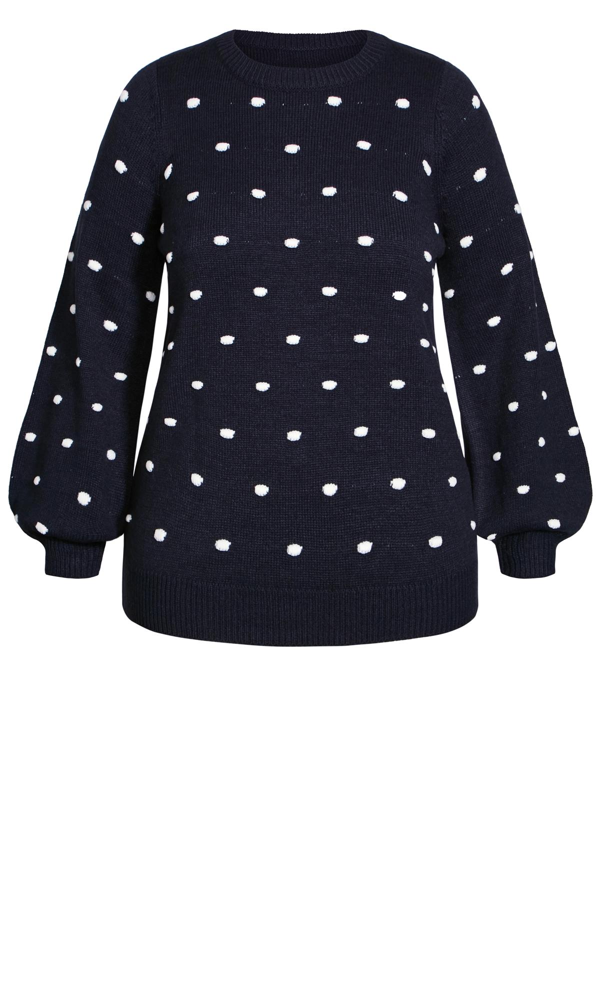 Elevate your winter wardrobe with this new knitted jumper, a perfect blend of playfulness and sophistication. The charming polka dot pattern adds a touch of whimsy to this cozy knit jumper, while the on-trend balloon sleeves bring a fashion-forward flair. Embrace warmth and style simultaneously in this navy blue statement piece, ideal for both casual outings and chic gatherings.