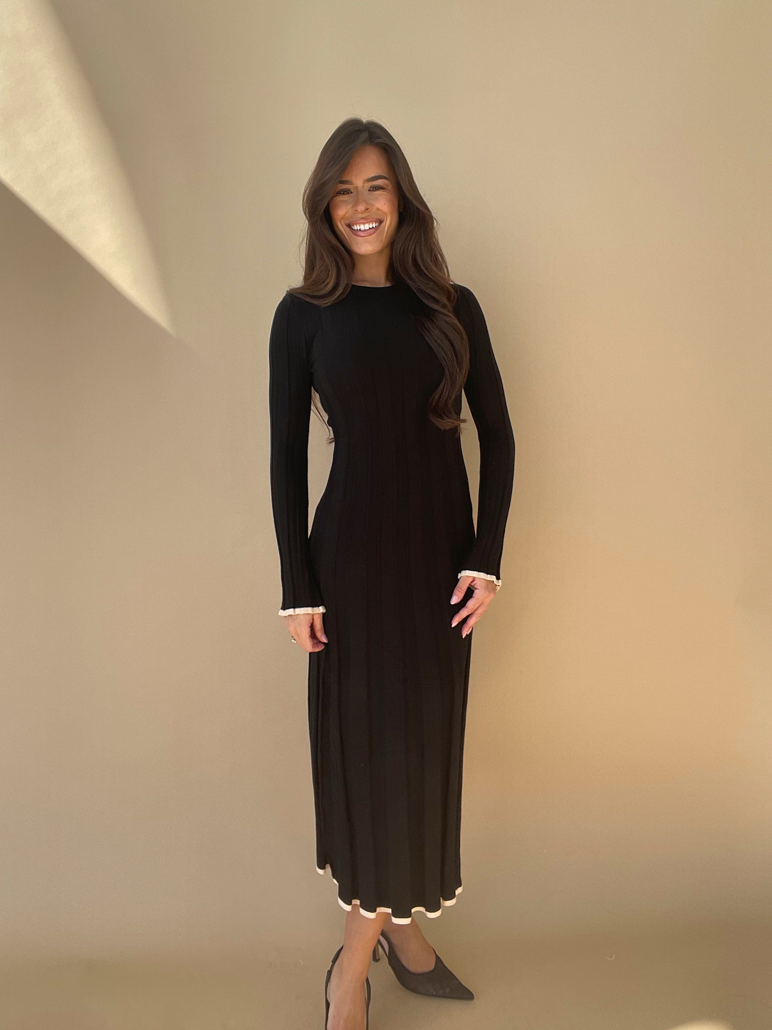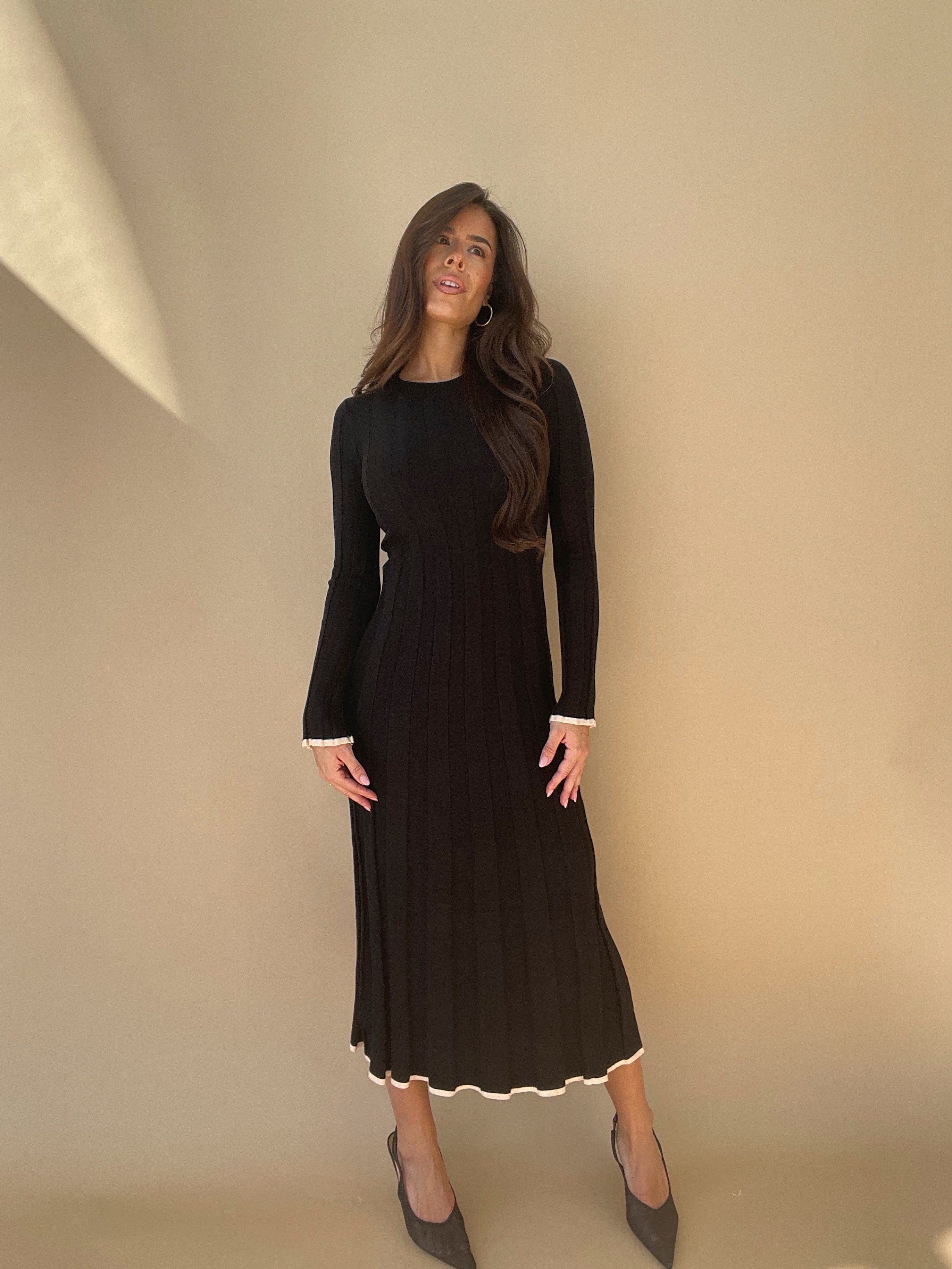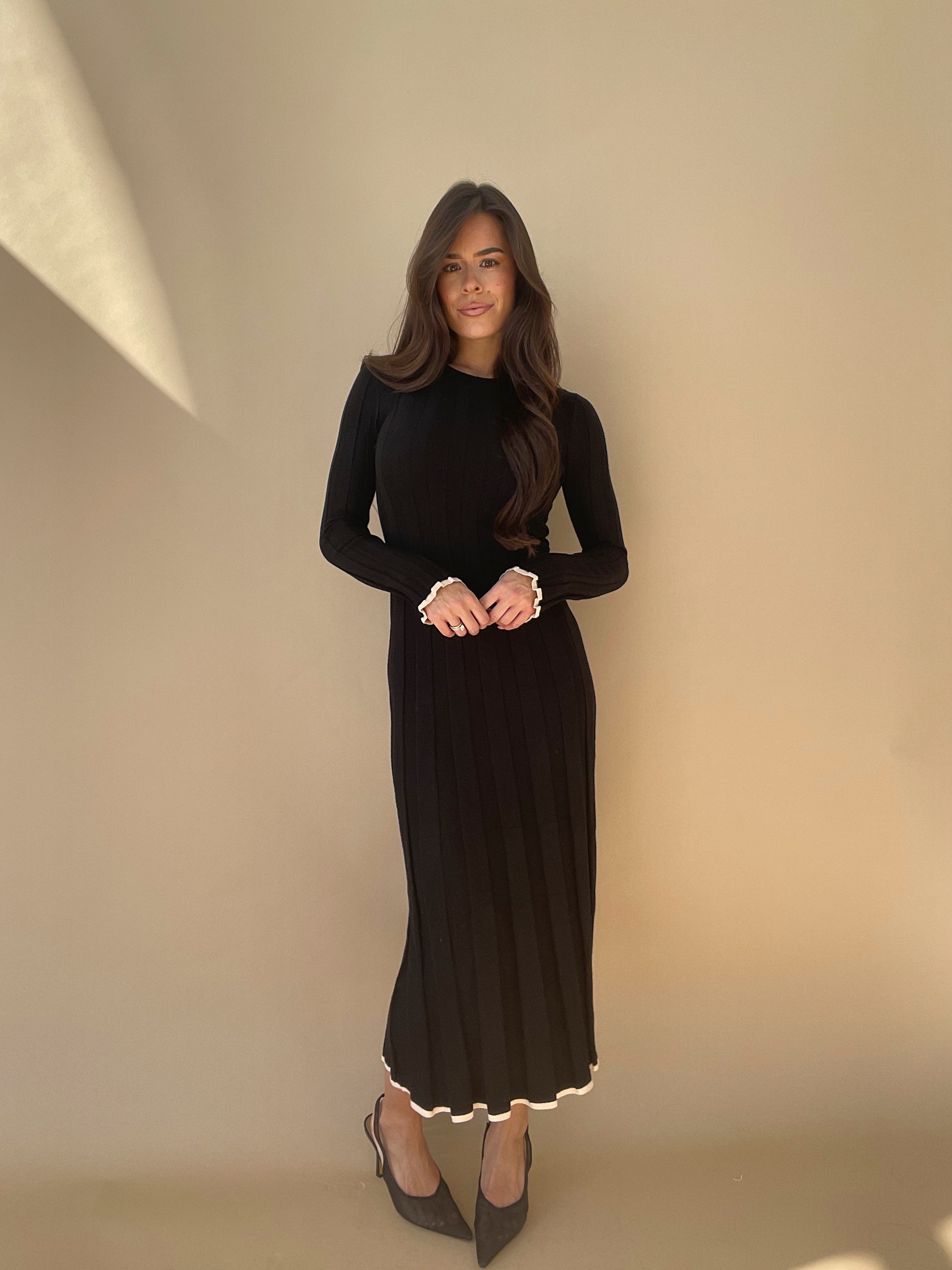 Expertly designed with contrast trim detailing, our Evening Allure Maxi Dress offers a sophisticated and stylish look. The pleated skirt design and long sleeves provide a flattering silhouette, while the fitted yet stretchy material ensures comfort and ease of movement. Perfect for any occasion, this dress is a must-have in your wardrobe.