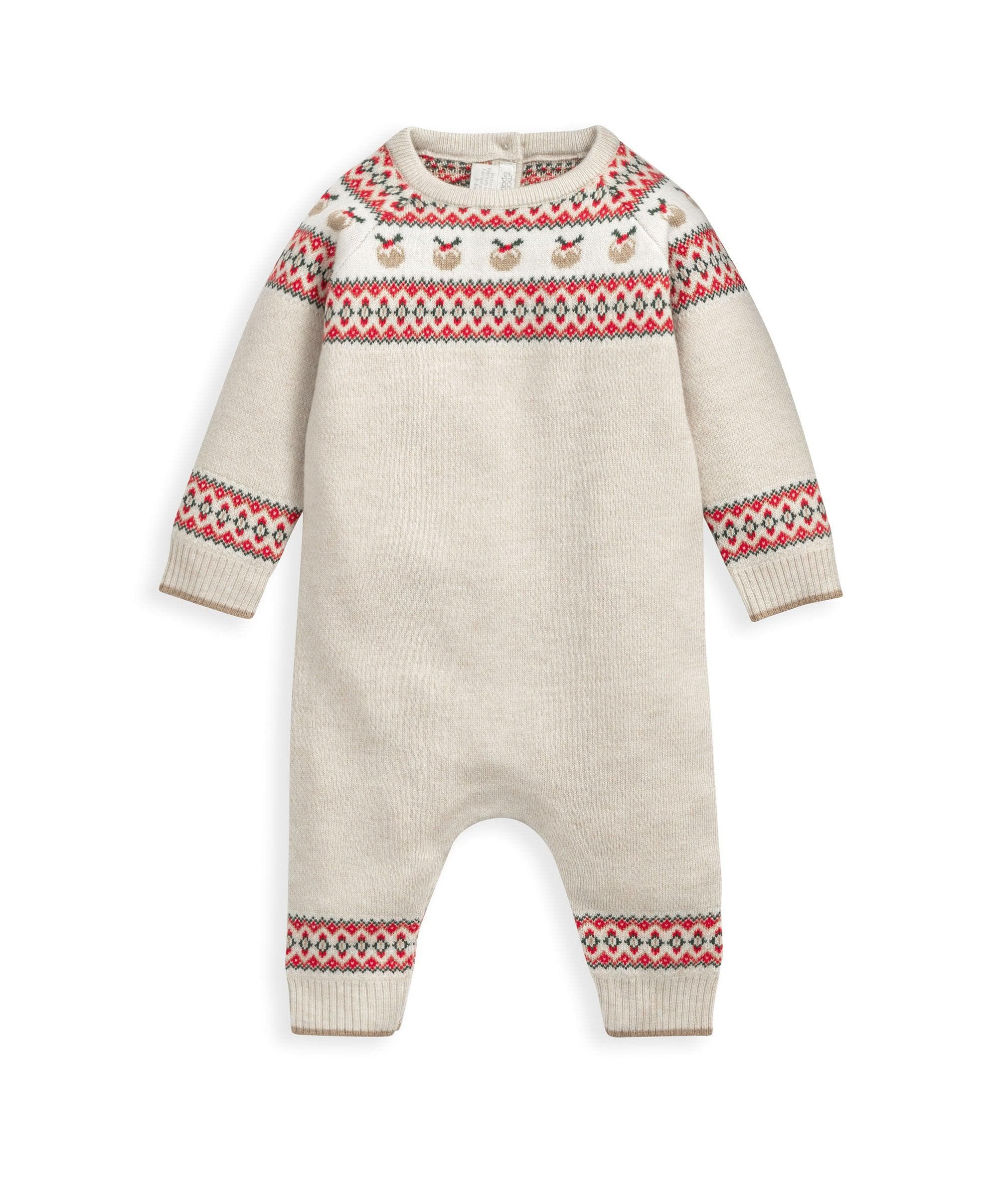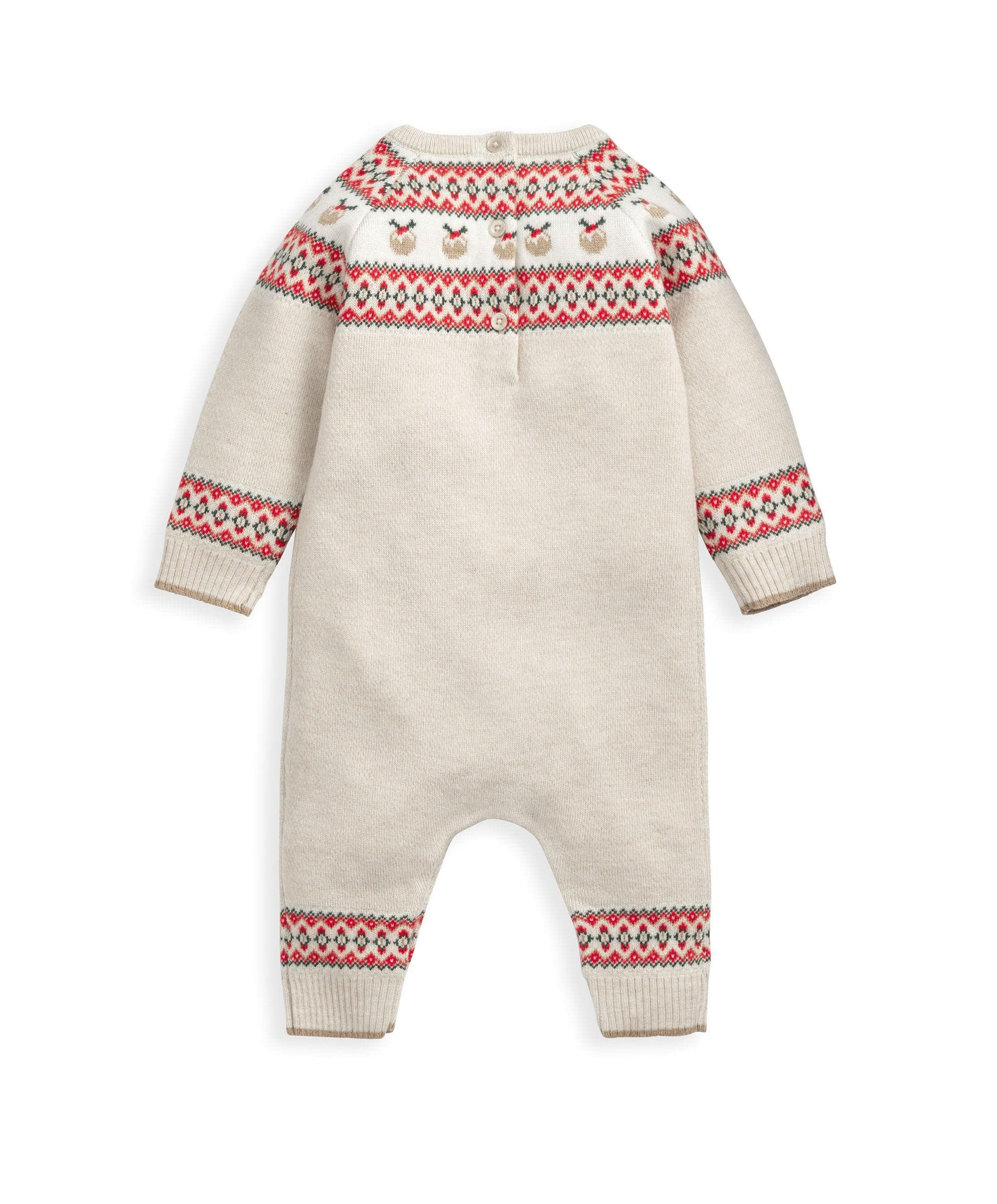 Super cosy, this knitted romper in oatmeal is finished with smart ribbed cuffs and neckline with a Christmas fairilse print. Back opening has functional button fastening and we've added a concealed popper fastening at crotch for quicker nappy changes!