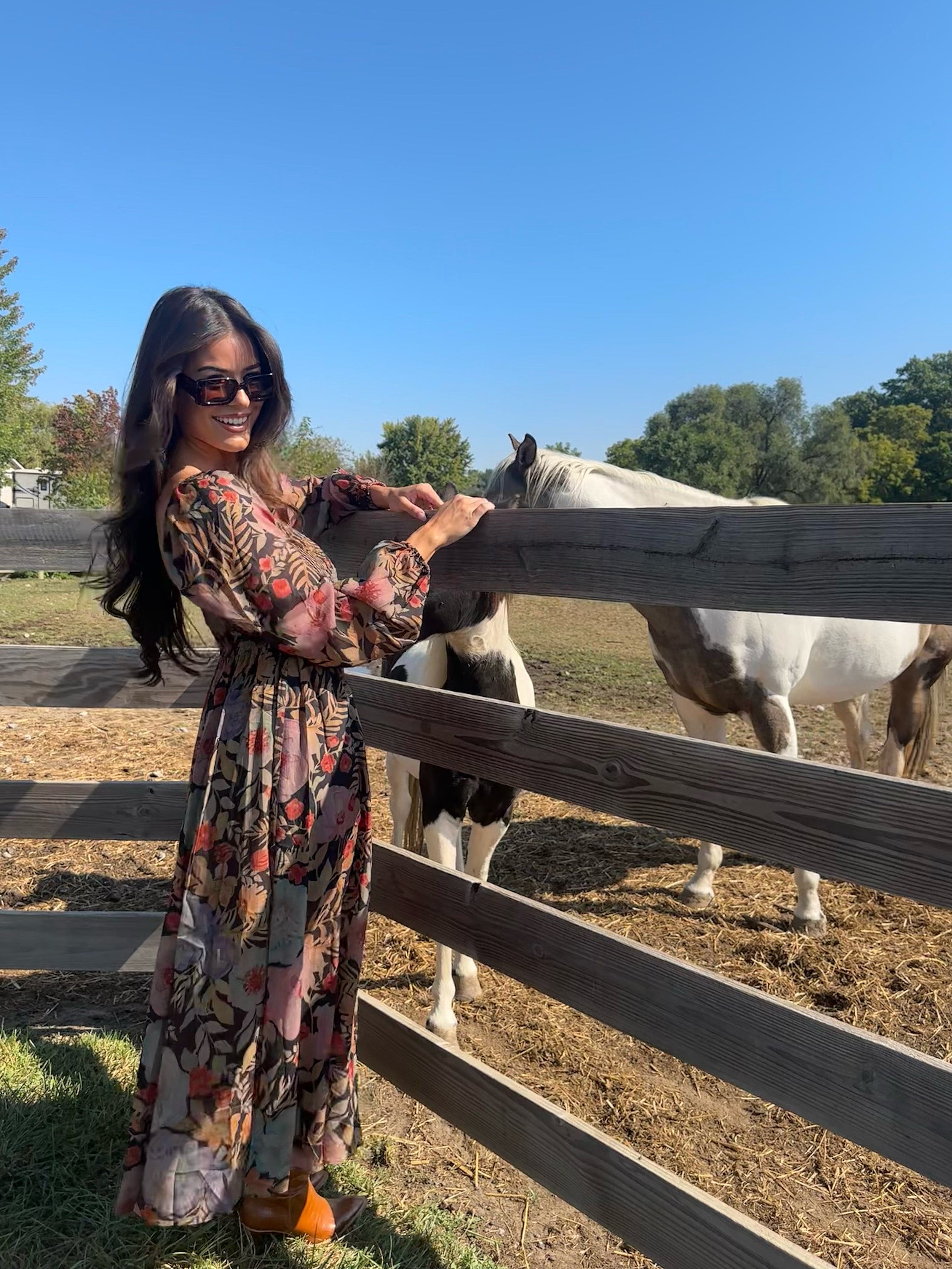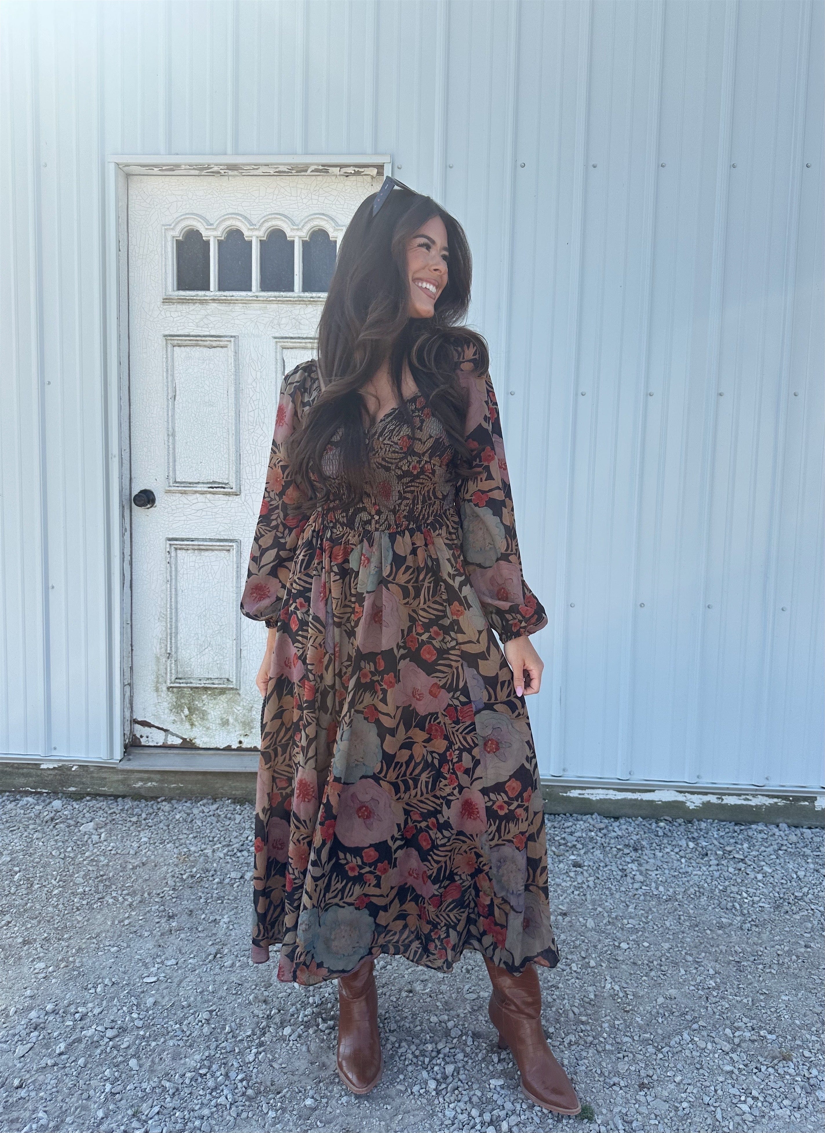 Discover timeless elegance with our Fall Blooms Maxi Dress. This maxi dress features a stunning floral design that is perfect for any occasion. With its long sleeves, you'll stay warm and comfortable all day long.