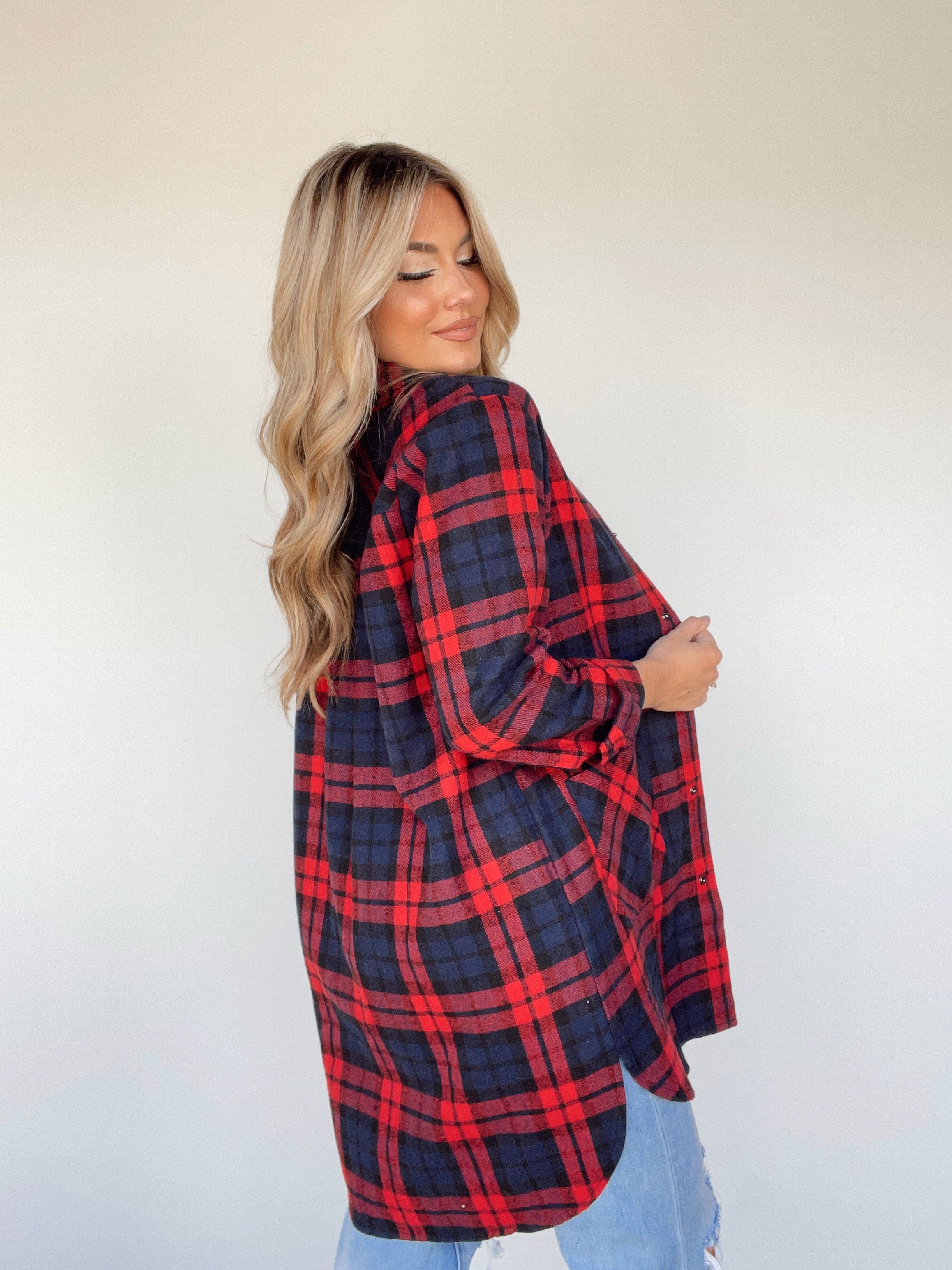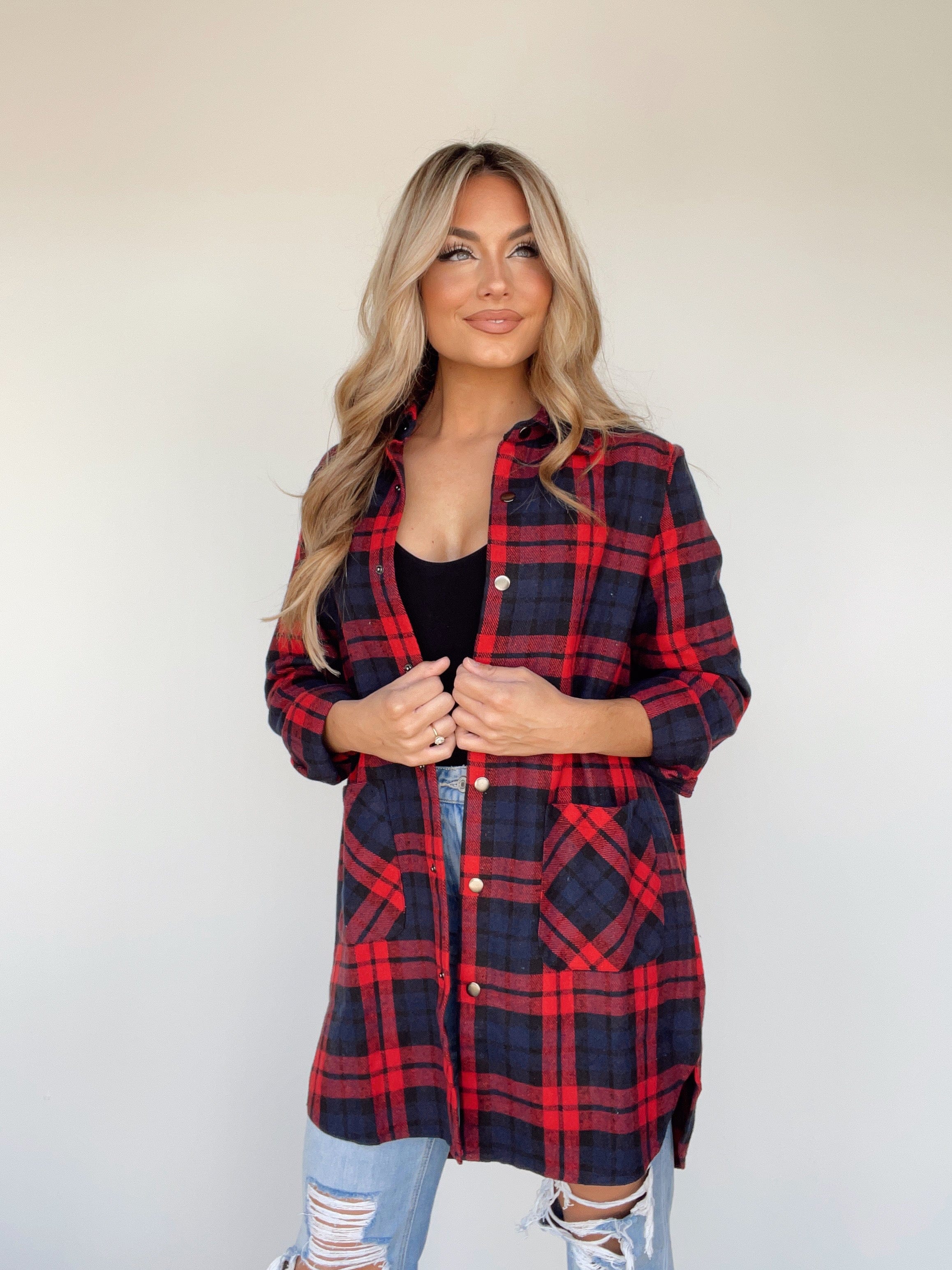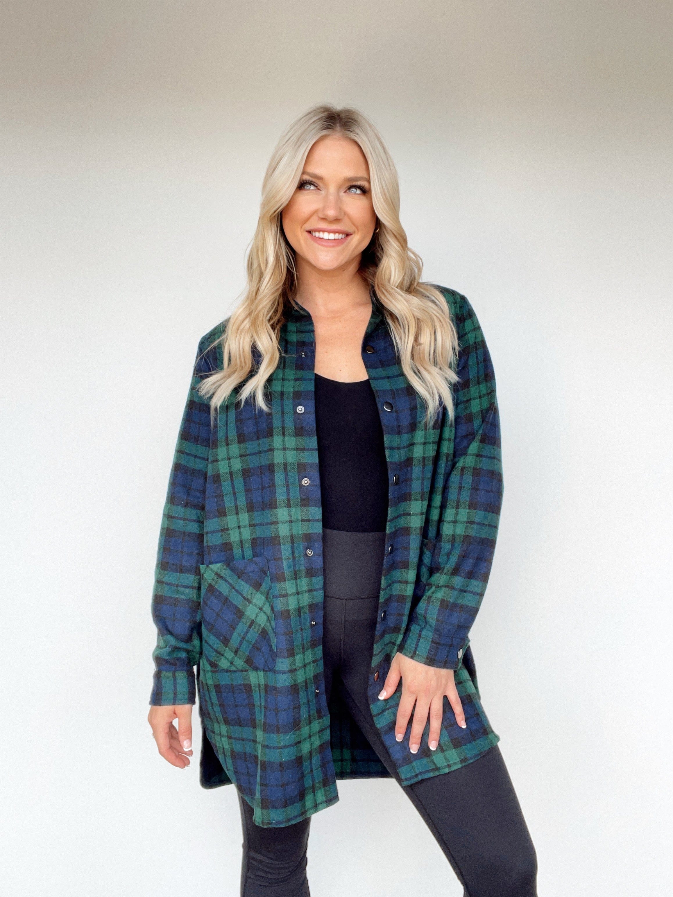 Experience the warmth and coziness of autumn with the Fall Festival Shacket. Crafted from soft plaid fabric with a flour de lis-style button closure, this long fit shacket boasts a collared neck line and pocket details for an elegant look. The rounded hi-low hem provides a timeless transition piece to weave through the many joys of the season, like apple picking and pumpkin patching.