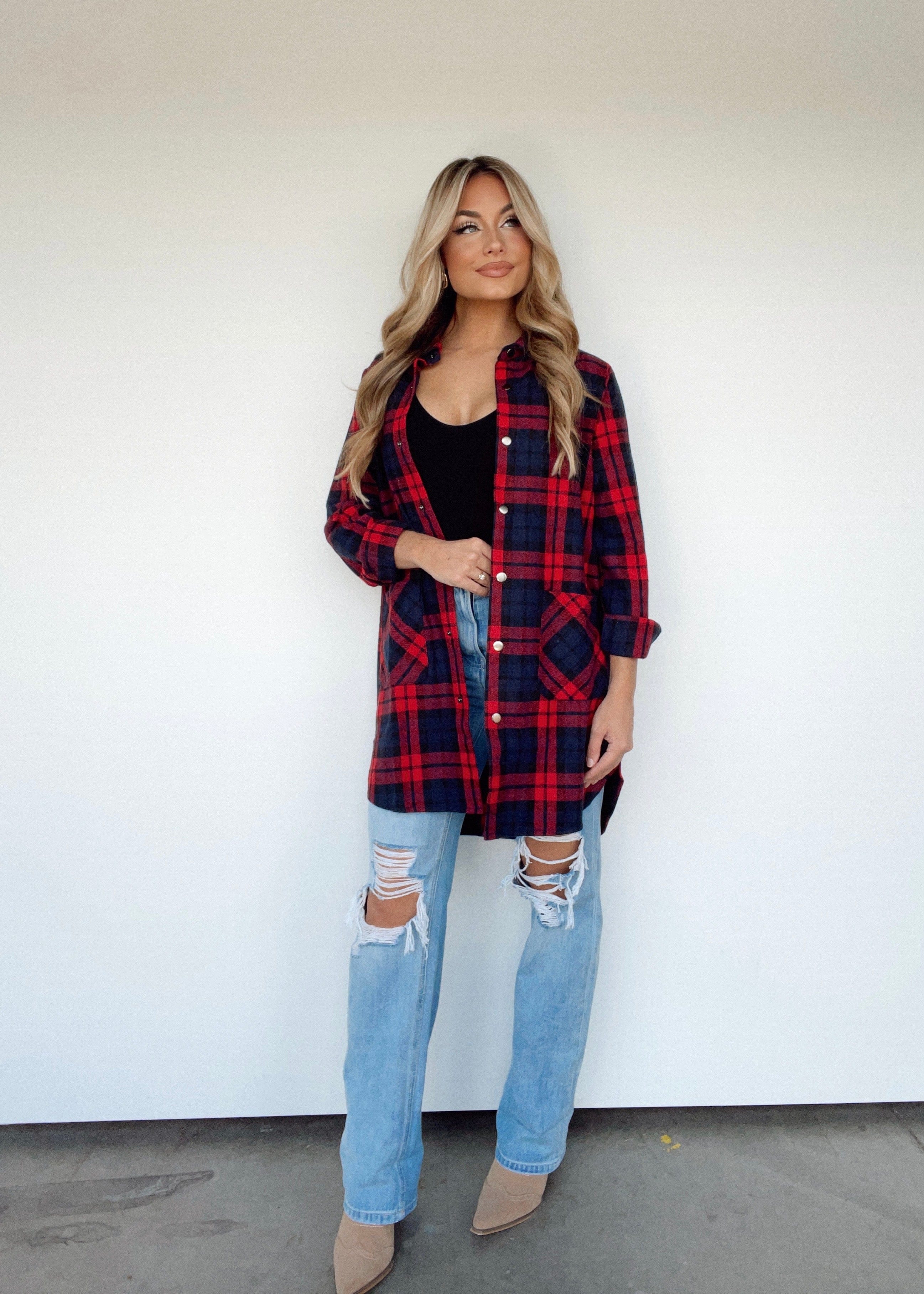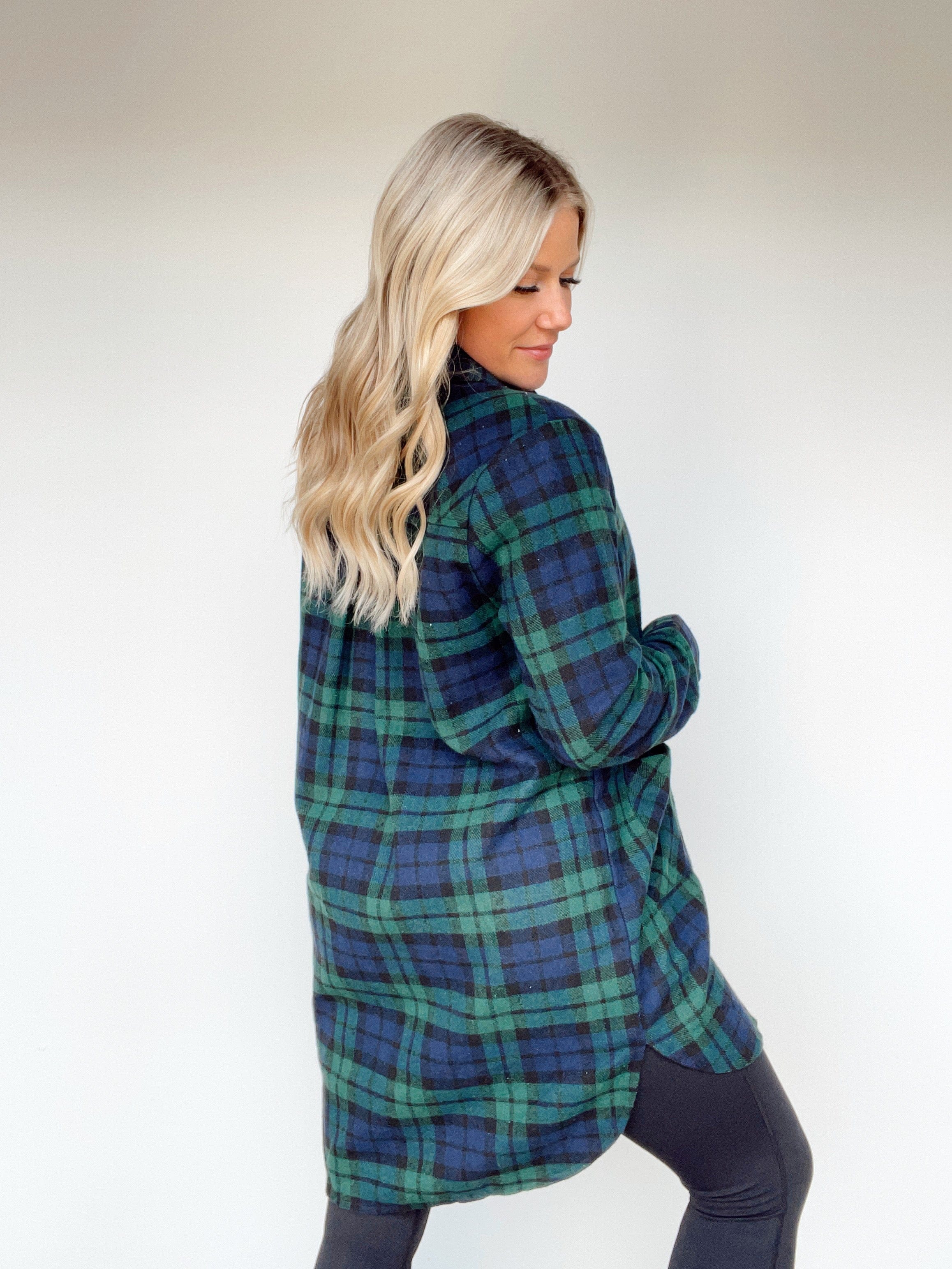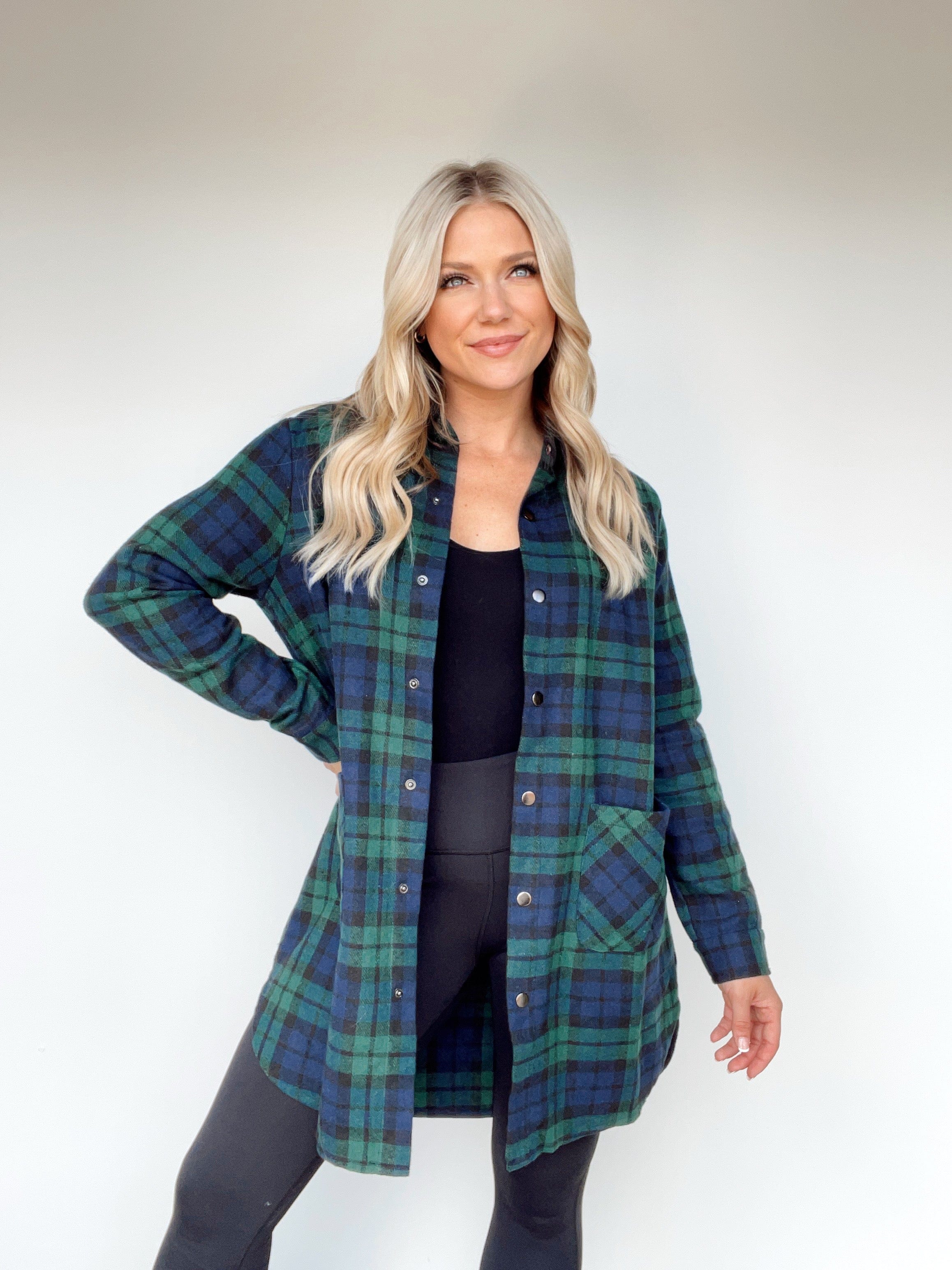 Experience the warmth and coziness of autumn with the Fall Festival Shacket. Crafted from soft plaid fabric with a flour de lis-style button closure, this long fit shacket boasts a collared neck line and pocket details for an elegant look. The rounded hi-low hem provides a timeless transition piece to weave through the many joys of the season, like apple picking and pumpkin patching.