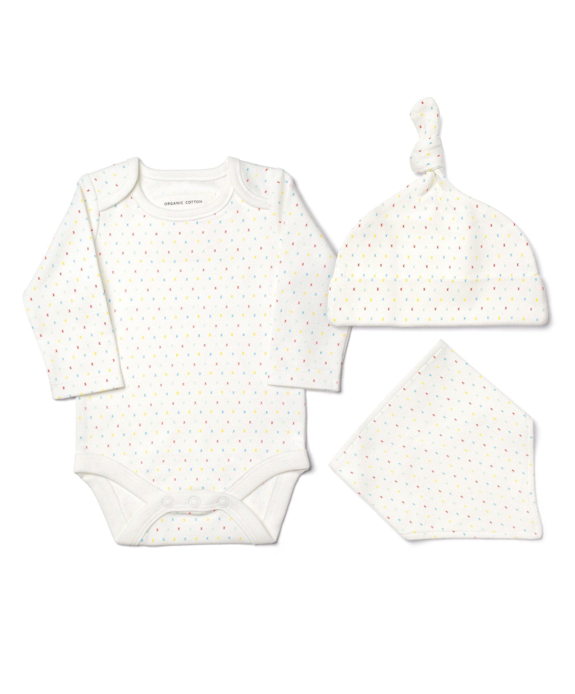 This Gift Pouch includes a First Kisses organic bodysuit, adjustable bandana bib and knot hat. Our gender-neutral First Kisses collection celebrates those precious first moments with baby. And besides, who doesn't love to be covered in kisses!