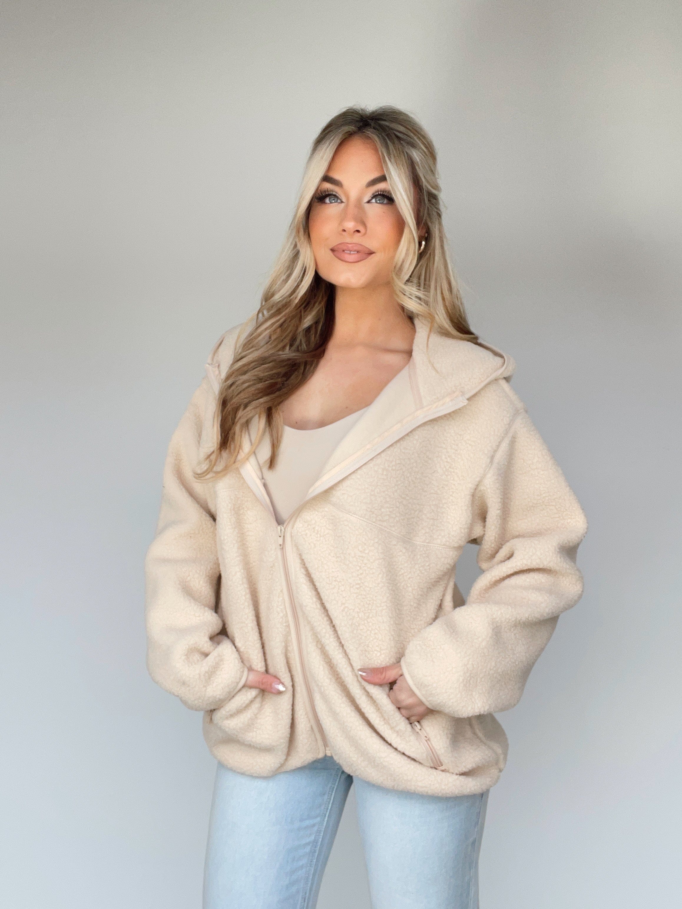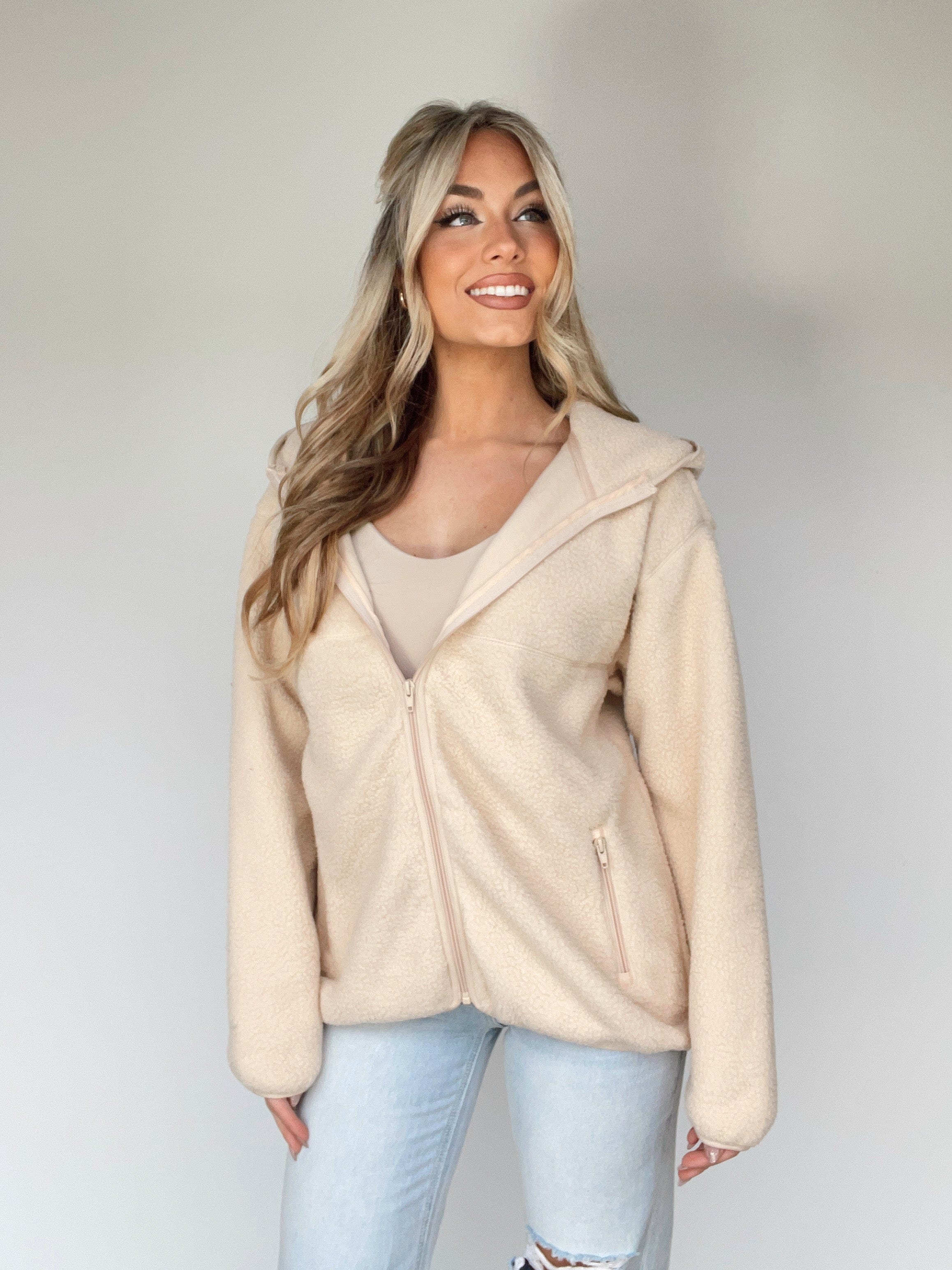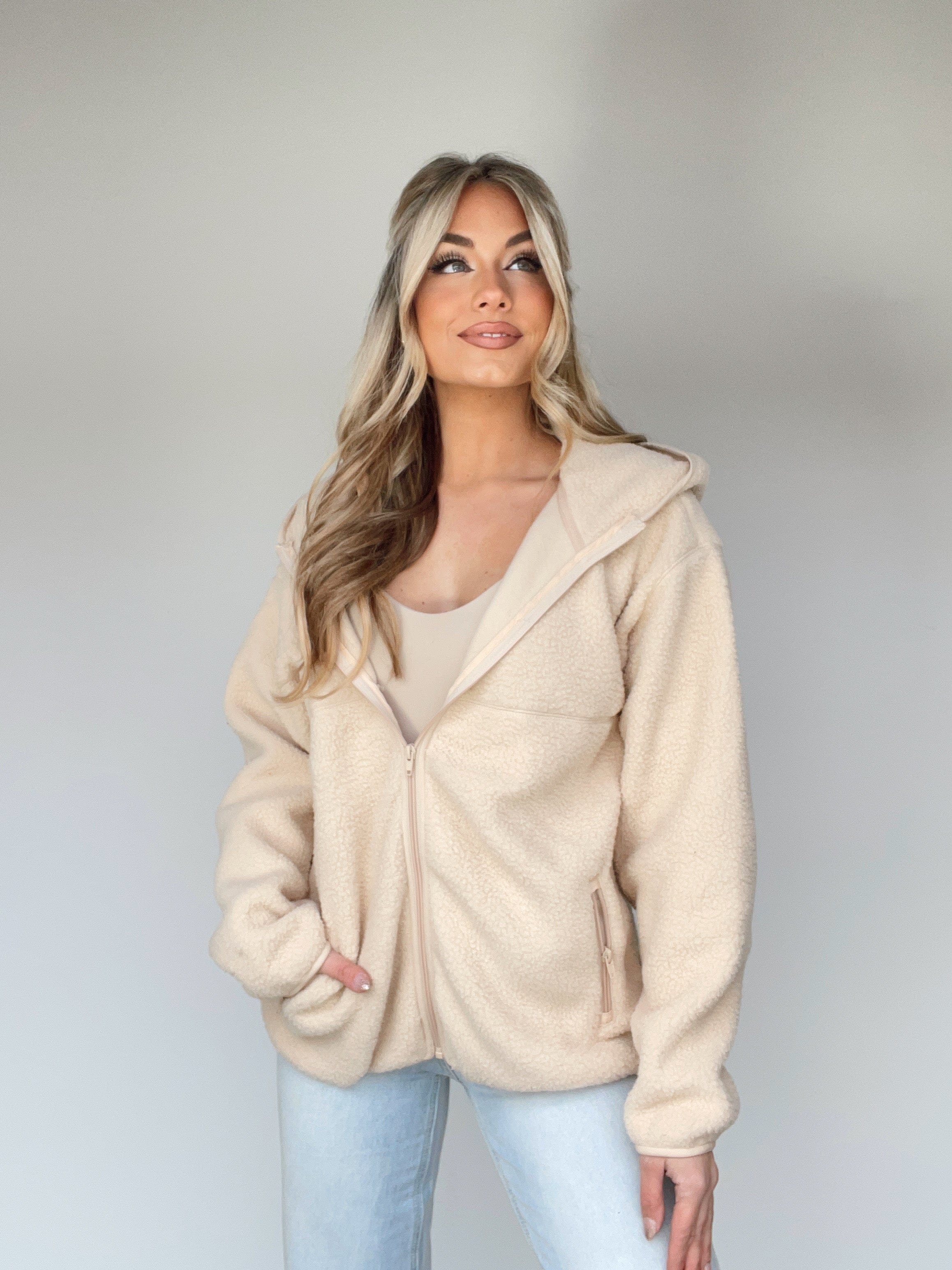 A perfectly cozy winter companion, our Fleece & Thank You Jacket makes a fashionable and functional statement. Featuring a classic sherpa fabric, fashionable pocket details, and zipper closure, this ultra-soft, fluffy, and stretchy design is perfect for lounging, errands, or casual elevated style. Enjoy the warmth and comfort of winter and hot cocoa with this trendy, relaxed fit jacket.