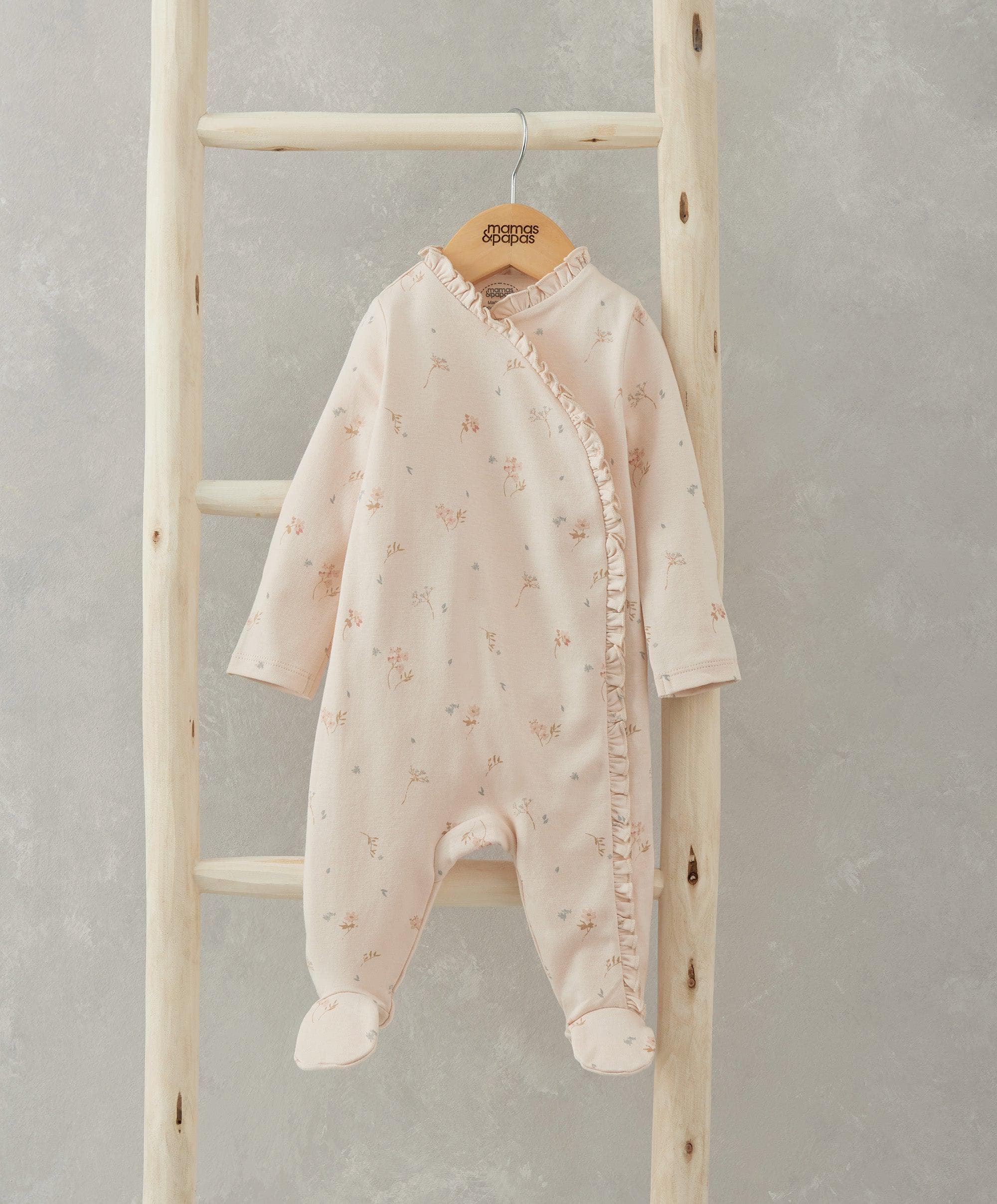 Long-sleeved all in one with stylish wrap front in beautiful wildflower print, that feautres throughout this collection. Popper fastening makes dressing and nappy changes easier. Elasticated cuff at ankles for comfy fit. Integrated scratch mits and feet for extra warmth and protection. Soft gentle fabric.