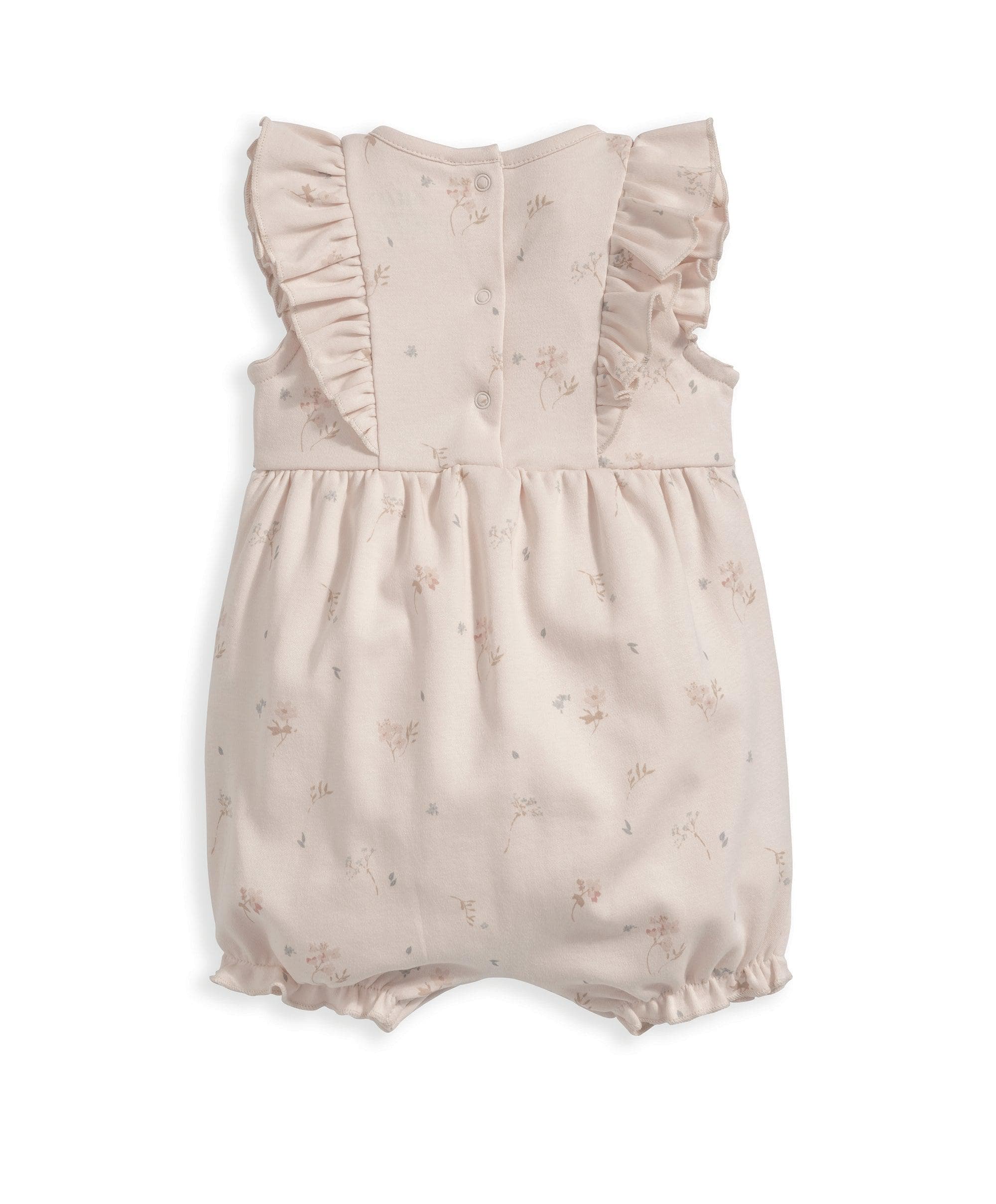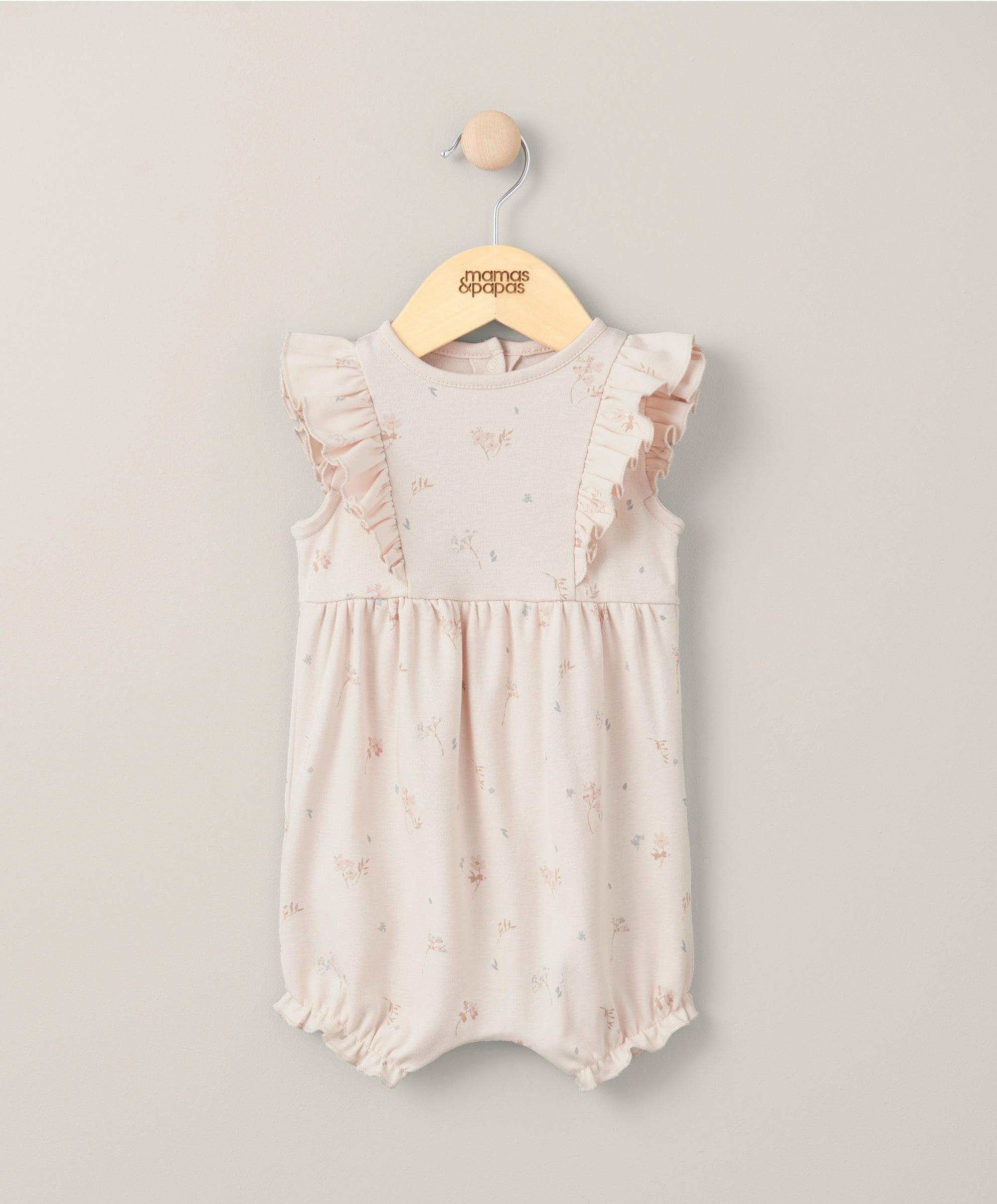 Sleeveless shortie romper in gorgeous wildflower print and finished with pretty frill detail.With popper fastening at center back neck and additional concealed popper fastening at crotch for the easiest dressing, undressing and nappy changes.