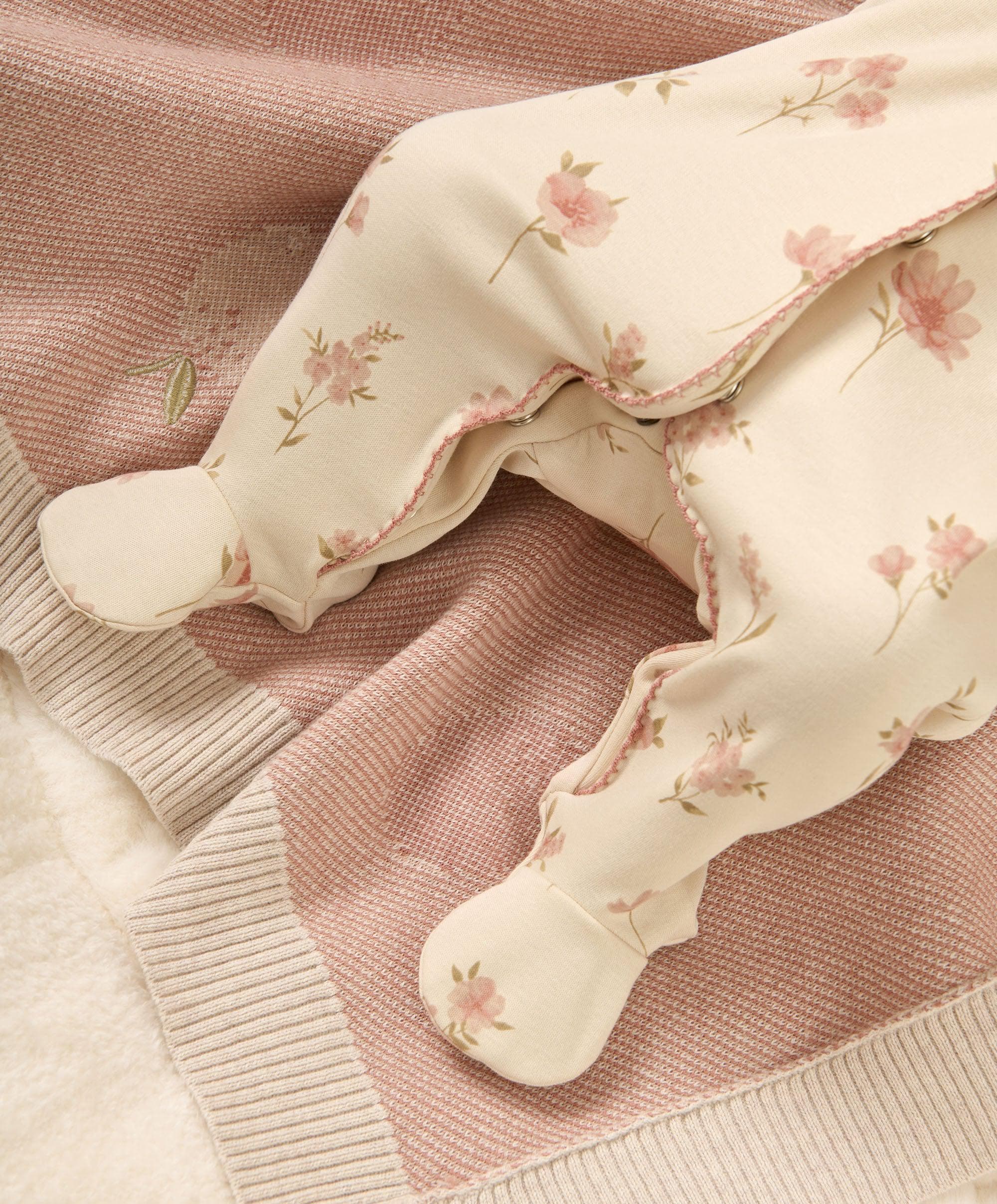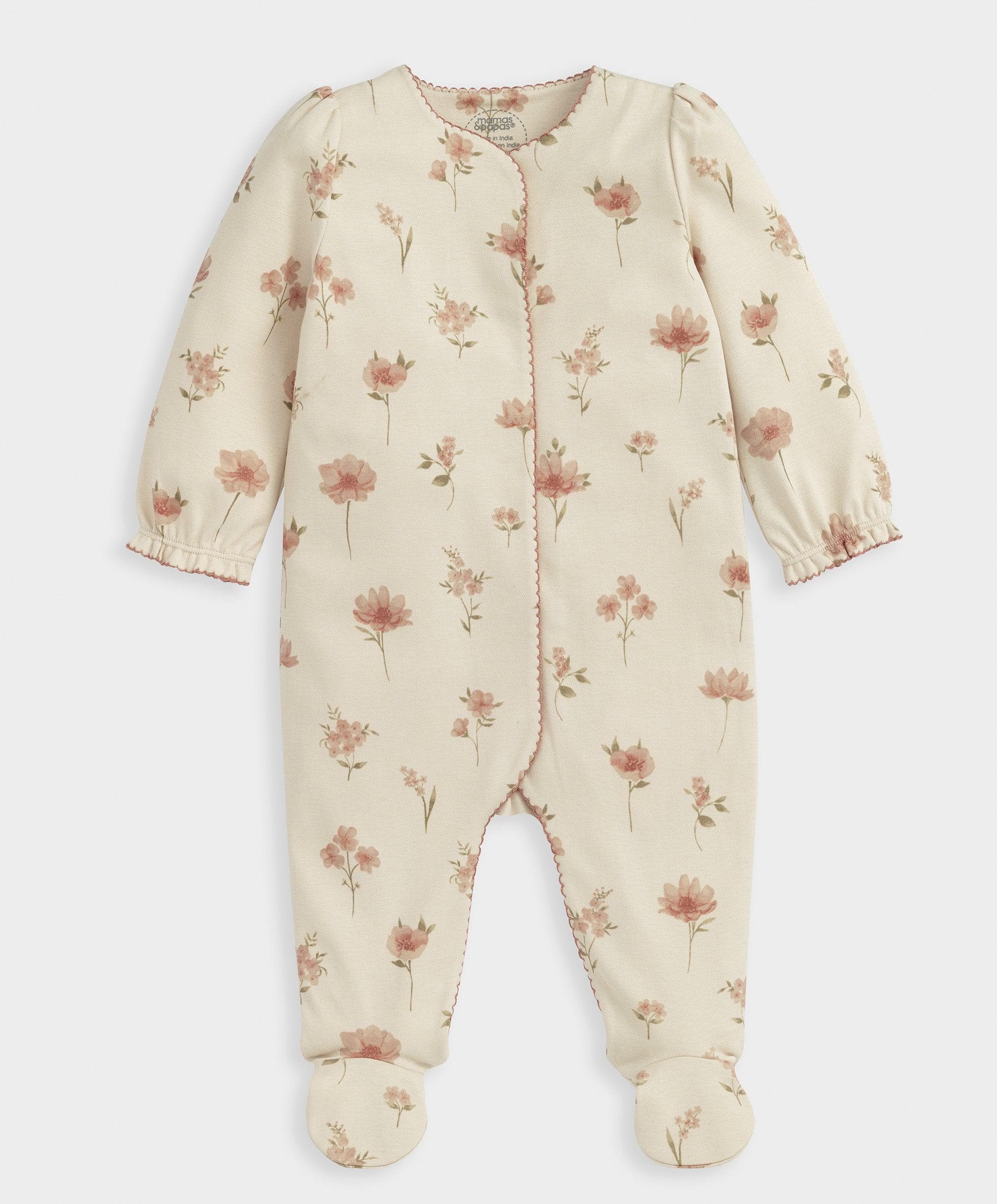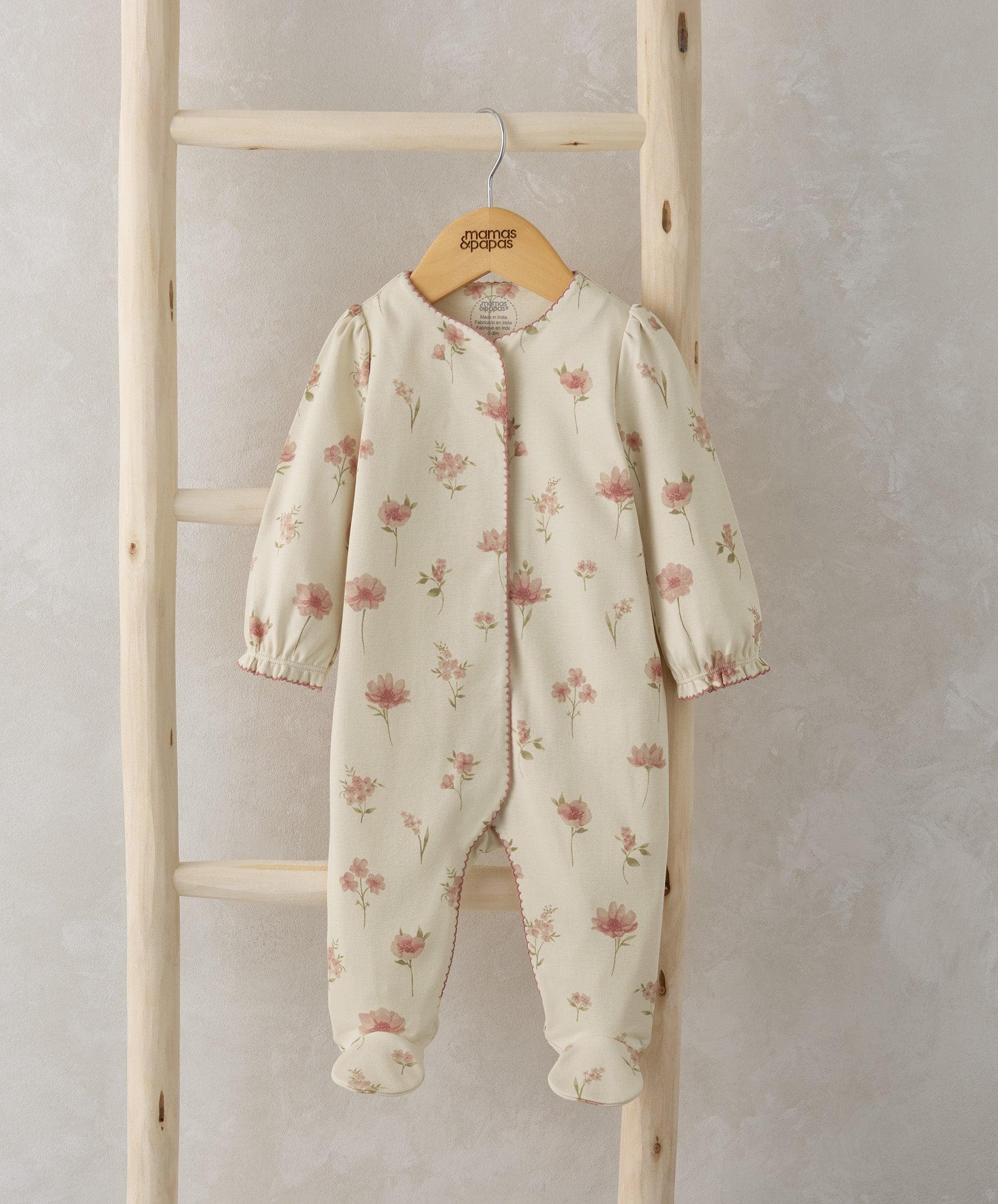 Long-sleeved all in one, in watercolour floral print. Full popper fastening.