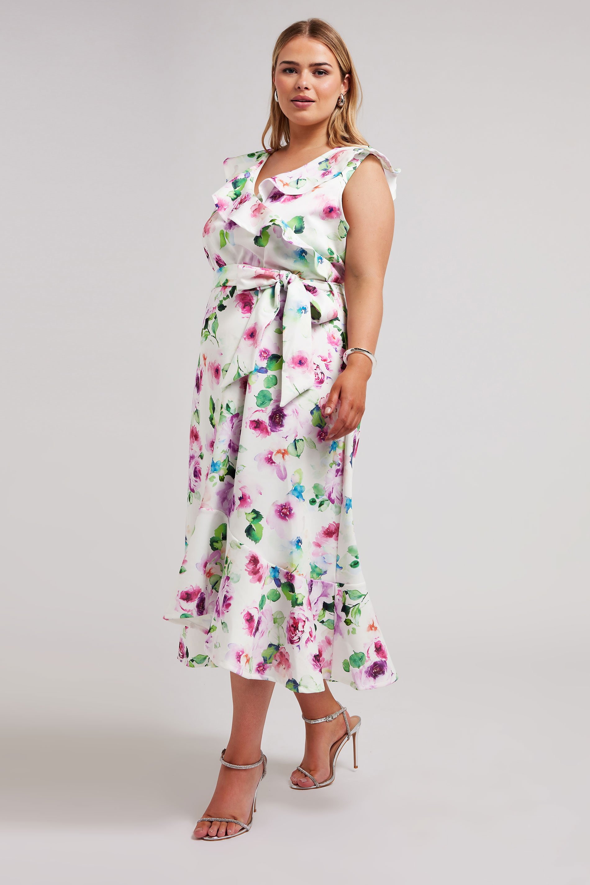 Introduce this beautiful wrap dress to your occasionwear collection this season. Made from a comfortable woven fabric, this dress features a floral print, a wrap style, a ruffle detail hem, a tie belt and sits at a midi length. Style with heels and a clutch for a stunning look you'll never want to take off!