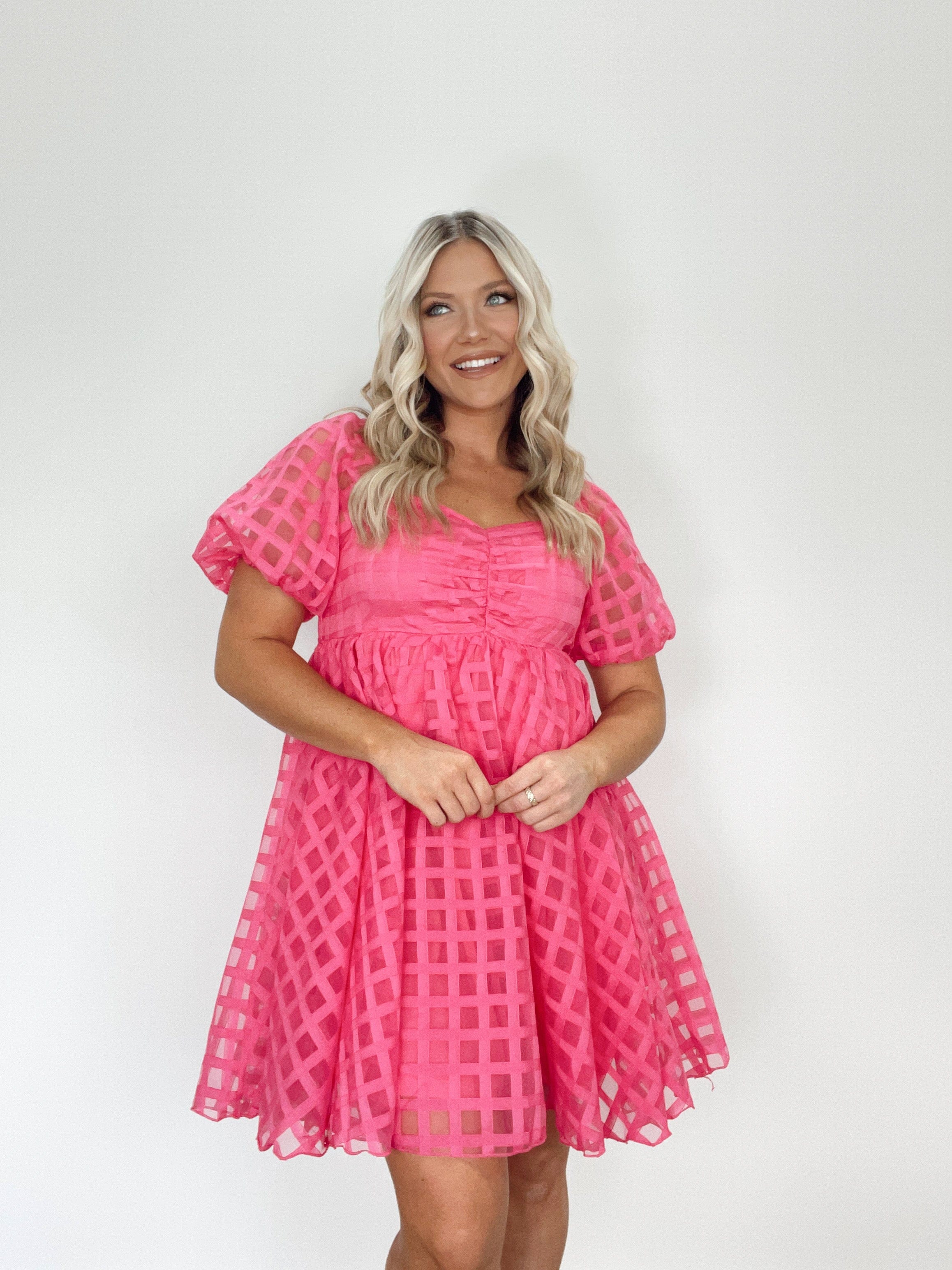 Be the center of attention in this stunning fuchsia checkered dress. With its eye-catching statement pattern and flattering babydoll fit, you'll be the epitome of girly chic. Puff sleeves, a soft inner lining, and gentle ruching detail give the piece a delicate air, while the smocked panel ensures both comfort and a beautiful silhouette. The perfect balance of bright, vibrant color and sweet femininity, this delightful dress is sure to light up any spring or summer day.