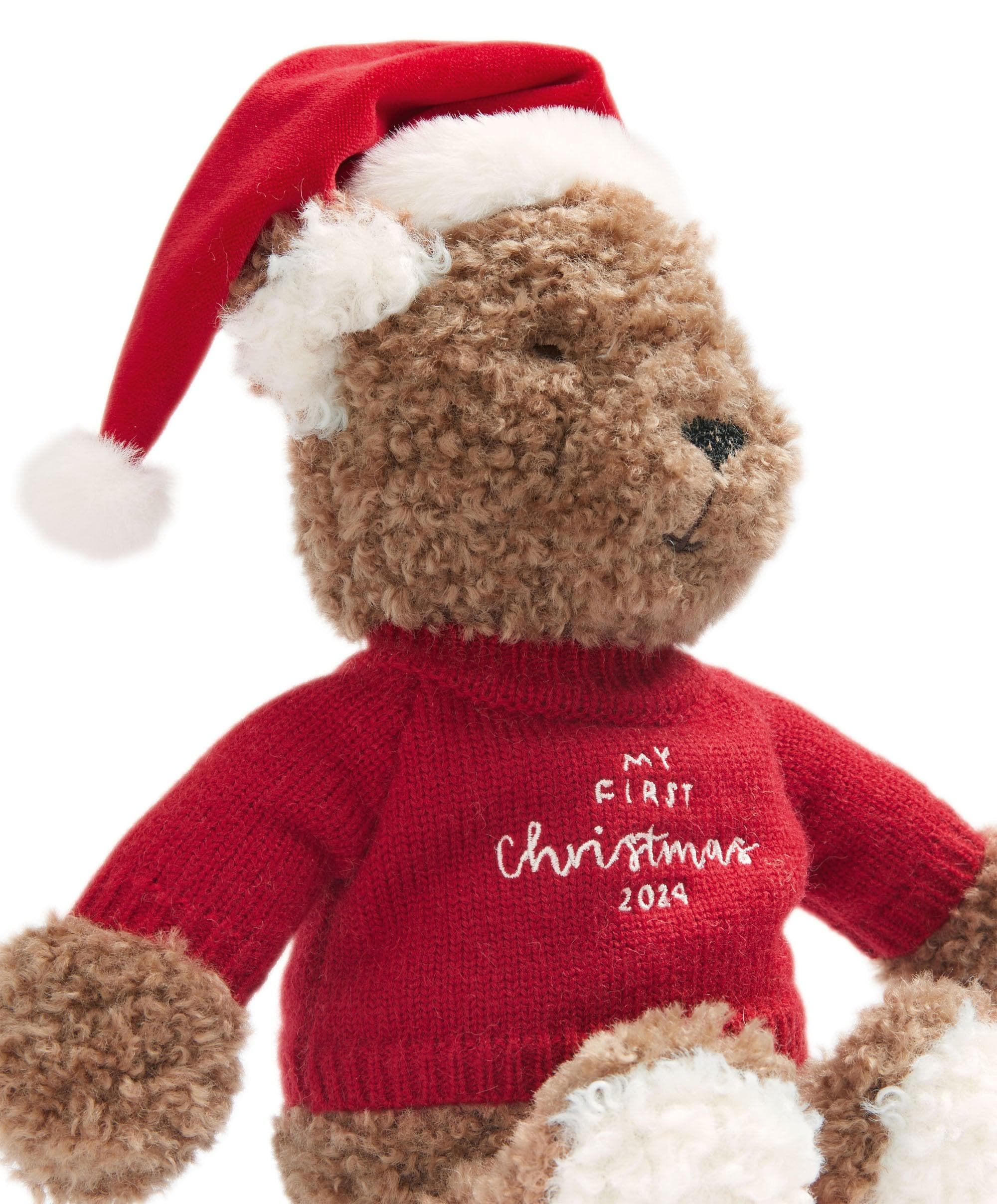 Say hello to a truly special Christmas teddy bear. In soft curled dusty brown faux fur with cream padded feet, he sports a soft knitted jumper embroidered with 'My first Christmas 2024' which commemorates their first Christmas season. A beautiful and special gift for any baby on their first Christmas, which they can keep hold of forever.