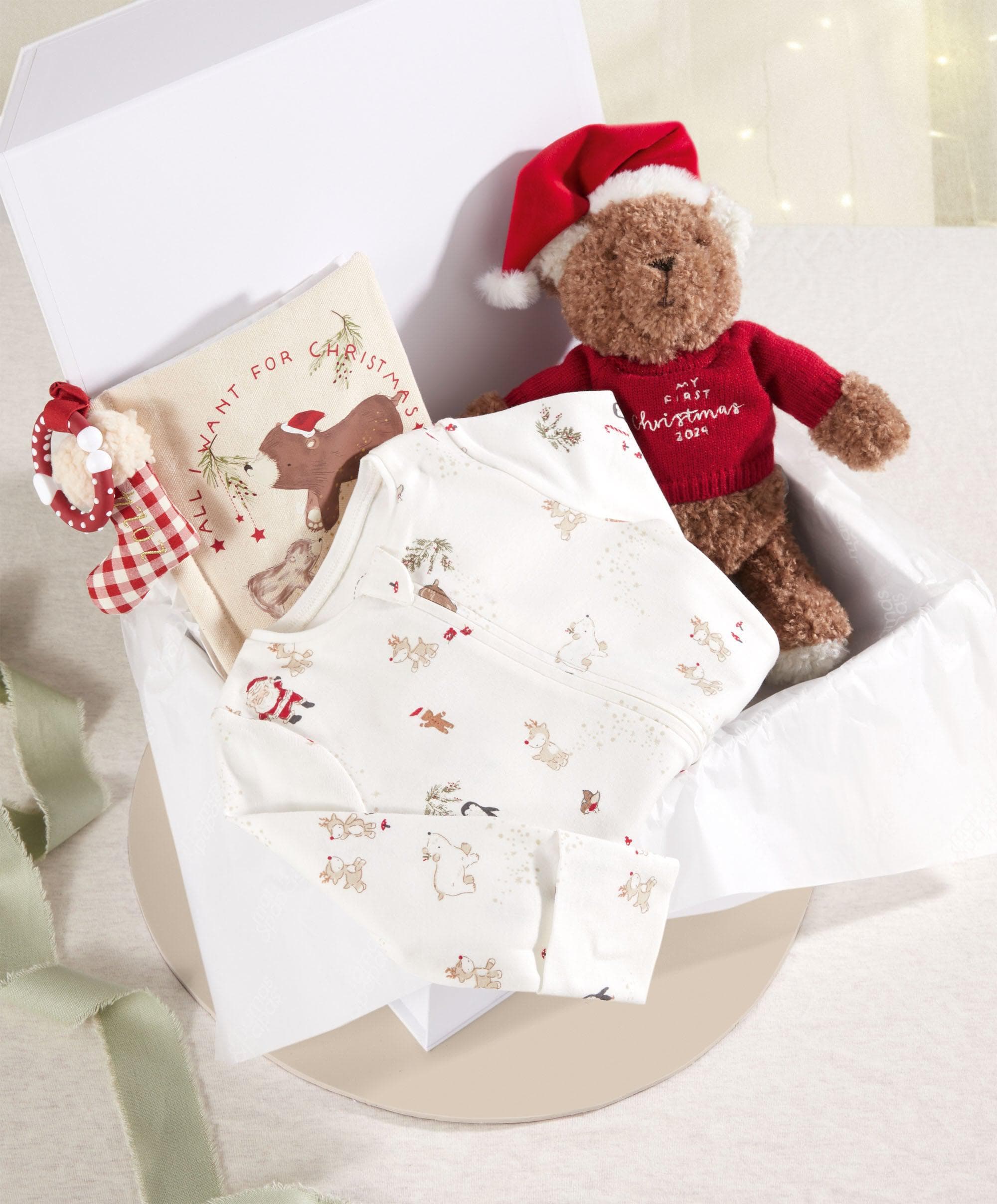 This gift box contains our My First Christmas Bear Soft Toy, Night Before Christmas Sleepsuit and All I Want for Christmas Activity Book.