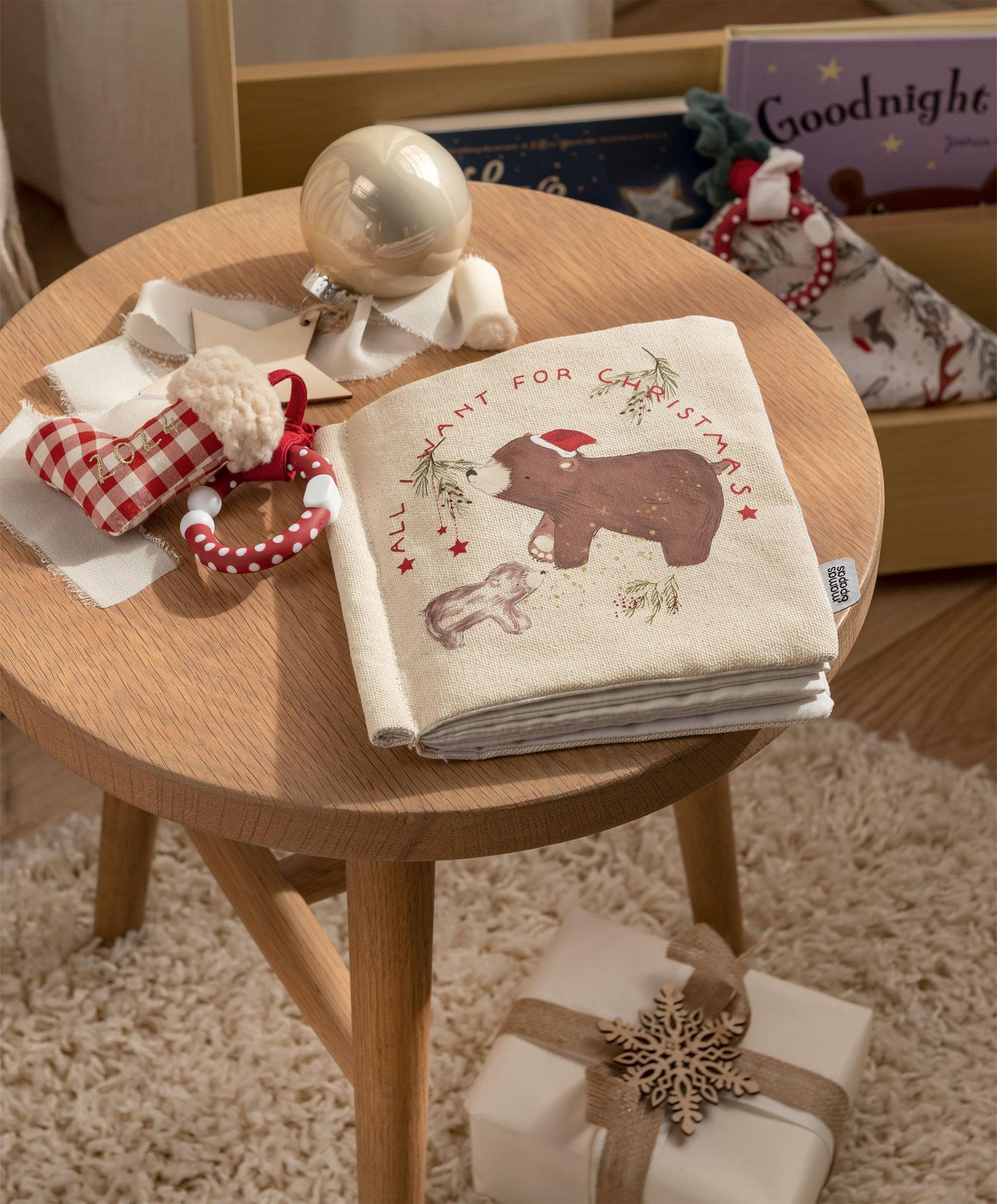 A beautifully hand illustrated and original story printed on Calico, following our little Bear - our standout Christmas character - on their Christmas journey. Developmental features include mirror crinkle glitter, peekaboo elements. A handy c-ring which connects to their pushchair or car seat and also doubles as a teether.