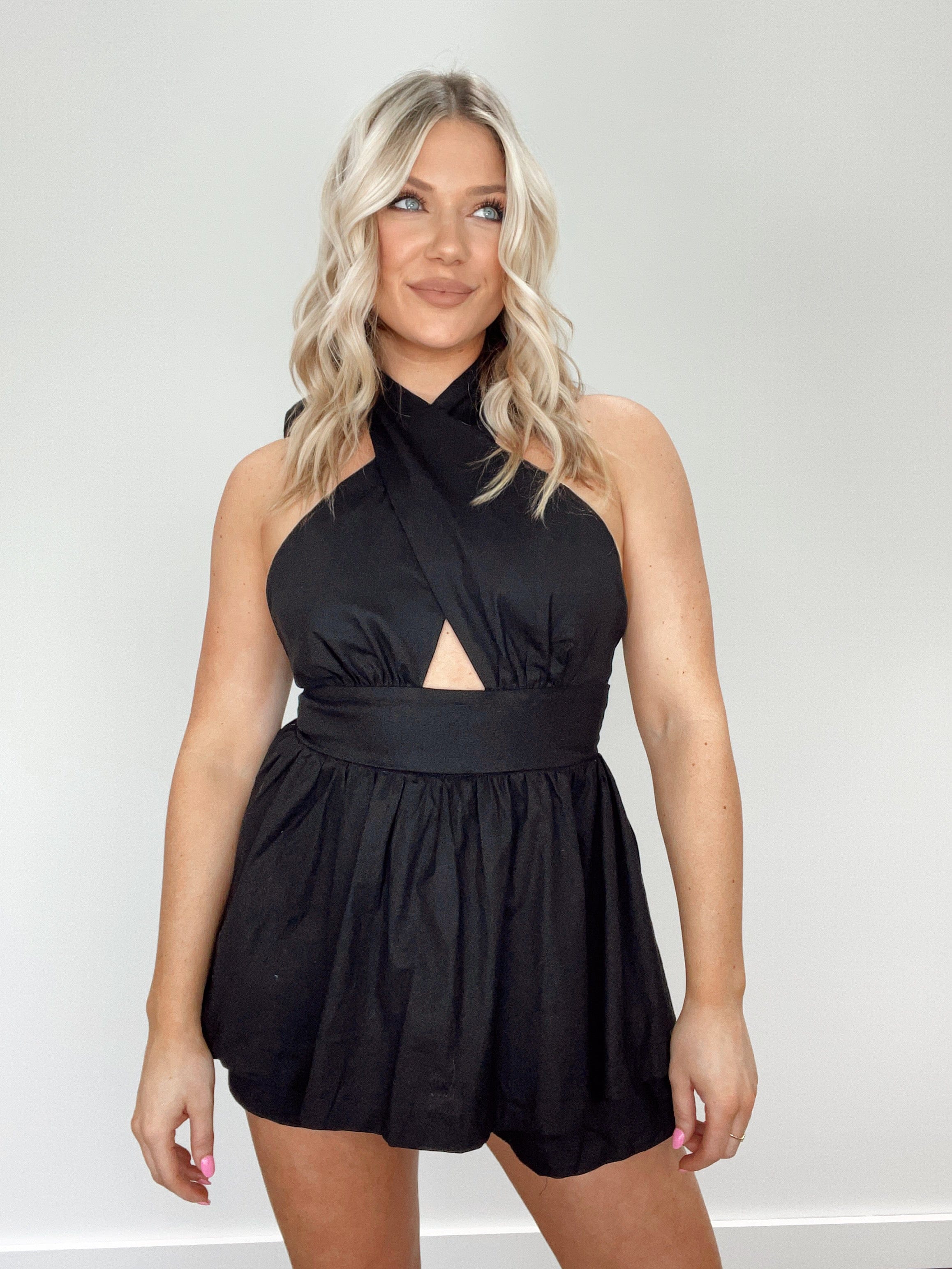 Elevate your wardrobe for special event days with the Girls Night Out romper. Featuring sophisticated linen fabric, a tie halter neck, front cutout detail, layered shorts, and a soft, minimal stretch fabric, this chic, stylish piece is perfect for bridal and bachelorette events, or as a wedding guest. The back zipper closure ensures a secure fit. Exude elegance with an exclusive style.