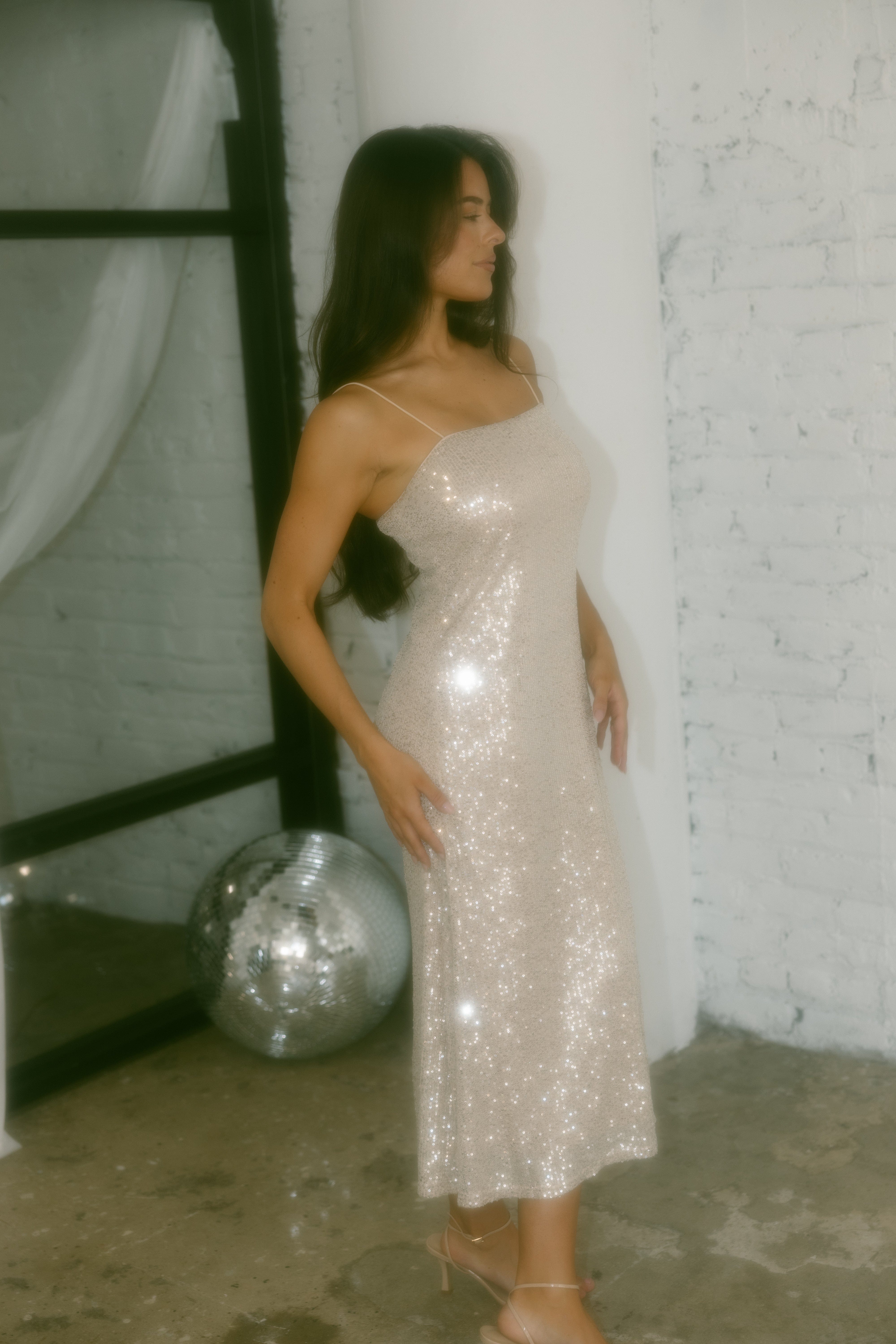 Be the center of attention with our Glamorous Countdown Dress. Featuring a side zipper closure and stretchy elastic straps, this maxi dress is both comfortable and stylish. The eye-catching sequin design adds a touch of glamour to any special occasion. Look and feel fabulous in this must-have dress.