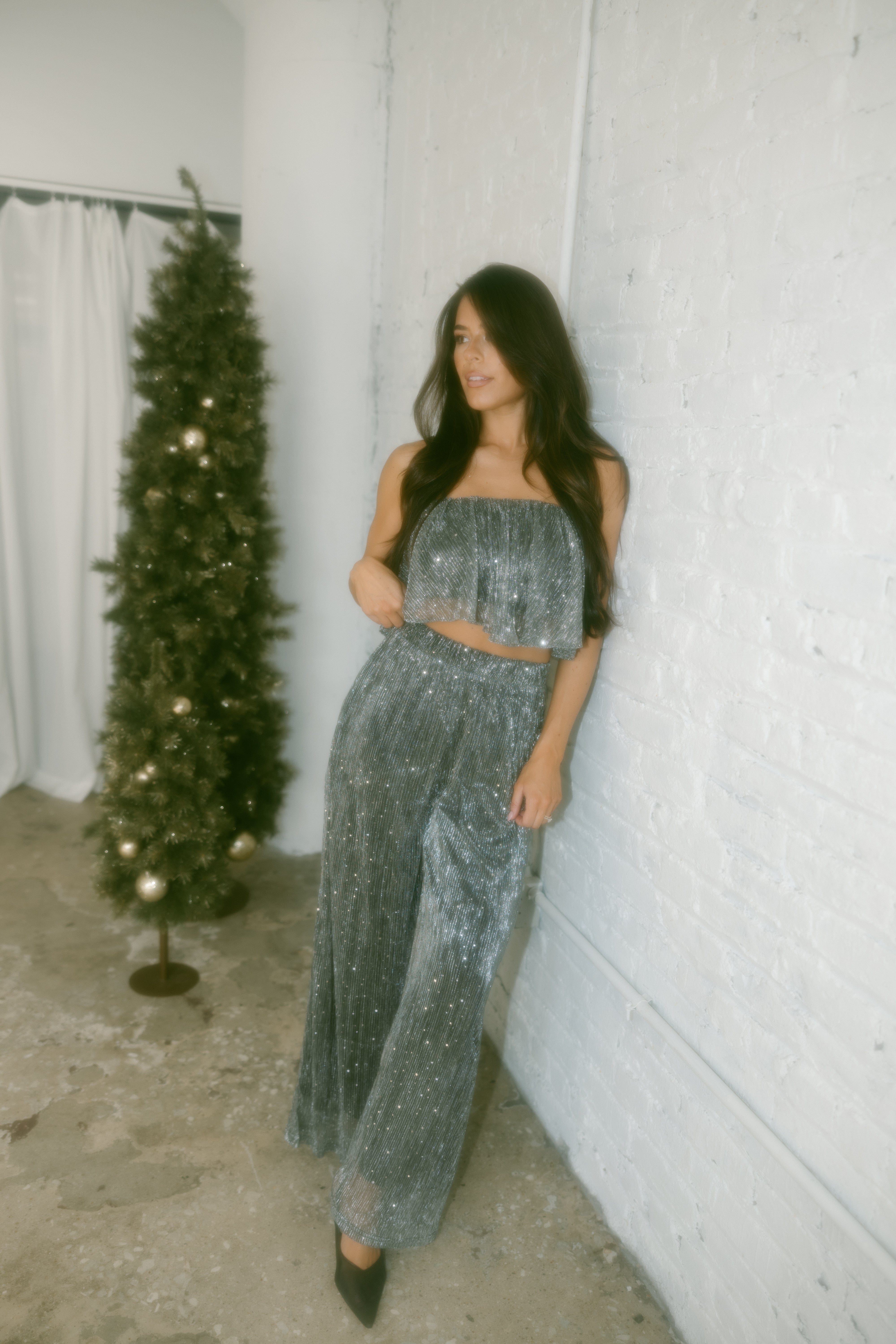 Introducing our Glistening Vibes Pants, perfect for the holiday season! These pants feature a wide leg design and an elastic waistband for a comfortable fit. The shimmering detail adds a touch of glamour to any outfit, making you stand out with style. Embrace the festivities with these pants that are both trendy and functional.