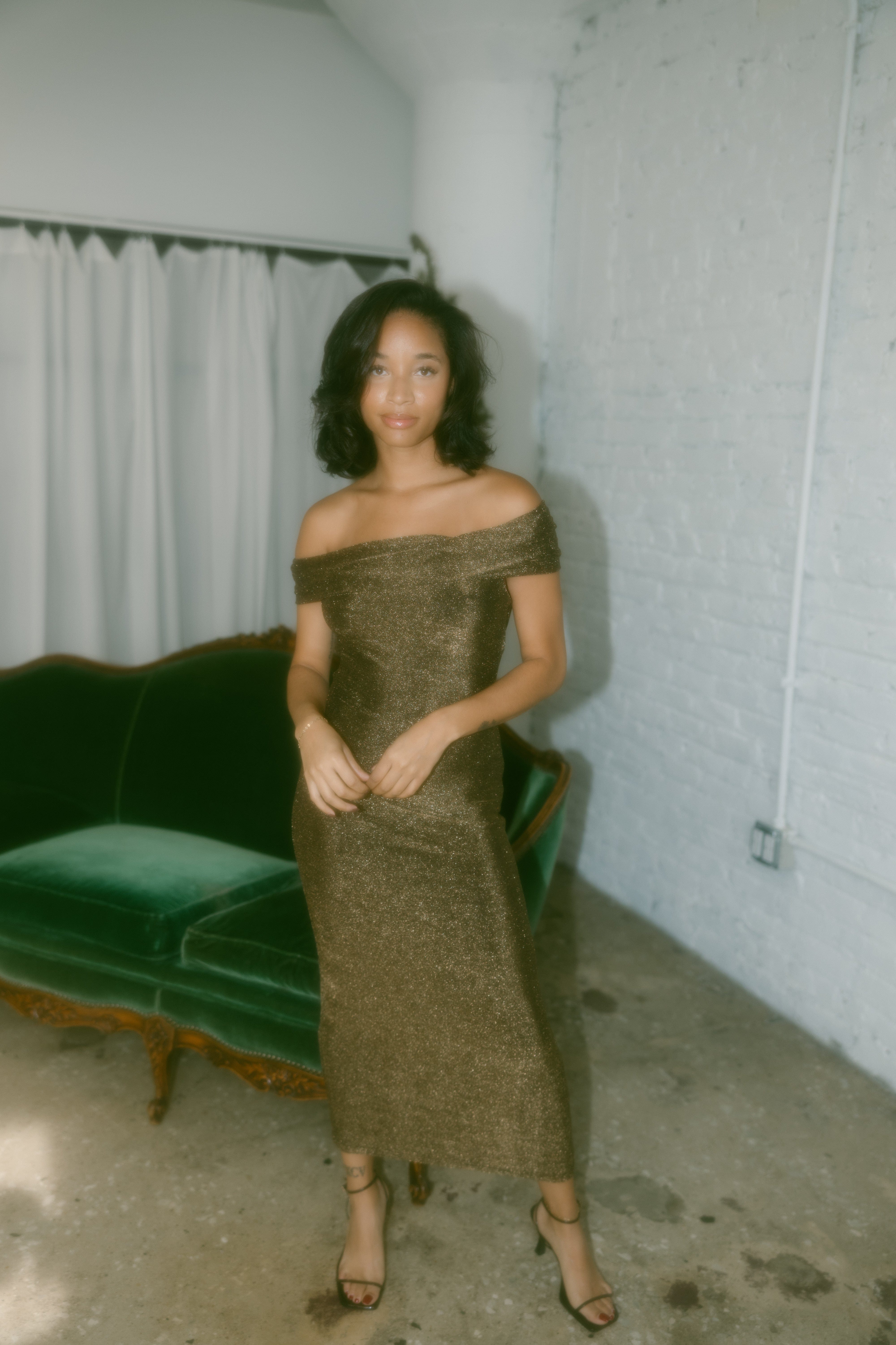 Expertly designed for the holiday season, the Golden Evening Dress is the perfect choice for your next formal event. Made with stretchy material, this midi dress offers a comfortable and flattering fit. The off shoulder design adds a touch of elegance, while the shimmering details are sure to make a statement. Ring in the new year in style with this stunning dress.