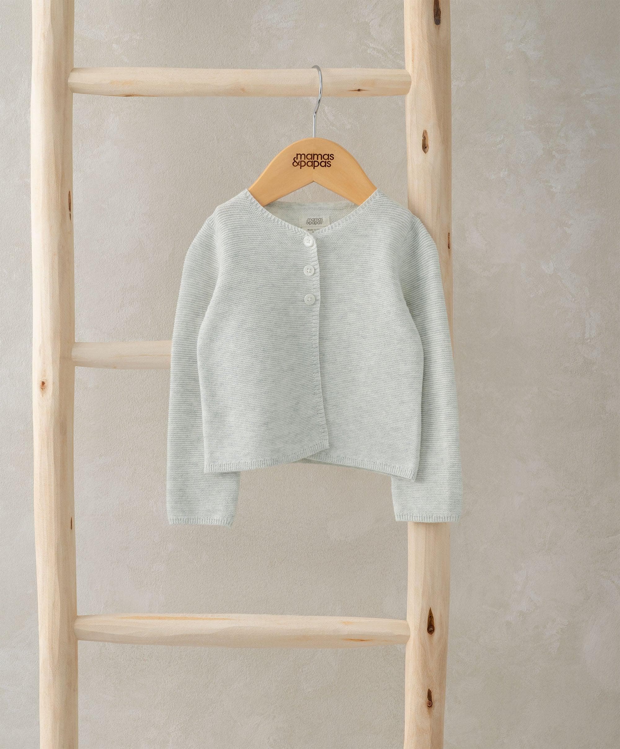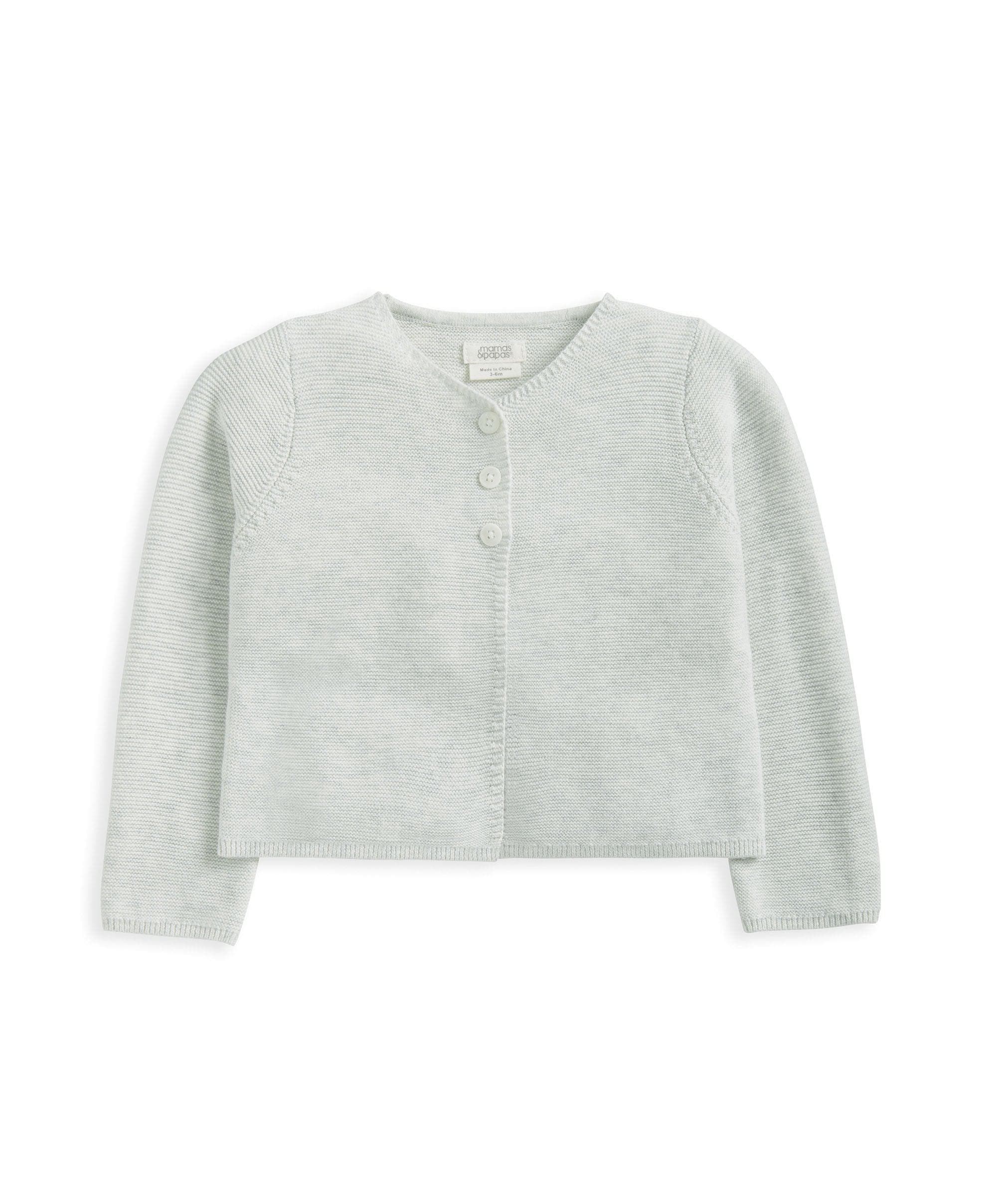 This soft grey knitted cardigan will keep them warm and cosy. Front opening complete with button fastening.