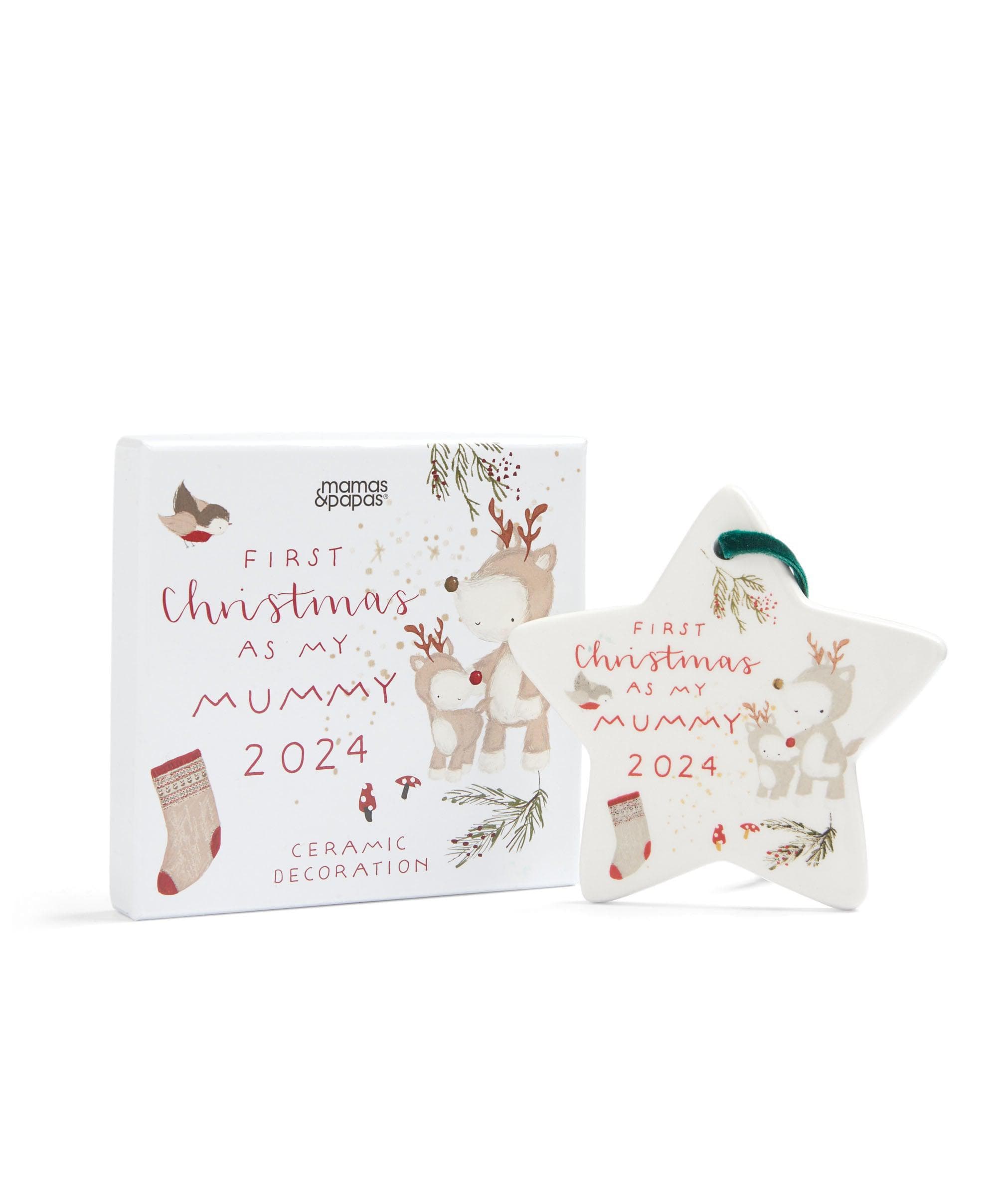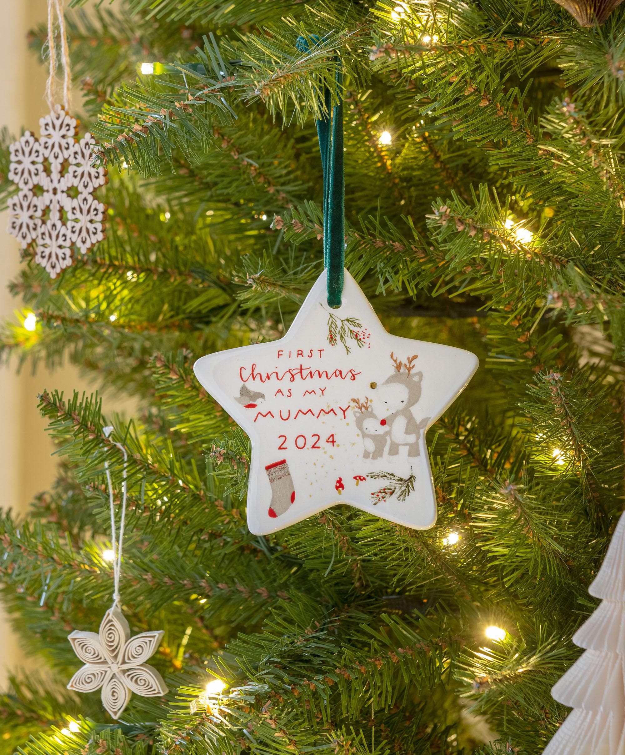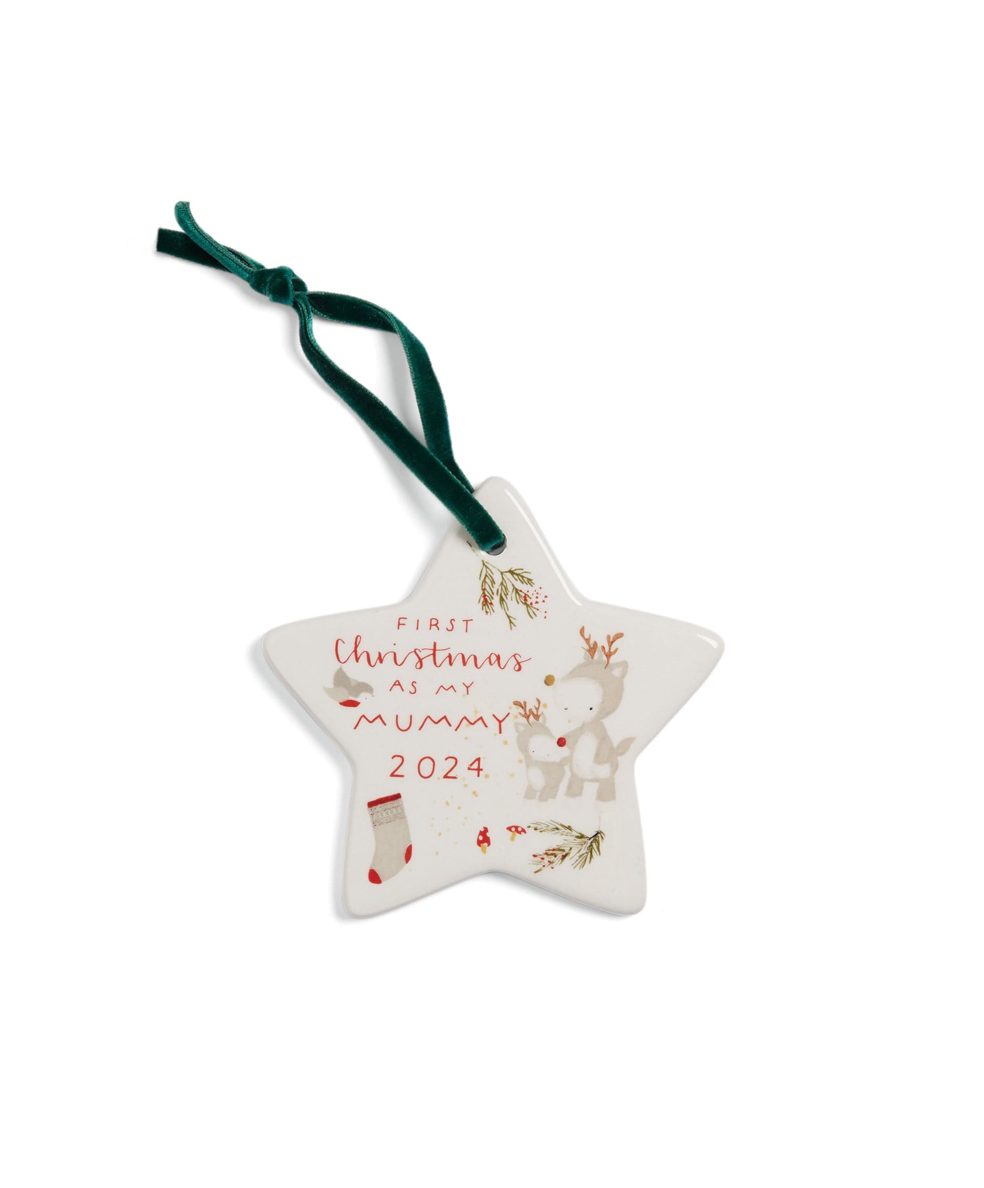 Brand new product for 2024, our ceramic hanging decoration celebrates mummy's first Christmas! With the year included, green velvet hanging ribbon and featuring our reindeer character on a white base, it's a beautiful keepsake that comes in a decorative gift box.
