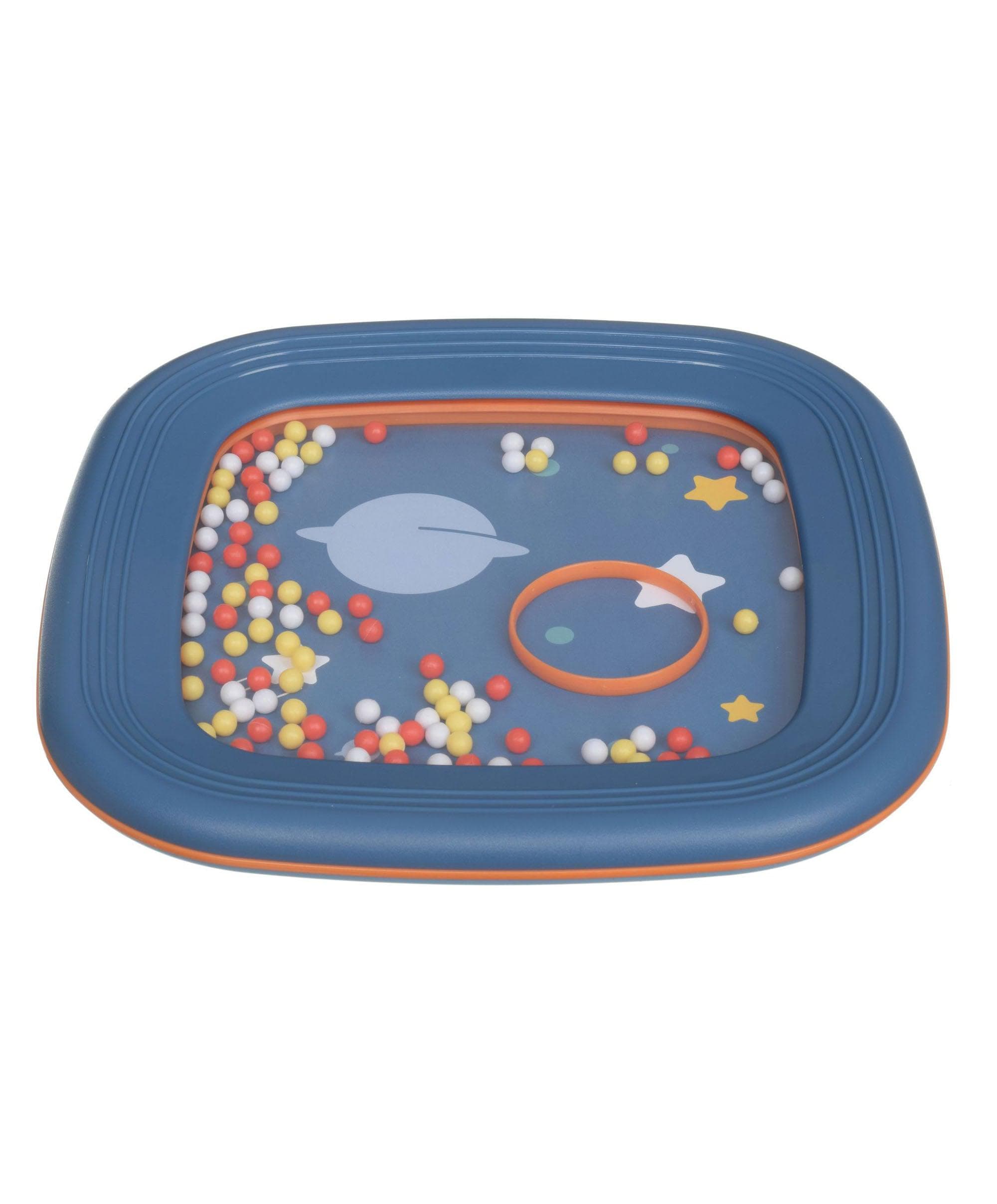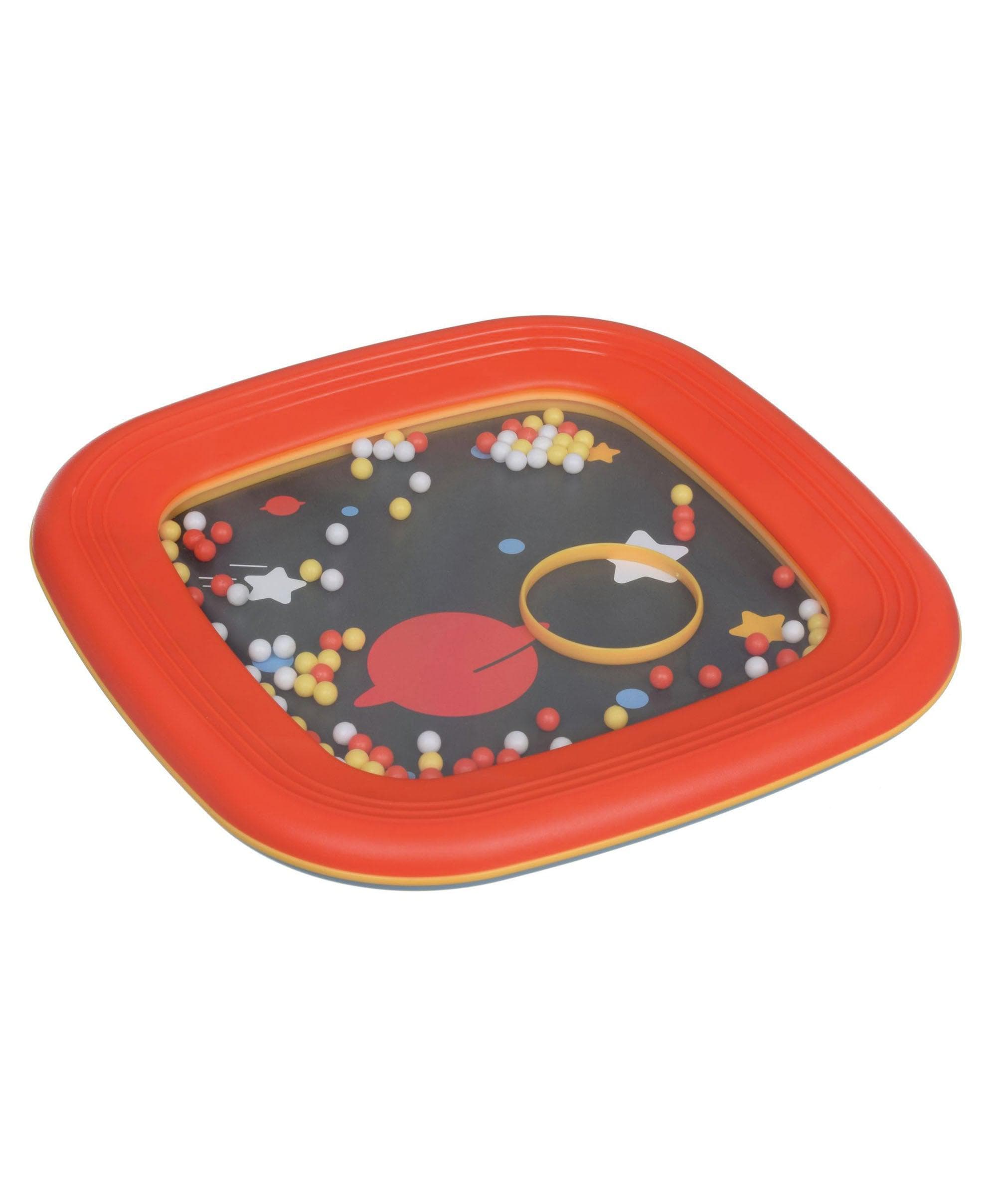 Featuring a fun space theme and primary-coloured beads, little ones are encouraged to reach out and tap the drum. Not only will they delight in the musical sounds they create from this first drum, they will also cause an exciting cascade of the beads within. There is also a fun hoop included to chase the beads around the space scene.