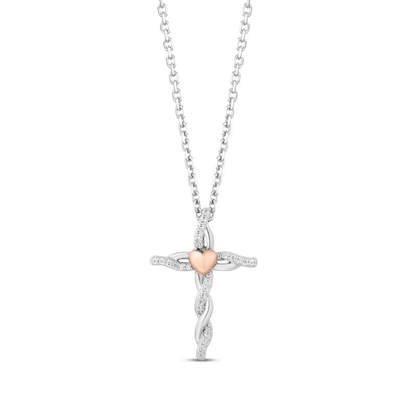 With love and faith, this diamond cross necklace speaks her truth. Crafted in sterling silver, this necklace features a 10K rose gold heart at the center of twisting round diamond-lined and polished ribbons in the form of a cross. With a total diamond weight of 1/10 carat, this pendant sways along an 16-inch cable chain with 2 inch extender that secures with a lobster clasp. © HMK. LIC.