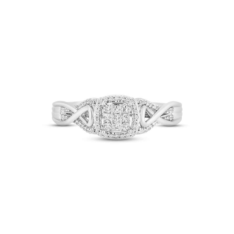 This pretty promise ring for her dazzles with an array of princess-cut diamonds. More sparkling round diamonds frame the multi-diamond center and shimmer on the sterling silver band, which features an elegant twist design. The ring has a total diamond weight of 1/4 carat. Each piece from the Hallmark Diamonds Moments collection comes with a small sentiment card for a personalized message. © HMK. LIC.