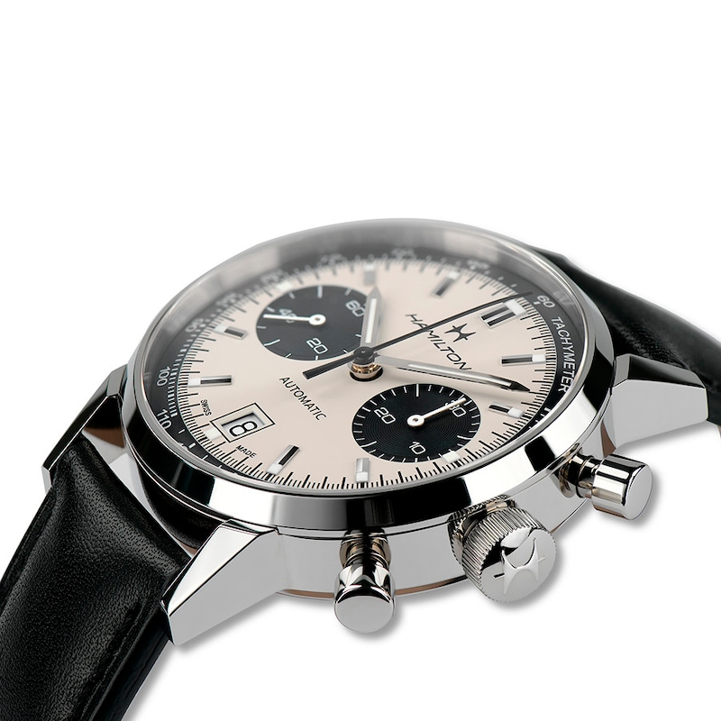 The Hamilton Intra-Matic Auto Chrono is a modern reworking of a 1968 signature piece that offers a sporty but classic look. Combining authentic 1960s appeal with the exclusive H-31 automatic movement, its distinctive panda dial is a guaranteed eye-catcher. A black tachymeter scale and a date window complete the dial. A sapphire crystal tops the 40mm stainless steel case, while a buckle secures the black leather strap.