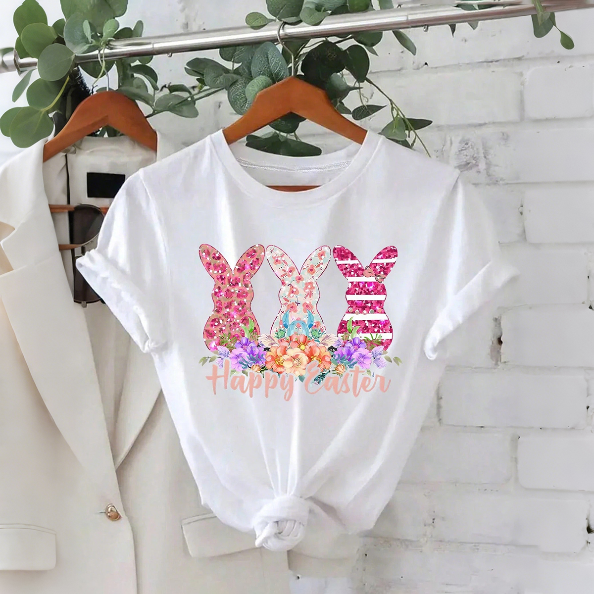 Happy Easter Printed Round Neck Short Sleeve T-Shirt 9515738