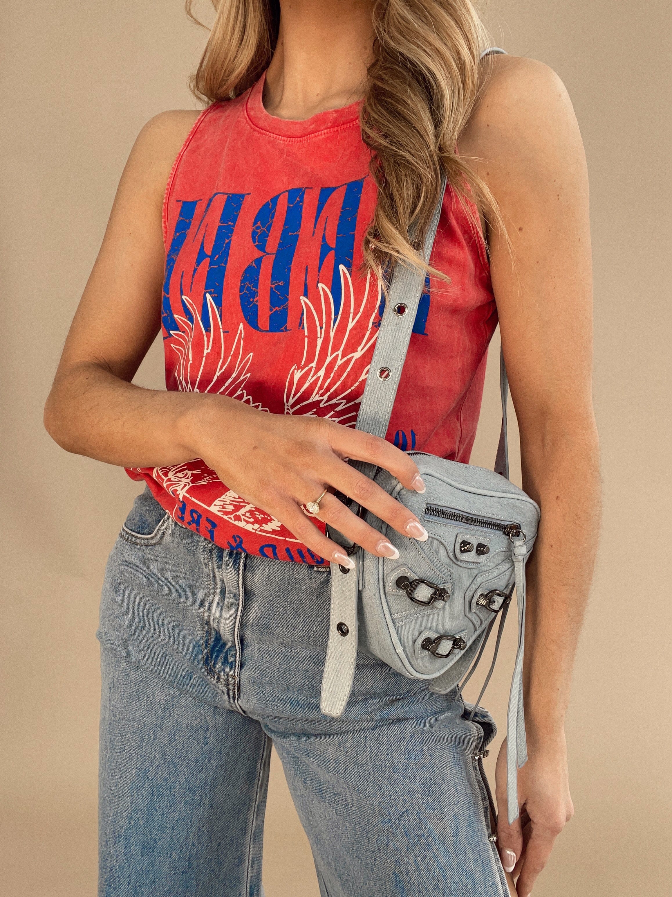 Make a statement with our Heartbreak Highway Bag. Featuring chic buckle details and a convenient zipper closure, this elevated denim bag is perfect for concerts, festivals, shopping, and beyond. The adjustable shoulder strap allows for customizable comfort, making it the ultimate trendy accessory for your spring and summer wardrobe.