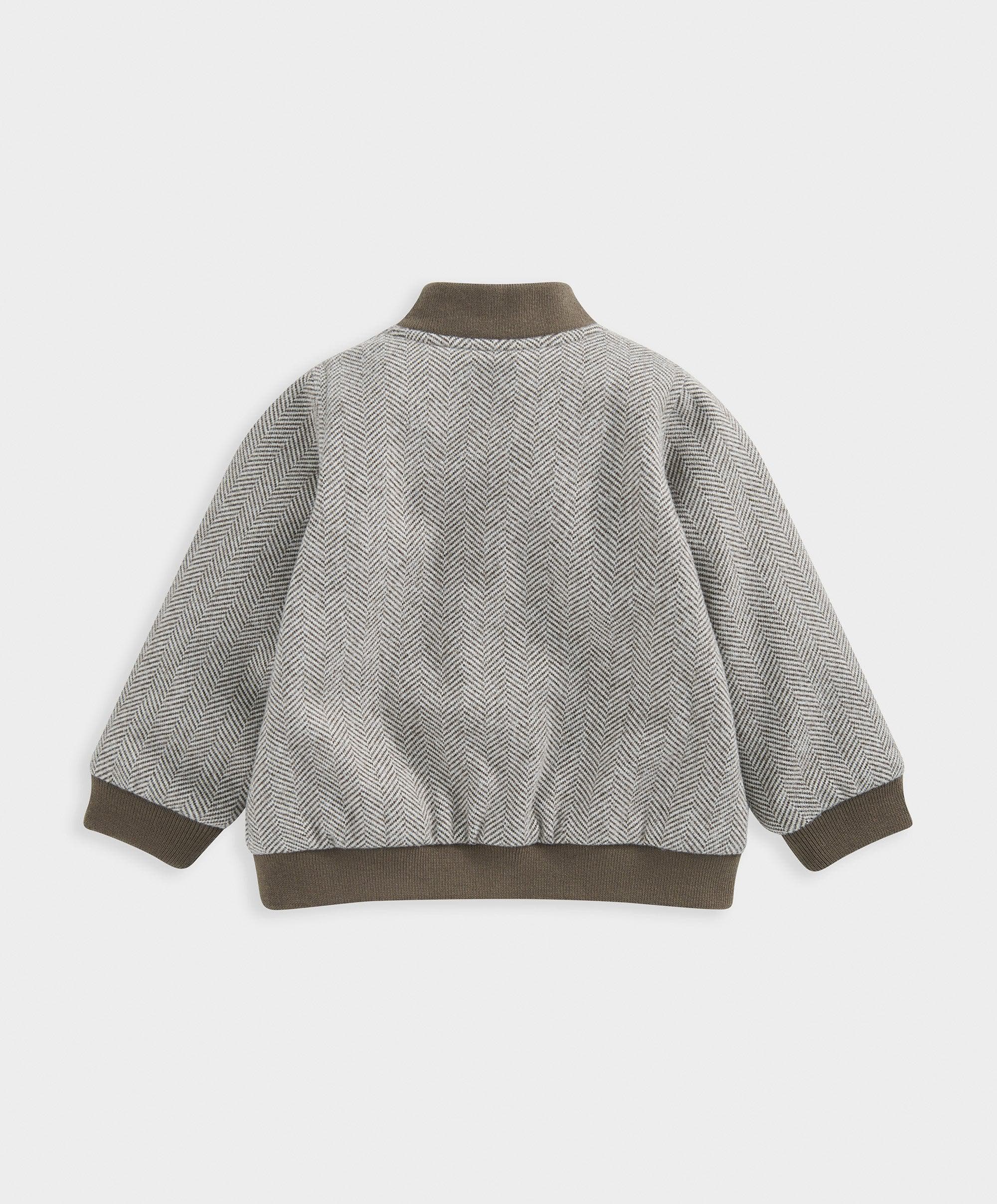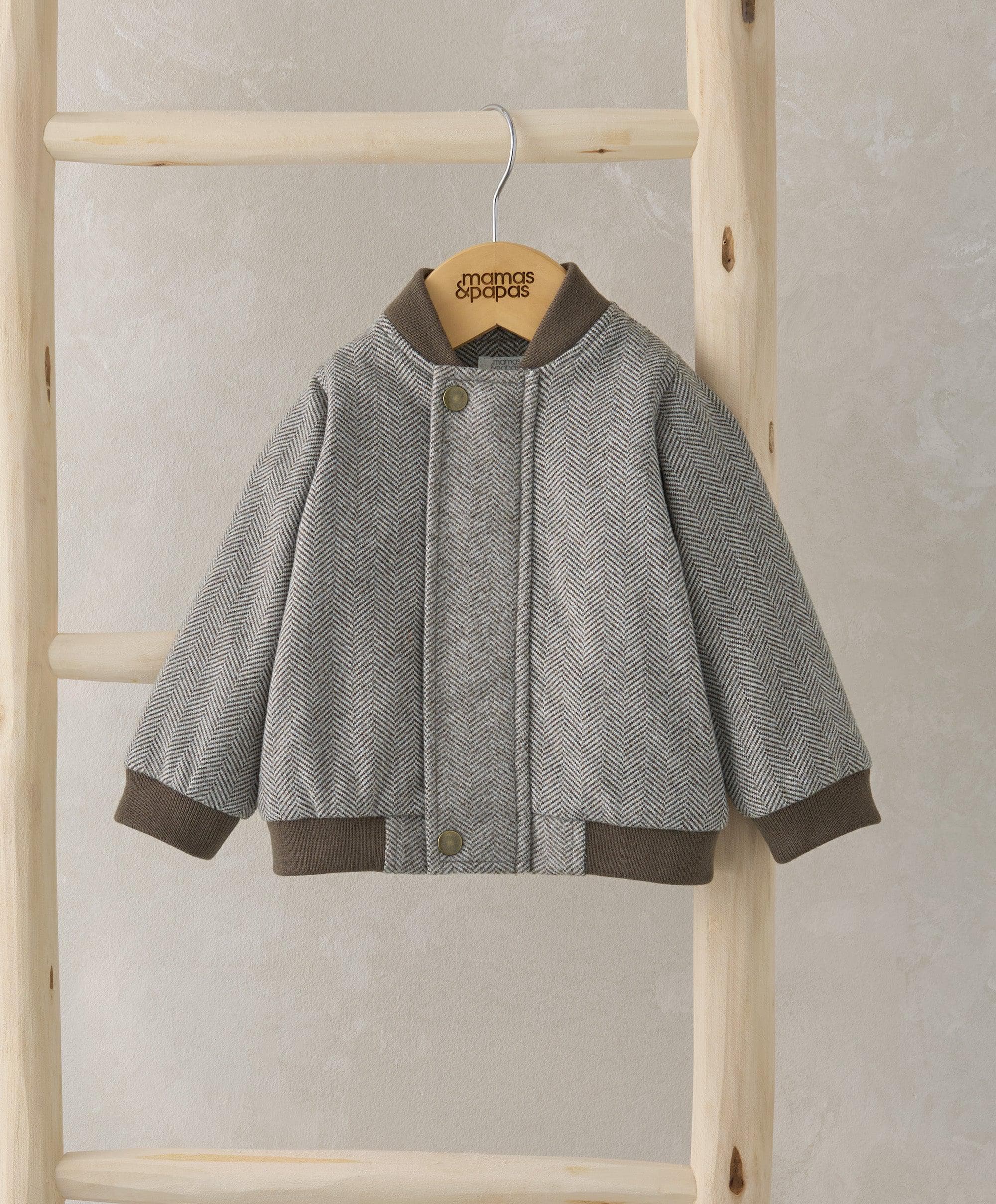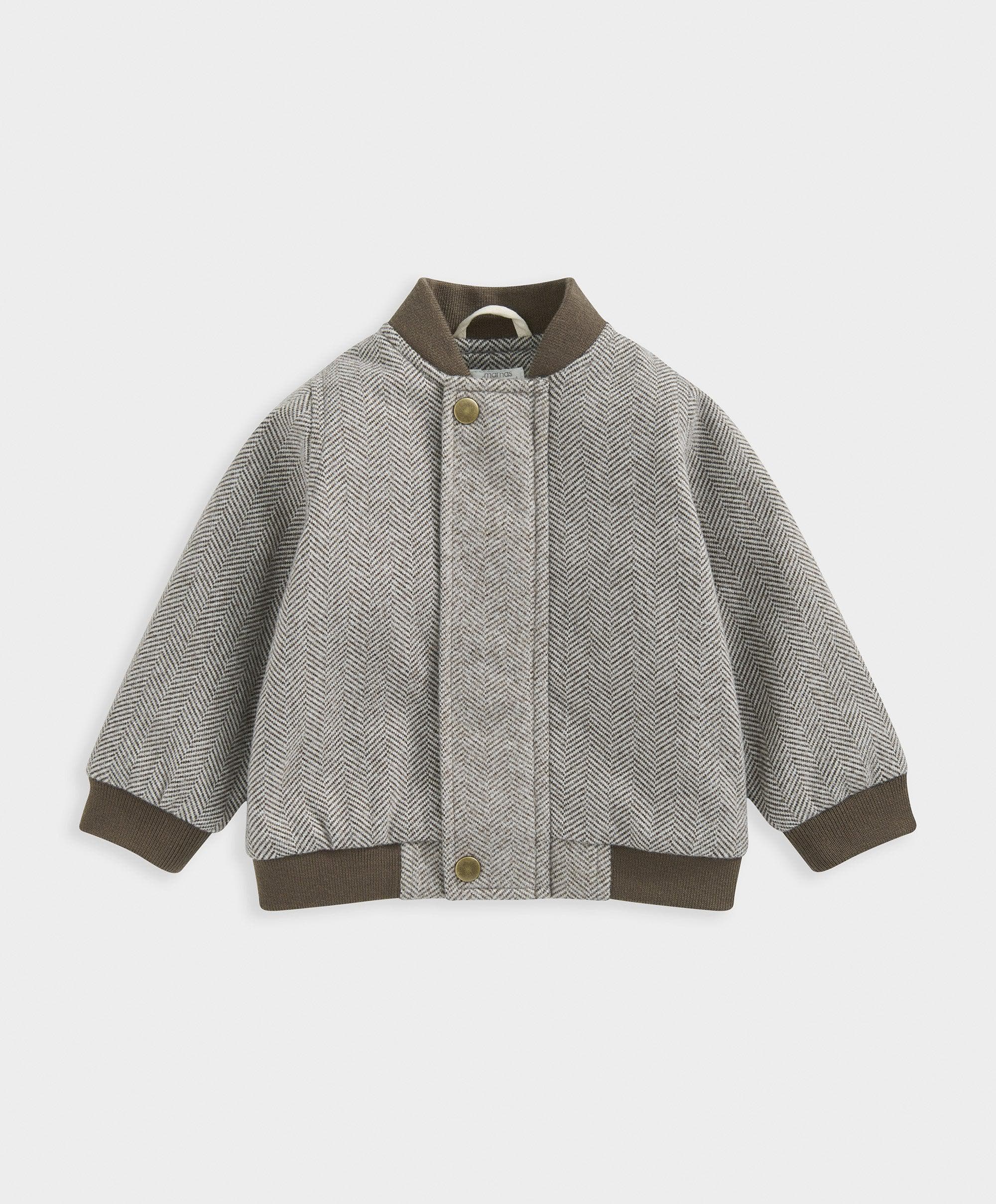 Boxy-shaped Herringbone jacket. With bagged out collar and deep cuff panels. Full button fastening