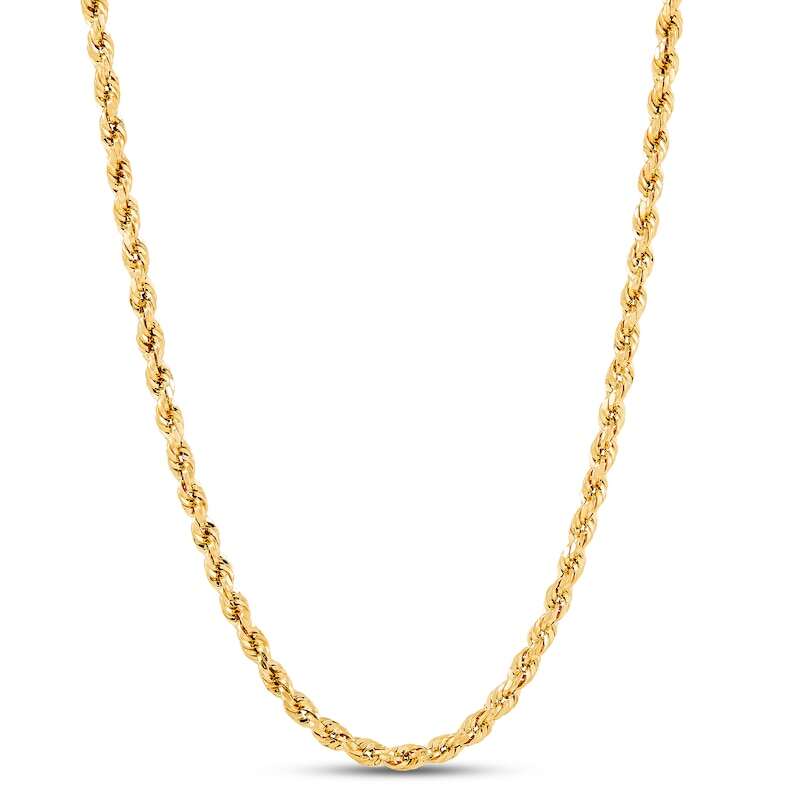 This chain features a 2.9-3.0mm hollow rope chain crafted in classic 14K yellow gold. The 22-inch chain secures with a lobster clasp.