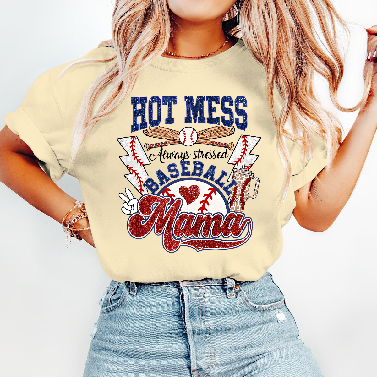 Hot Mess Always Stressed Baseball Mama Printed Round Neck Short Sleeve T-Shirt