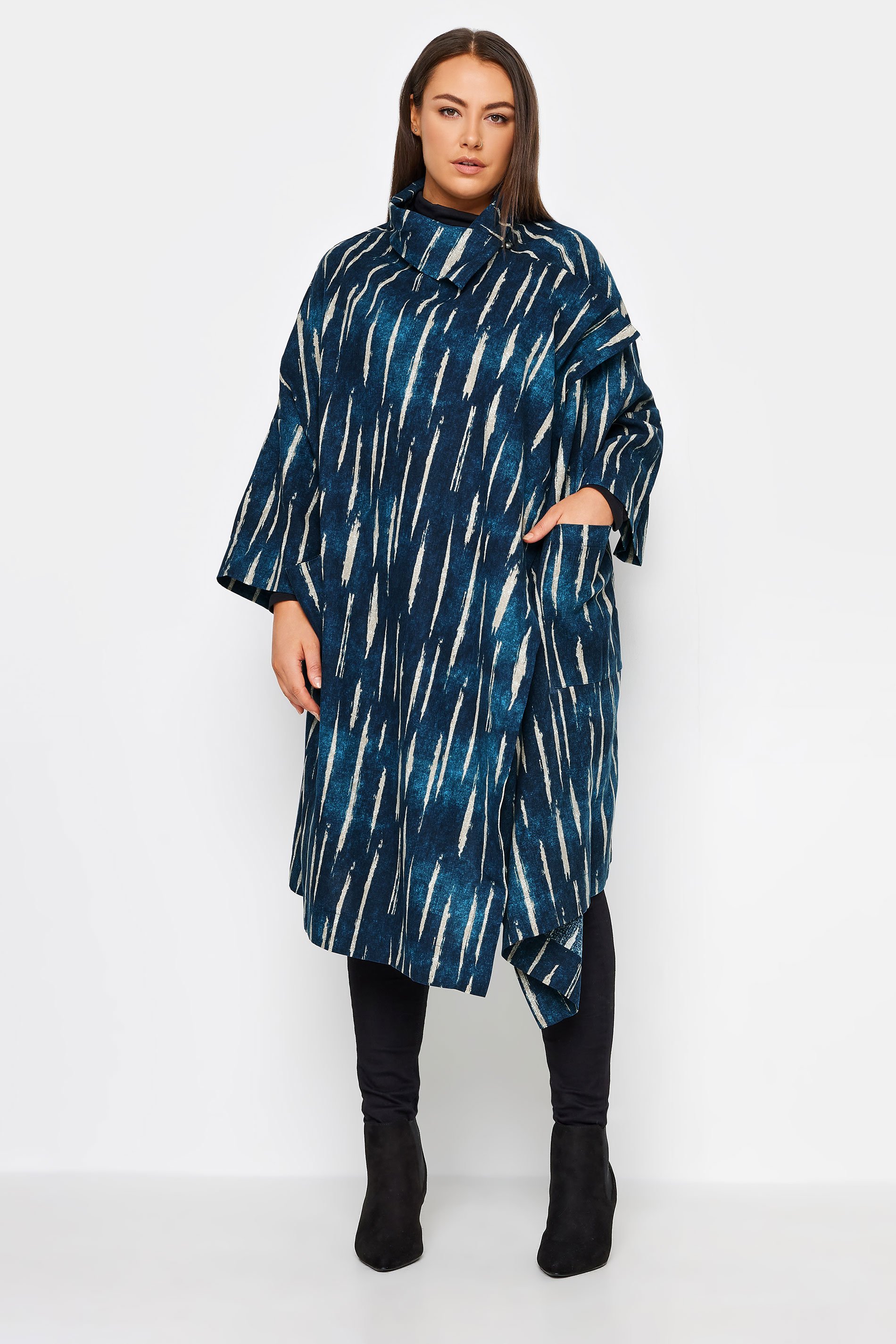 Elevate your style with the Navabi Navy Blue Stripe Cape Jacket. Combining classic black stripes with a modern cape style, this jacket is a versatile and elegant addition to any outfit. Perfect for both formal occasions and casual ensembles.