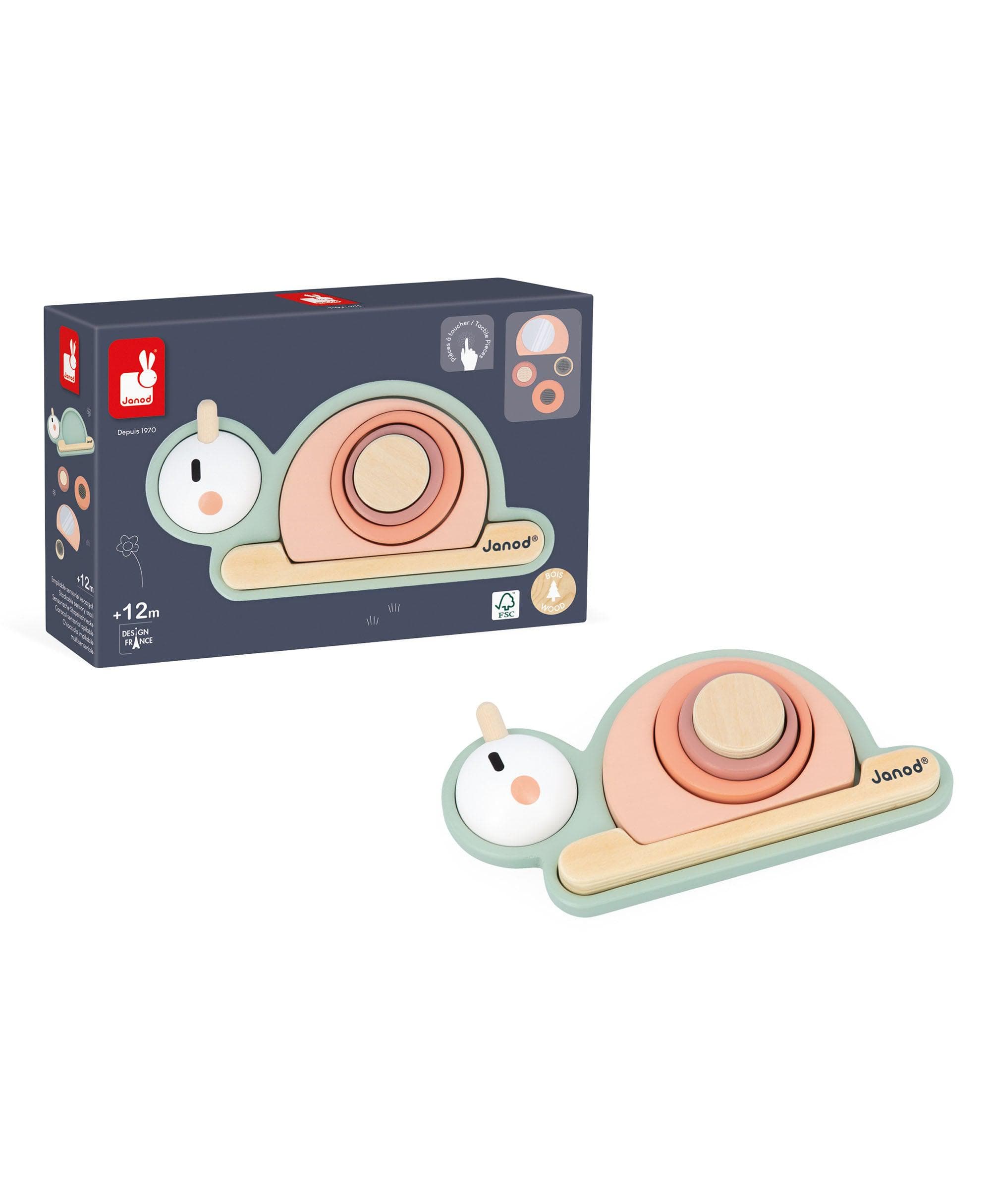 The spiral shell of this snail hides many surprises! Under each block is a different texture! This game consists of a base and 6 pieces to stack: 4 sensory blocks (one block with a mirror and 3 blocks with different silicone reliefs) without forgetting the head and body of the snail. This toy is ideal for your child to develop their sense of touch and fine motor skills.