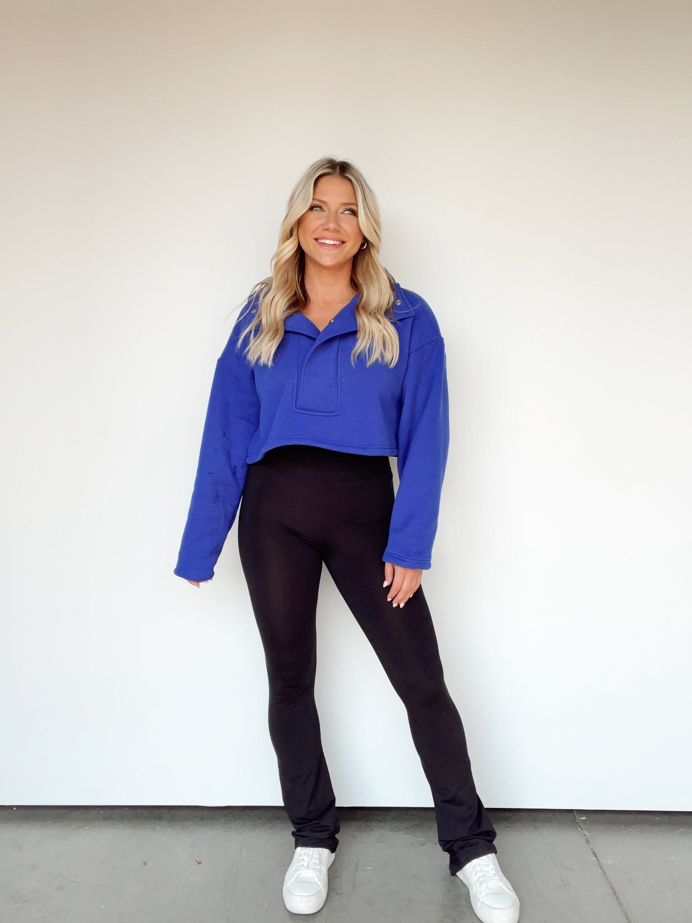 Crafted from a sumptuous blend of soft, stretchy, and cozy fabric, our Keep Your Cool Sweatshirt is a luxurious addition to your athleisure wardrobe. Featuring a collared neckline, button closures, and a cropped fit, you can wear it in total comfort for lounging at home, running errands, or any activity in between. Choose a vibrant pop of color to give it that added flair - with sherpa lining, you can't go wrong.