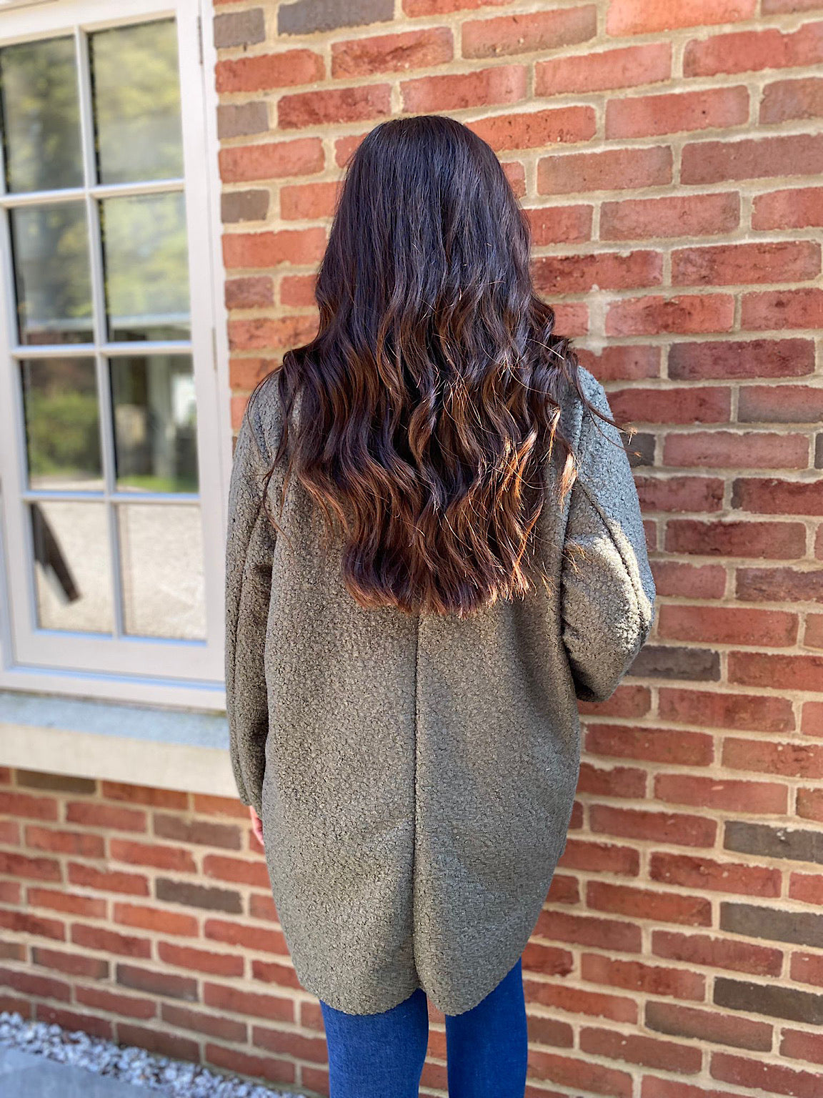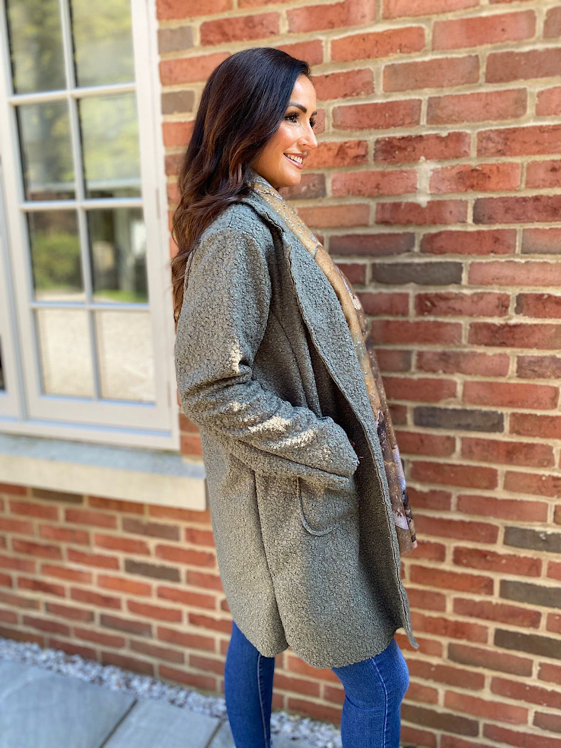The Boucle Button Up Jacket Gigi offers a sophisticated look with everyday practicality. Crafted with a soft boucle fabric, this jacket is comfortable and stylish. It features two front pockets, providing plenty of space for all your essentials.