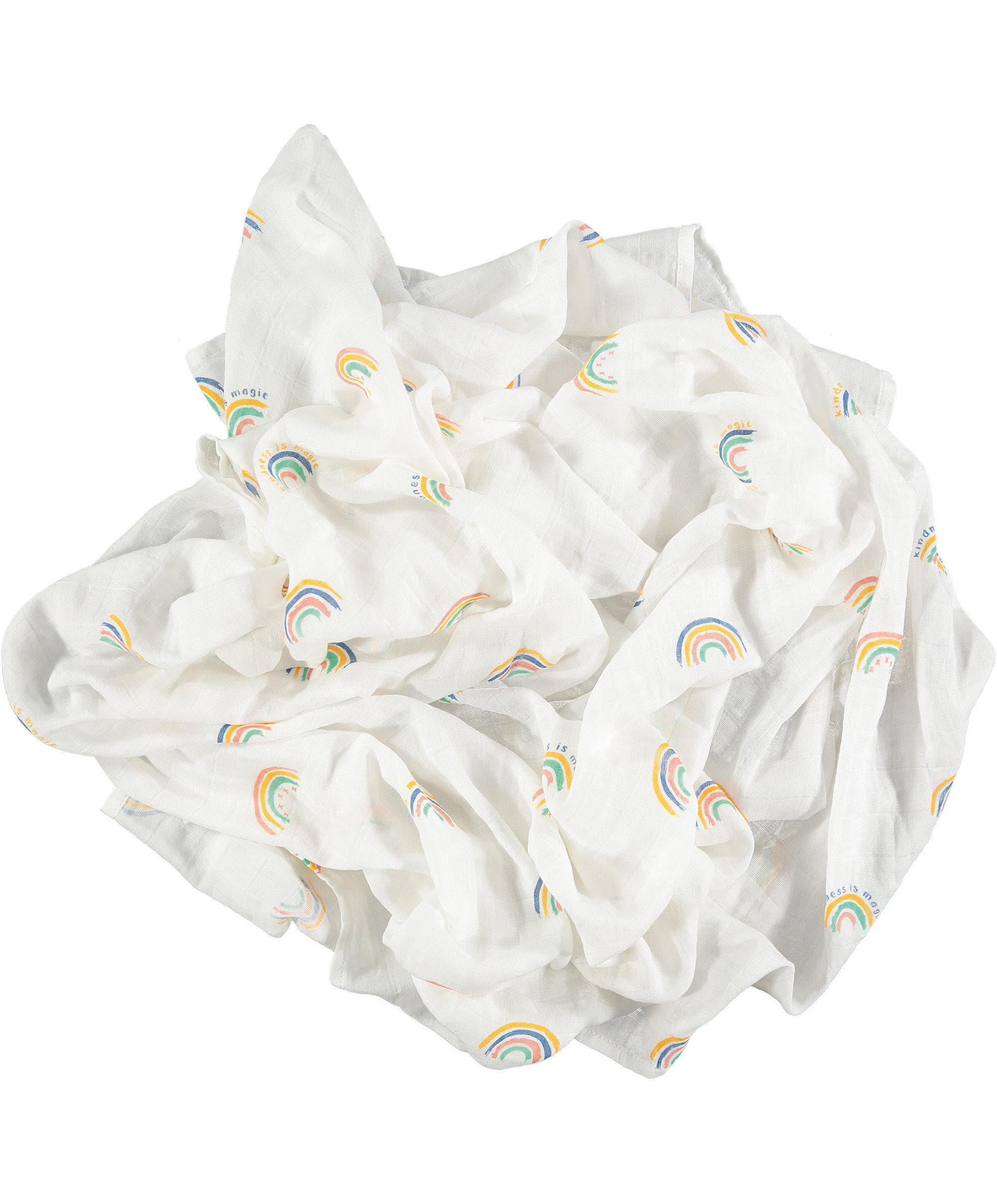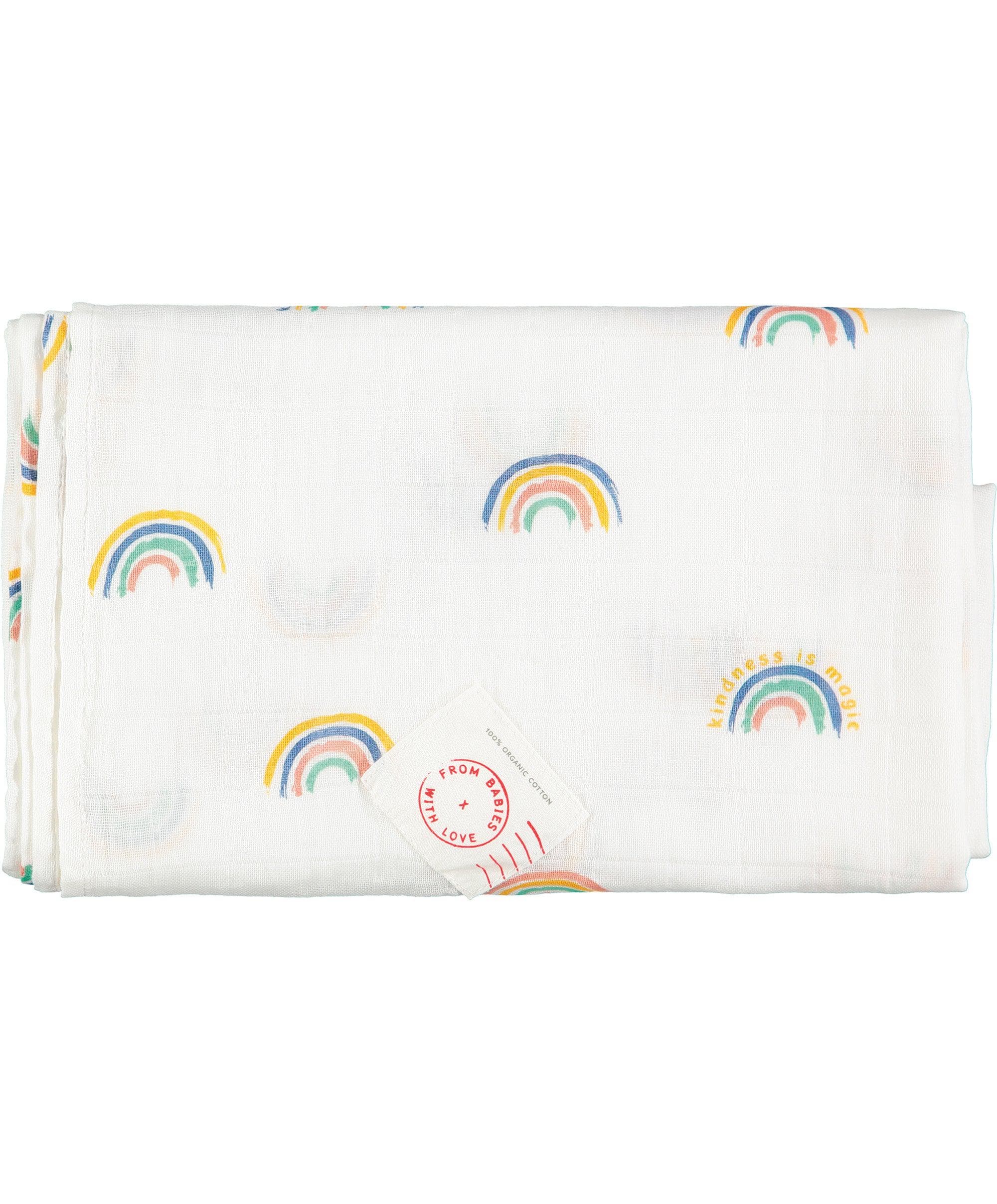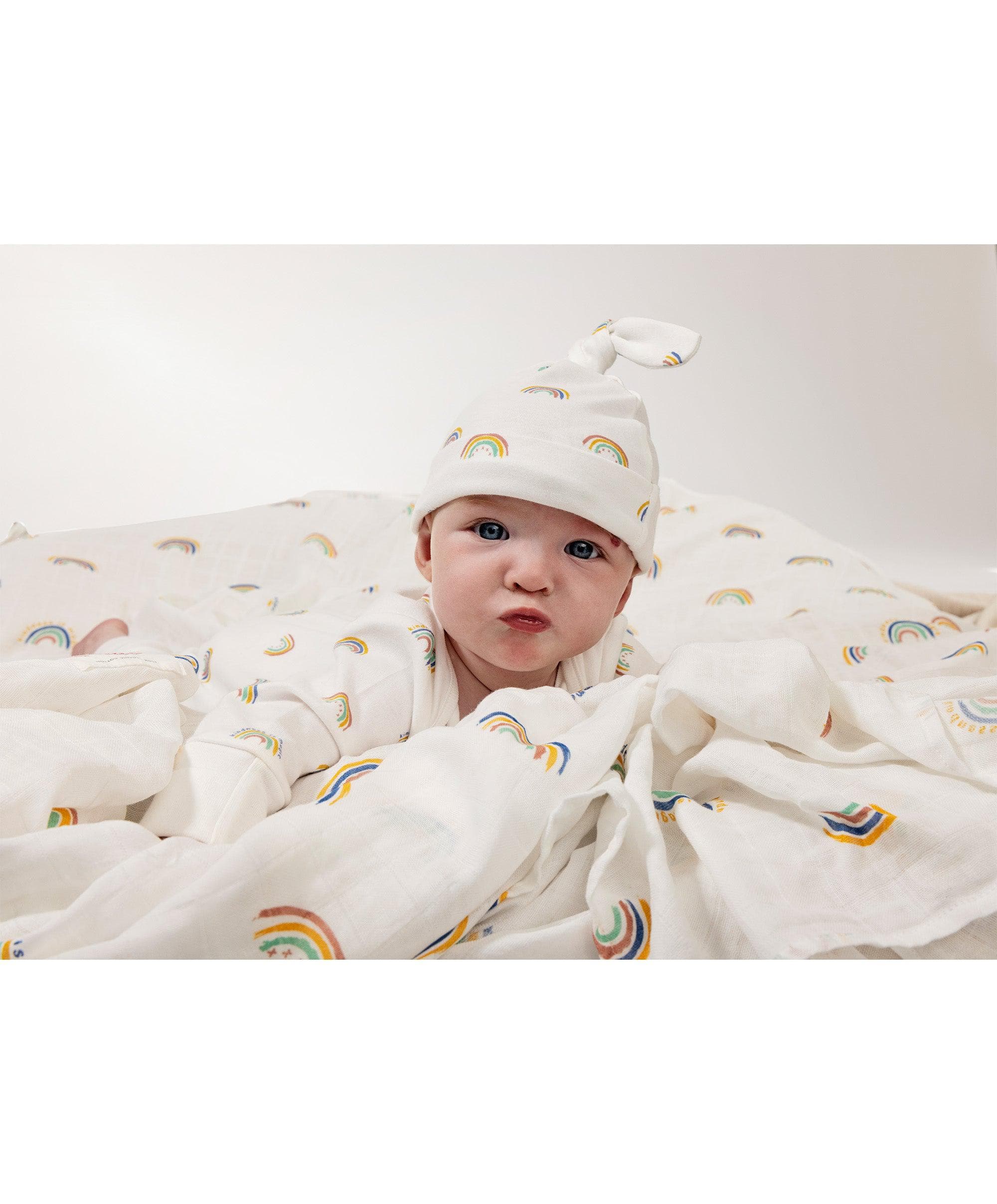 A beautiful and colourful all over rainbow print, this gender-neutral organic gift set includes an organic knot hat and large muslin swaddling shawl.