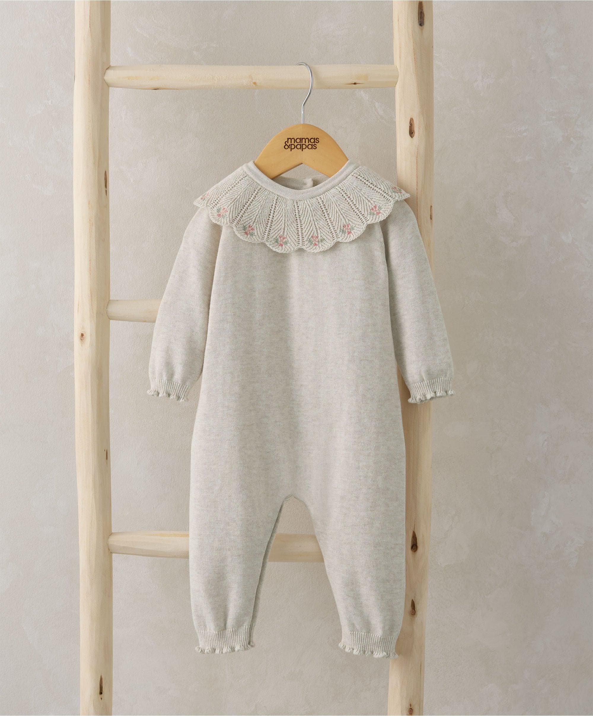 Knitted collar embroidered romper suit. Long-sleeved in knitted texture, scallop frill collar with knitted stitch flower detail, ribbed cuffs. Concealed popper fastening on gusset.