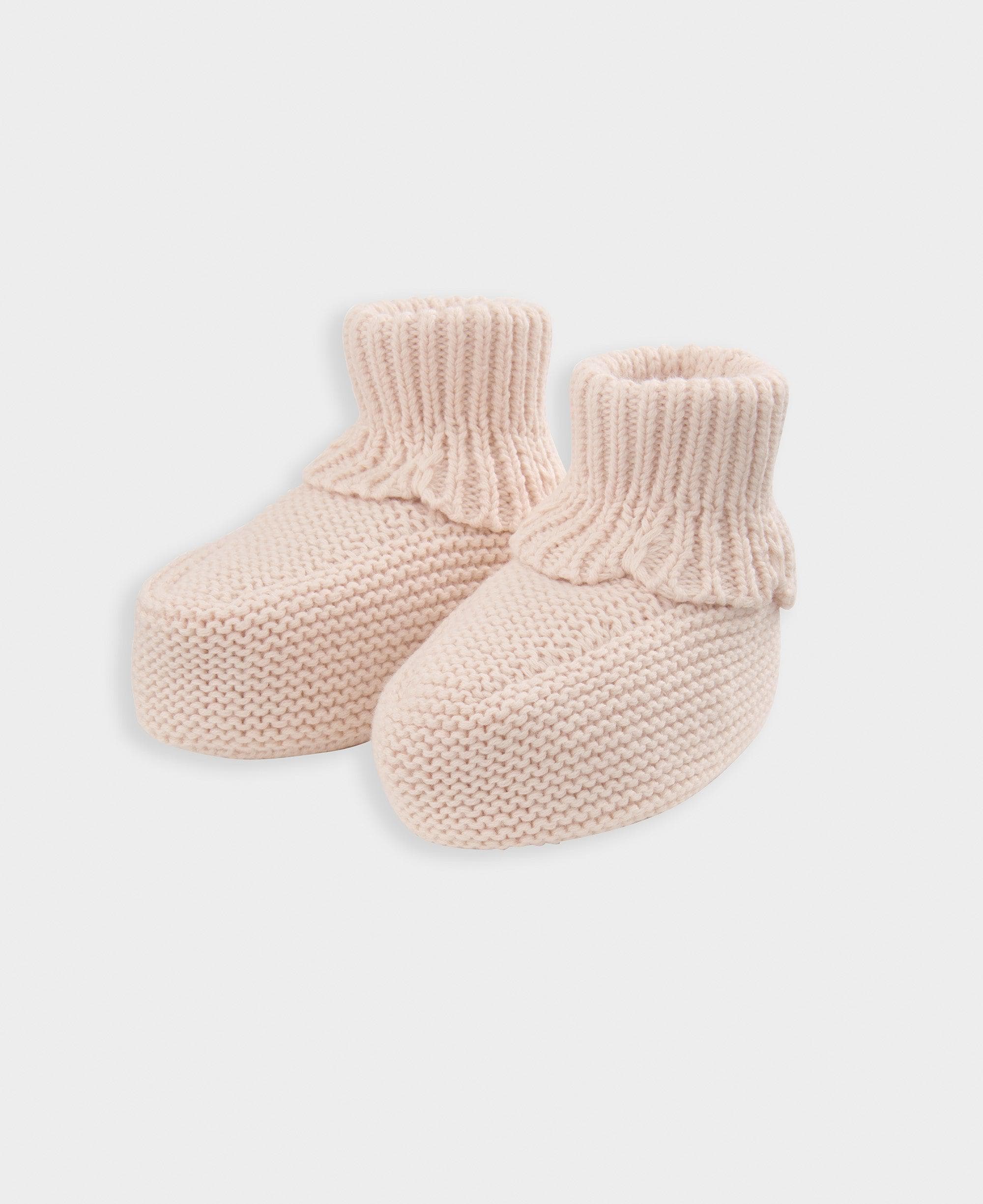 Pink knitted booties. With scallop trim and ribbed cuffs.