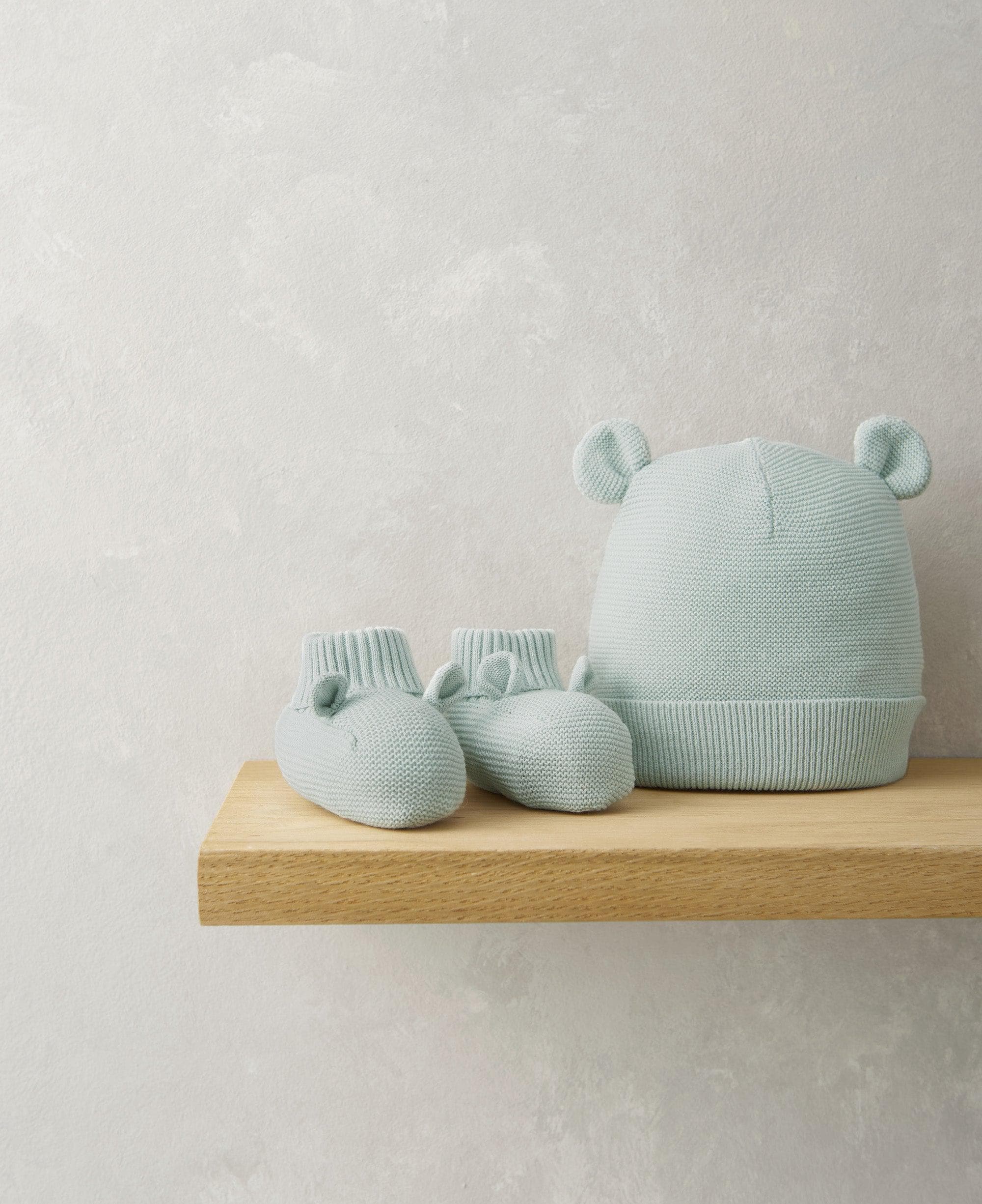 Super-cute accessories set to keep them cosy, stylish and looking adorable! Includes green knitted beanie hat with adorable ear detail and mathing booties. 100% cotton.
