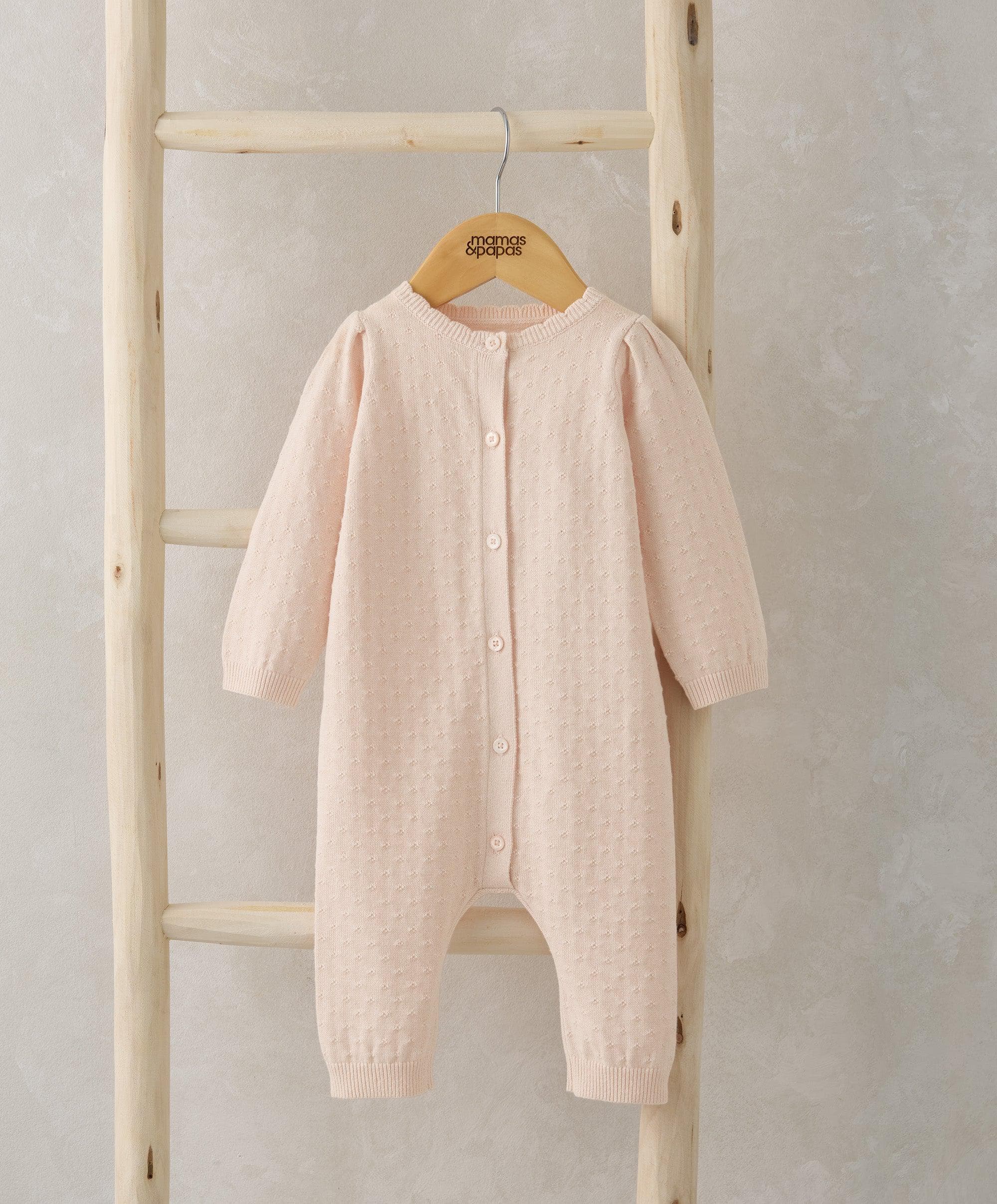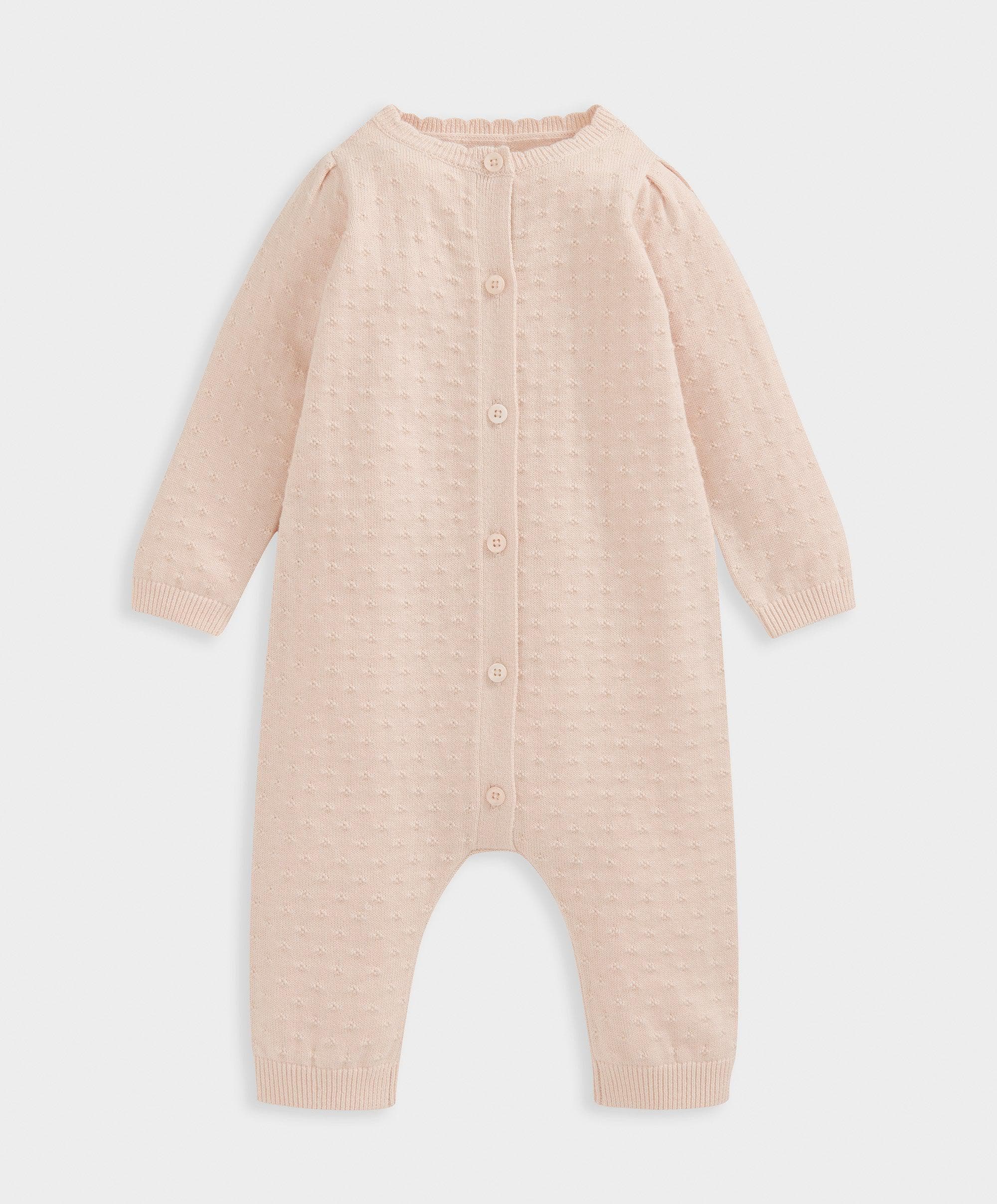 Long-sleeved pink knitted romper with puff sleeves. Frilled cuffs. Scalloped collar. Popper fastening on crotch. Button fastening down front.