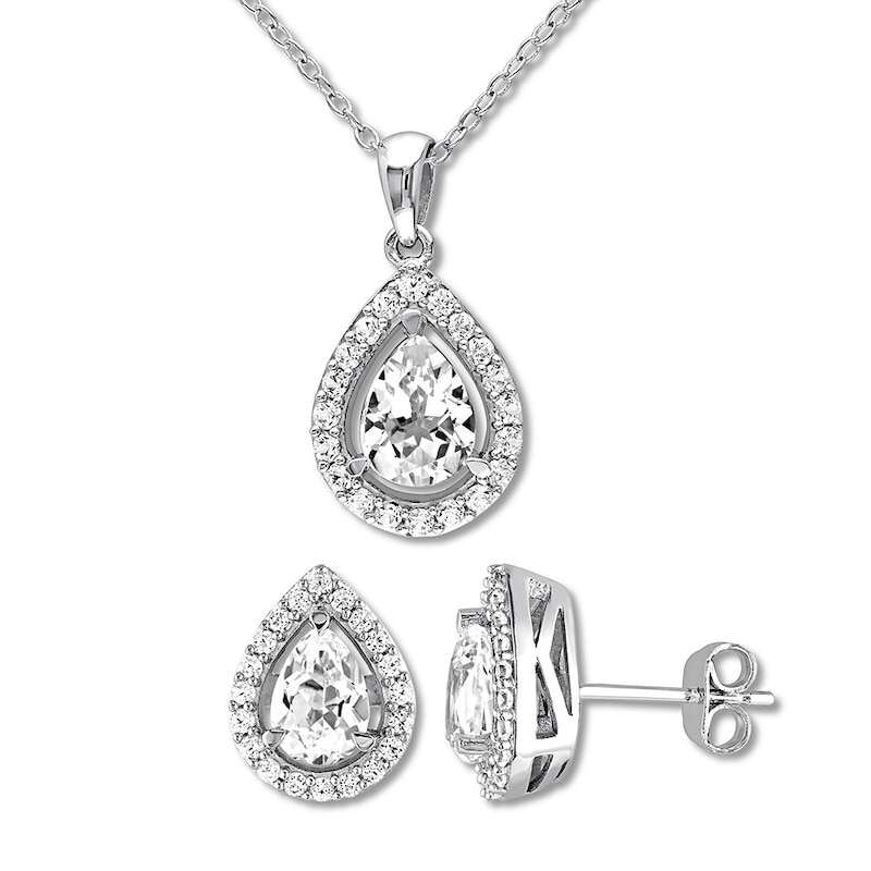 This splendid gift set for her includes a matching necklace and pair of earrings featuring dazzling pear-shaped, lab-created white sapphires. Frames of round lab-created white sapphires complete the look. The earrings secure with friction backs, and the 18-inch cable chain secures with a spring ring clasp. The set is crafted of sterling silver.