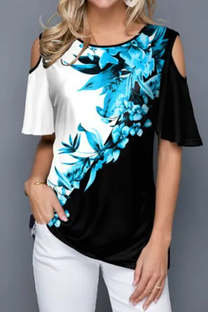 Leaf Flower Print T Shirt Cold Shoulder Short Sleeve Summer Casual Tee 159202