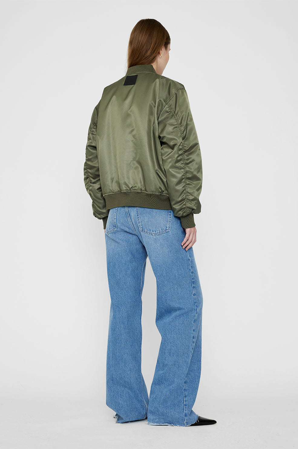 A traditional bomber jacket made from a durable, slightly padded 100% polyester shell with a subtle sheen. Features traditional flight jacket details including a bright orange interior lining, two front flap pockets, a zipped sleeve pocket, and ribbed knit trim at the neck, cuffs, and waistband.
