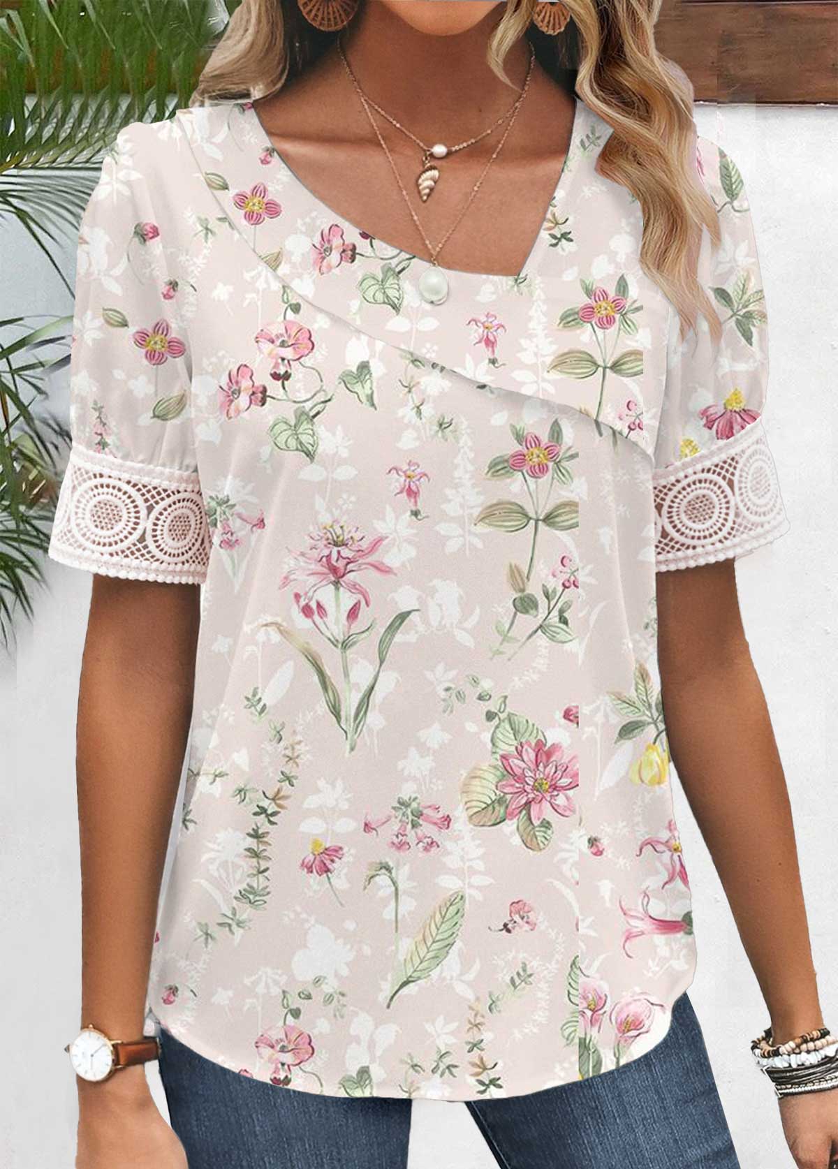 Light Pink Patchwork Floral Print Short Sleeve Blouse