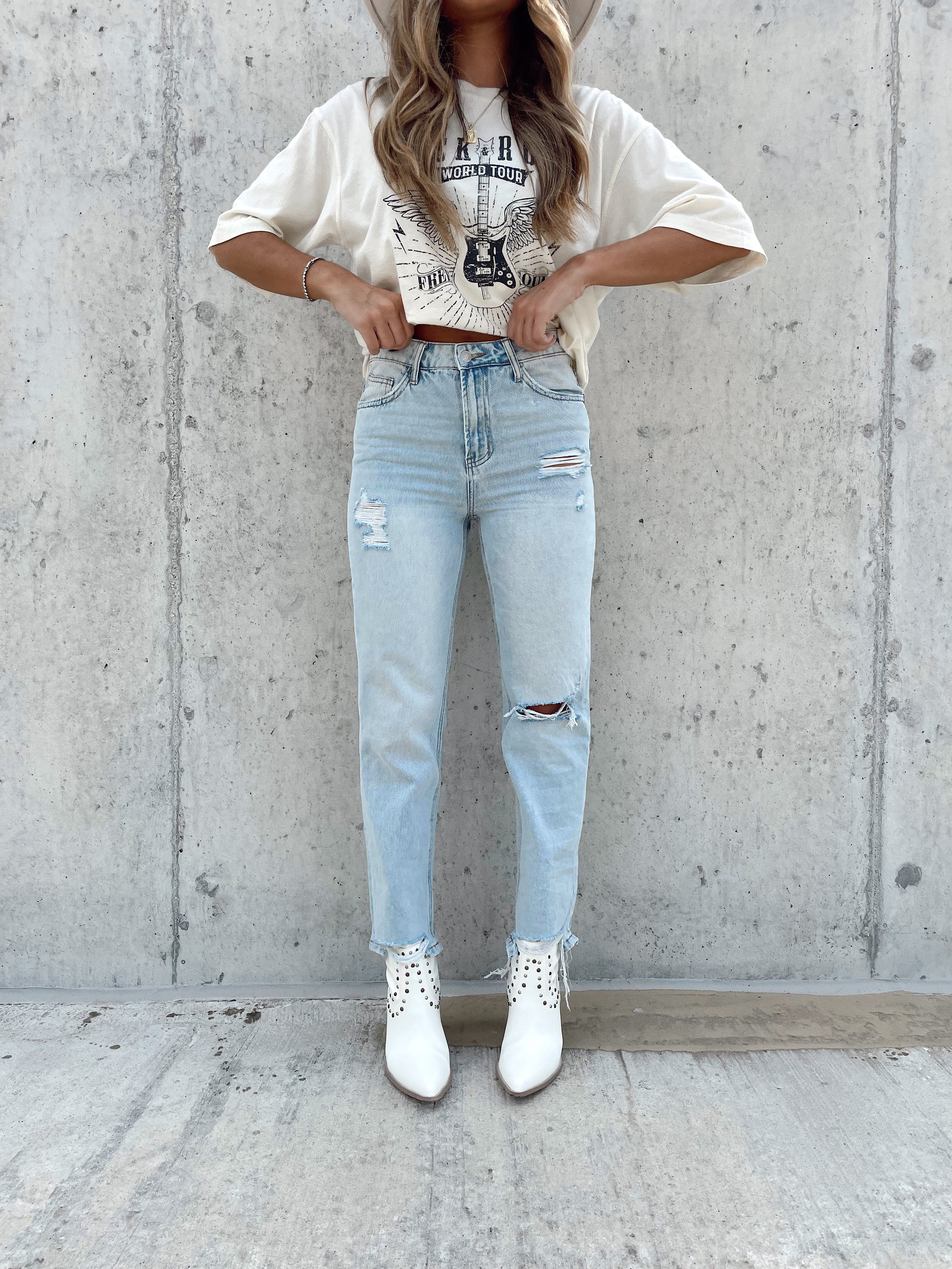 Feel confident in Lane 201's Light Wash Boyfriend Denim. The jeans feature the perfect boyfriend fit, some light distressing, a hole detail in one knee, and a distressed hem. These jeans fit big in the waistline.